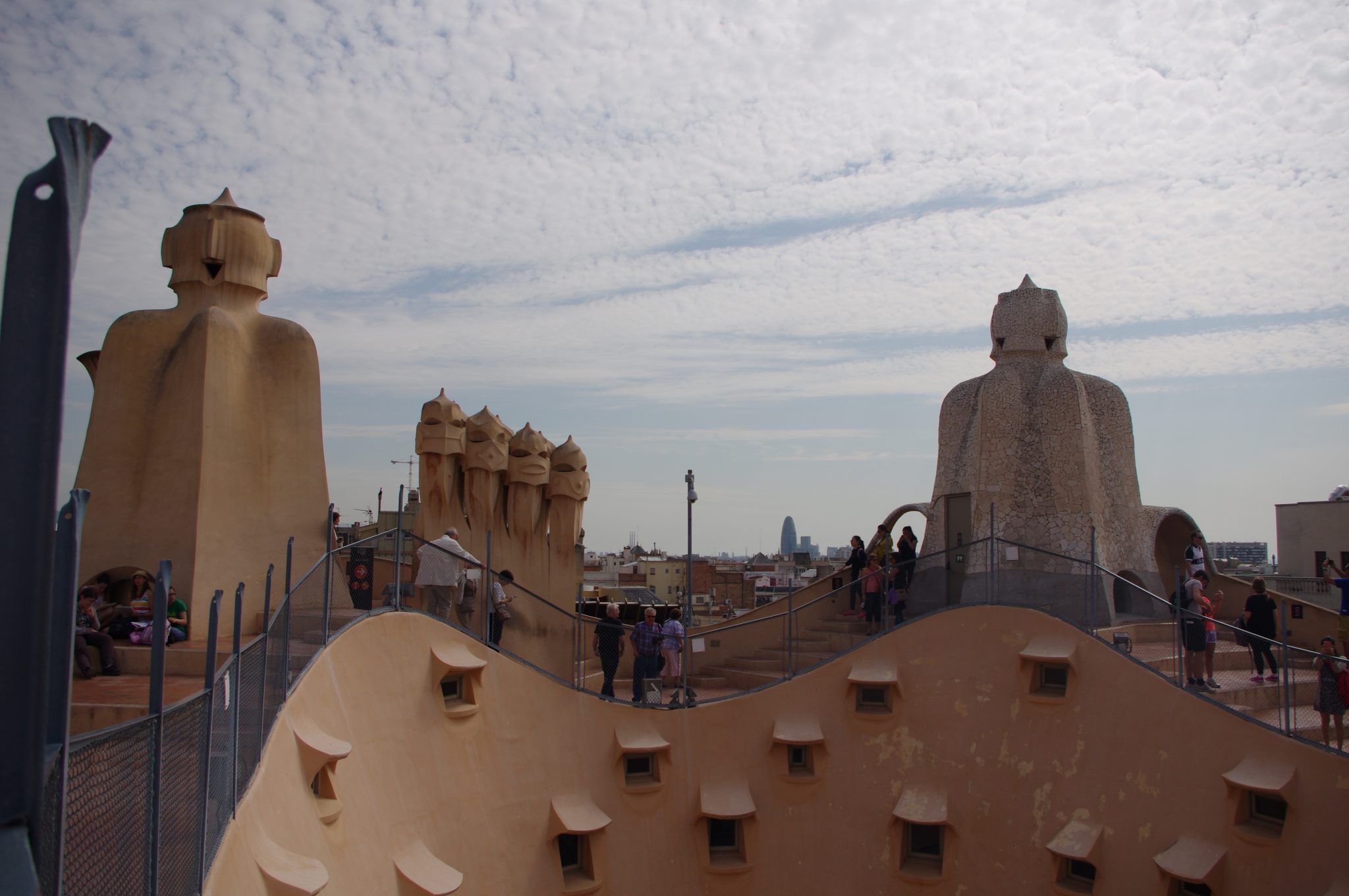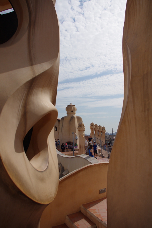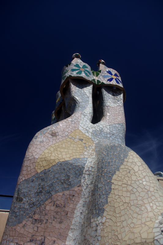 Casa Mila powstawała w latach 1906 – 1912 na zlecenie przedsiębiorcy Pere Mili. Cechą charakterystyczną jest brak kątów prostych w budynku oraz brak ścian nośnych. Oczywiście i w tym budynku dach i kominy stanowią dzieło sztuki. Kominy nawiązują swoją stylistyką m.in. do postaci wojowników w hełmach, krzyż św. Jerzego, patrona Katalonii odnajdziemy w kształcie głównego komina.