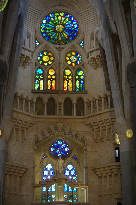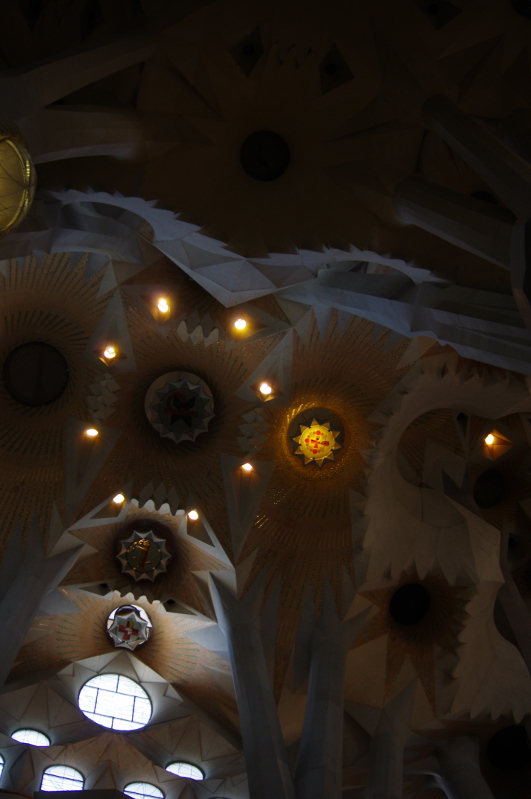 Wnętrze katedry to cudowna gra świateł wpadających przez witrażowe okna i tańczących na białych, surowych ścianach. Wspaniałe. Można siedzieć i kontemplować godzinami. W środku wydzielone jest miejsce dla modlących się i ochrona bacznie obserwuje żeby turyści nie zakłócali spokoju – dzięki temu naprawdę można zapomnieć o zgiełku za plecami i podziwiać. Słychać tylko rytmiczne odgłosy budowy, które dodają magii temu obrazowi. W Sagradzie jest też muzeum, w którym szeroko zobrazowana jest symbolika i inspiracje naturą w architekturze Gaudiego.