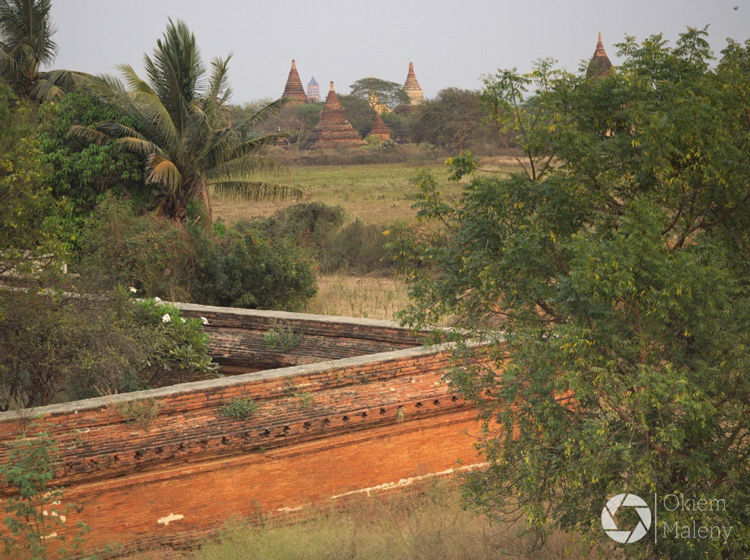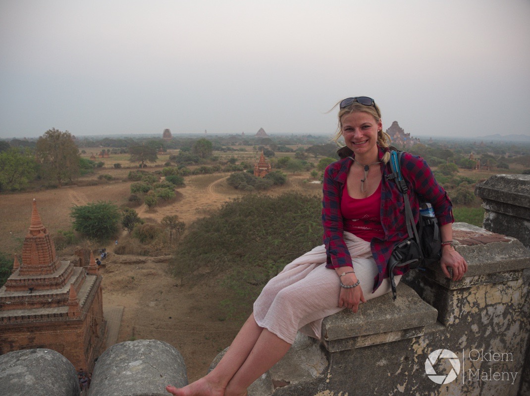 Znalazłam pagodę koło pagody Htilominio. Zachód Słońca się zaczyna, nikogo nie ma. Ptaki śpiewają, cisza i spokój. W oddali za Irrawadą góry, niebo różowieje od czerwonej kuli słońca. Za murkiem wierzchołki pagód. Bajka. Jest cudownie. Nie chce mi się wracać, a powoli czas iść, zaraz się ściemni. W takim klimacie to można osiągnąć nirwanę 😉 .”