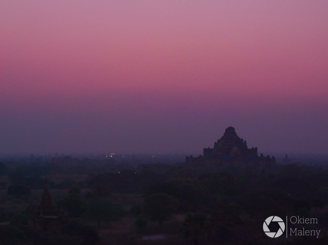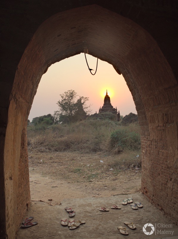 Tego wieczoru nie pchałam się już na pagodę Shwesandaw Paya, w której, o czym mało kto pamięta podobno jest złoty włos Buddy. Wracałam powoli do hotelu. Skręciłam aby obejrzeć pagodę Htilomilo. Miałam juz wracać gdy ktoś zapytał mnie czy nie chcę obejrzeć zachodu słońca na dachu pobliskiej świątyni. Pomyślałam czemu nie i dałam się zaprowadzić. Zostawiłam buty przed wejściem do Htilomilo, więc dreptałam na boso po rozgrzanym piachu i kamieniach. Weszłam przez wąskie schody na górę, usiadłam na jej tarasie. Było nas w sumie 4 osoby. Jednak 3 Francuzów bardzo szybko poszło i zostałam sama. Usiadłam oparta o murek, zmęczona po całym dniu i rozkoszowałam się zachodem Słońca, który był tylko dla mnie. Oprócz śpiewu ptaków panowała kompletna cisza. W oddali widziałam góry za rzeką Irrawadi, dachy innych stup i różowiejące niebo. Miałam gdzieś pogoń za tym jedynym zdjęciem, uchwyceniem magii. Kontemplowałam tę chwilę, rozkoszowałam się nią. Wyjęłam notatnik i zapisałam: