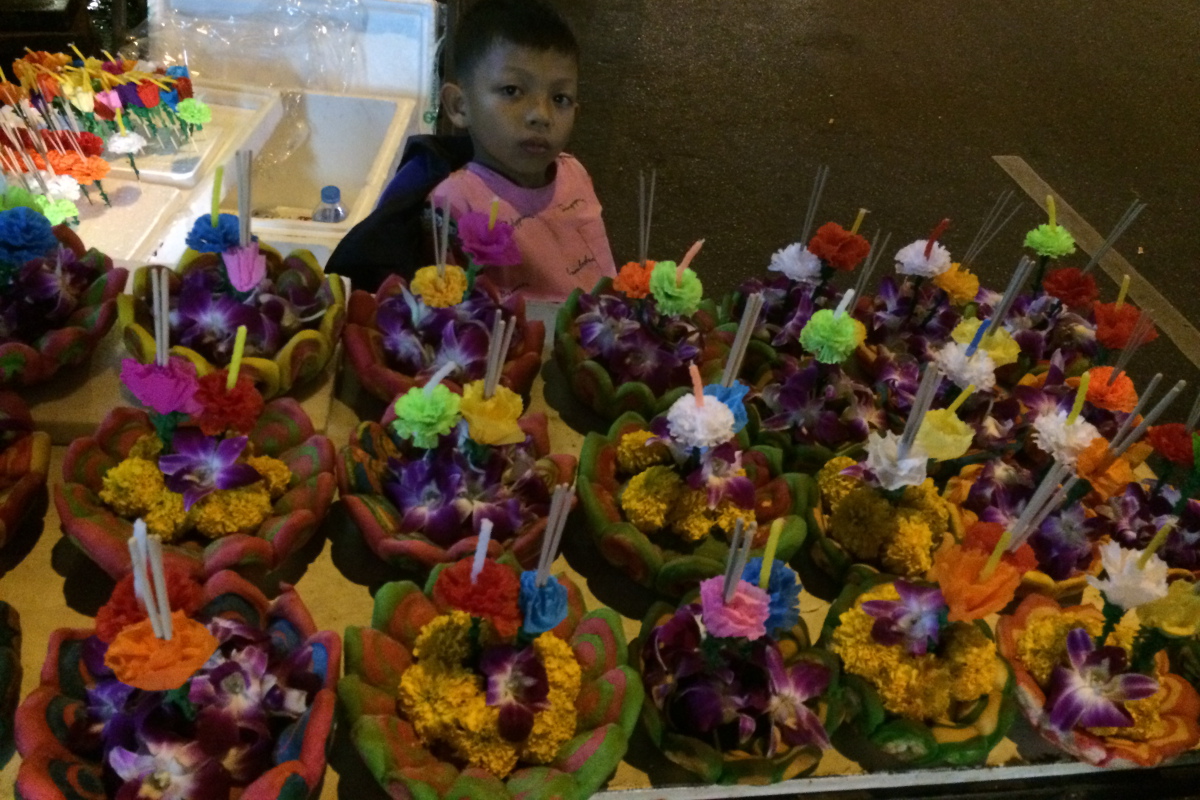 Podczas pierwszej wizyty w Bangkoku miałam szansę uczestniczyć w bardziej stonowanym świecie – Loy Krathong. Święto dziękujące rzece Chao Praya za to, że jest, że jest częścią życia bangkockiej społeczności, za pożywienie, ale także przepraszającym ją za zanieczyszczenia. Więcej o tym święcie, przypadającym w tym roku na 25.11 przeczytacie tu. Na ulicach Bangkoku roiło się od sprzedawców przepięknych tratewek z kwiatów. Można by to porównać do naszych wianków puszczanych w noc świętojańską, tylko trochę bardziej strojnych. 🙂