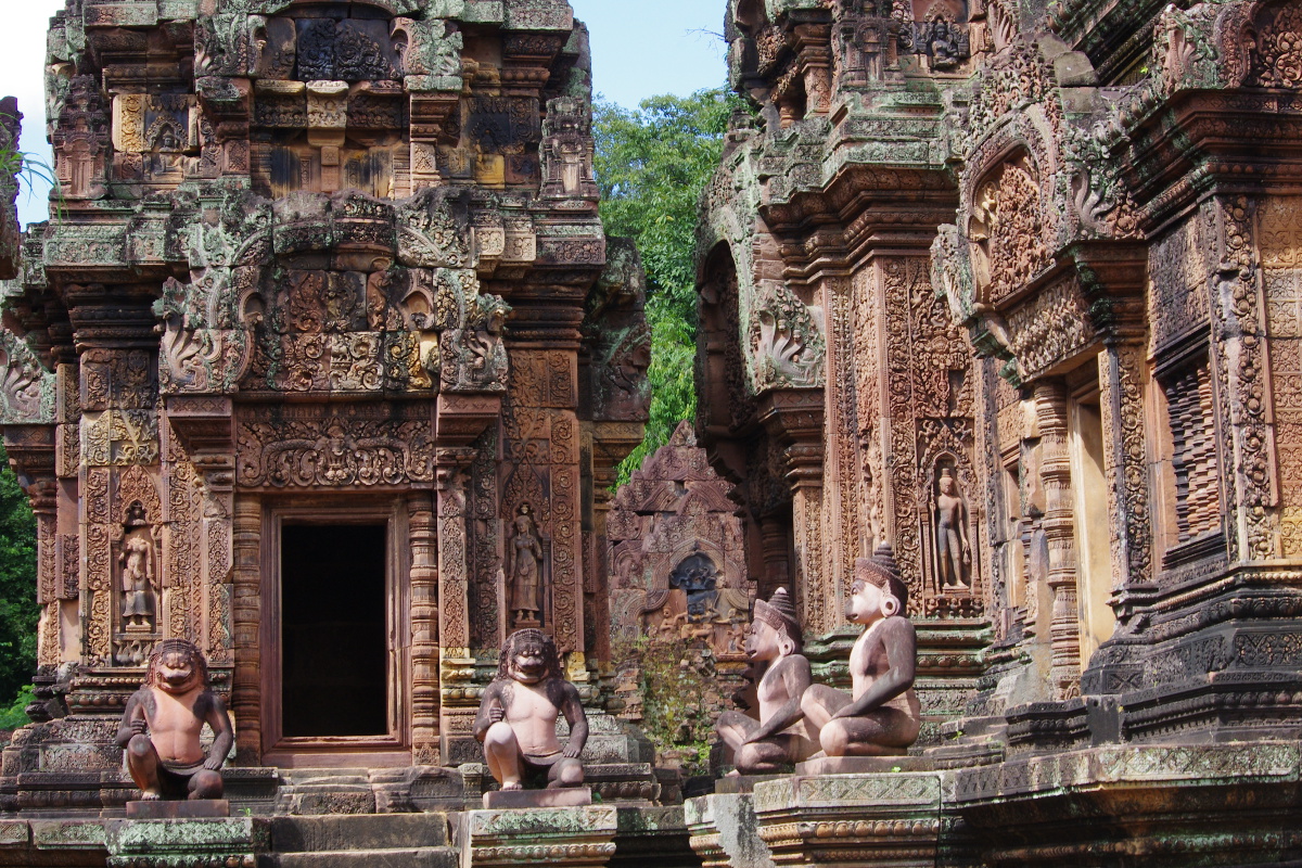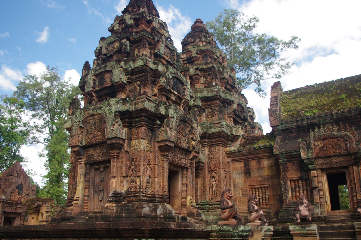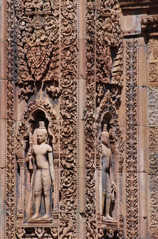 Banteay Srei zwana także Świątynią Kobiet lub Świątynią Piękna to maleńka, w porównaniu z cudami Angkor Watu, świątyńka położona około 35 km od miasta Siem Reap. Powstała w drugiej połowie X wieku /967 r./. Francuscy archeolodzy zgodnie okrzyknęli ją perłą sztuki kmerskiej. I mieli 100 % rację. Zdobienia, które są wyryte w czerwonym piaskowcu, wprawiają w osłupienie. To niewiarygodne, że to dzieło ludzkiej reki.