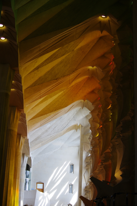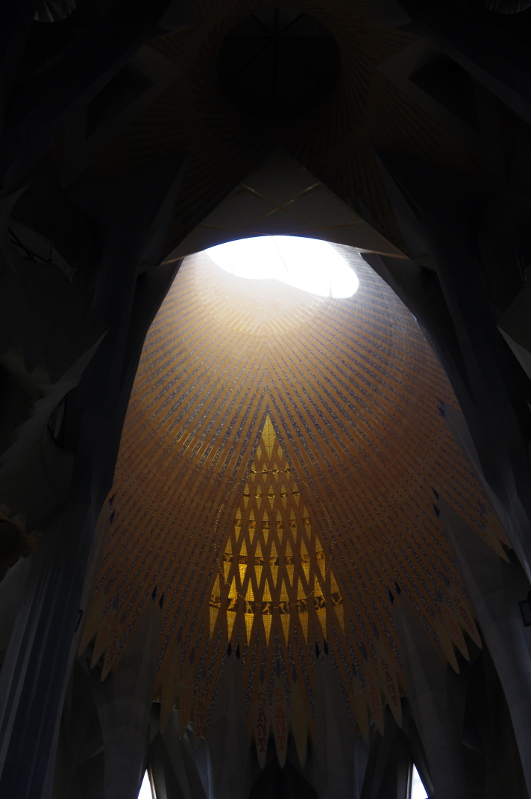 Sagrada Familla ma niesamowite, surowe wnętrze. Na białych, strzelistych ścianach  odbija się kolorowe światlo, które wpada do katedry przez witraże. Tu również znajduje się mini muzeum pokazujące inspiracje Gaudiego. Warto wyjechać na wieżę i przyjrzeć się z bliska zdobieniom dachu oraz zobaczyć piękną panoramę Barcelony.