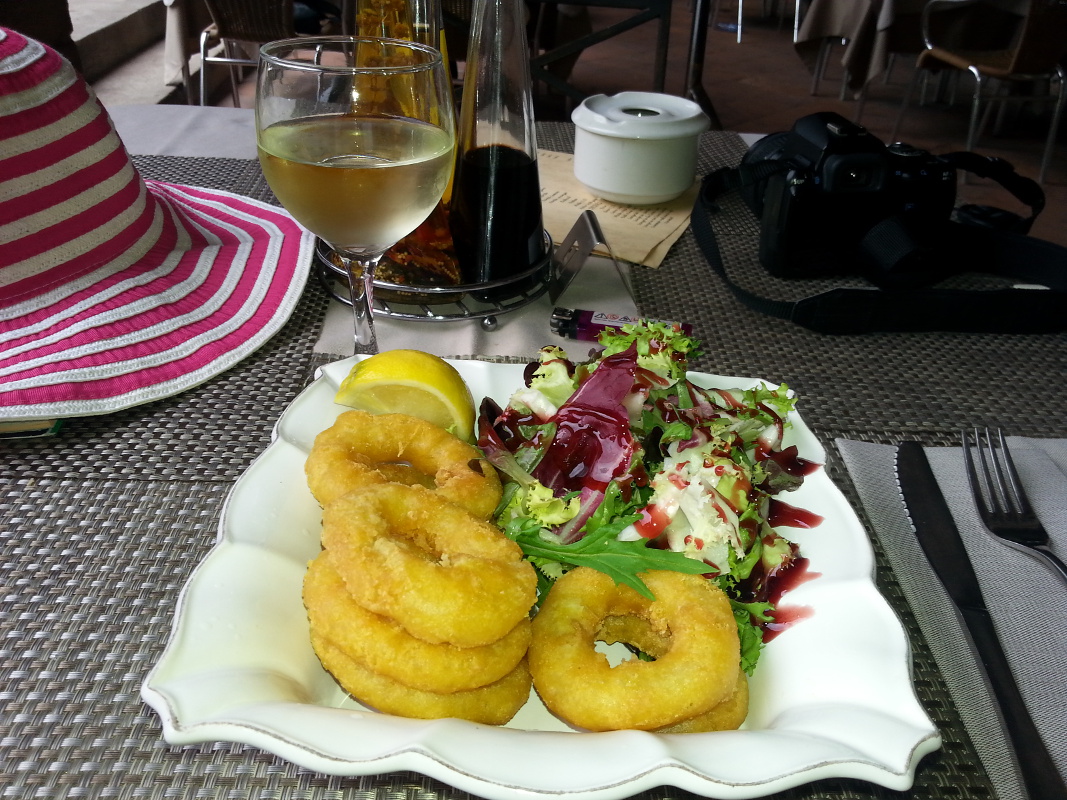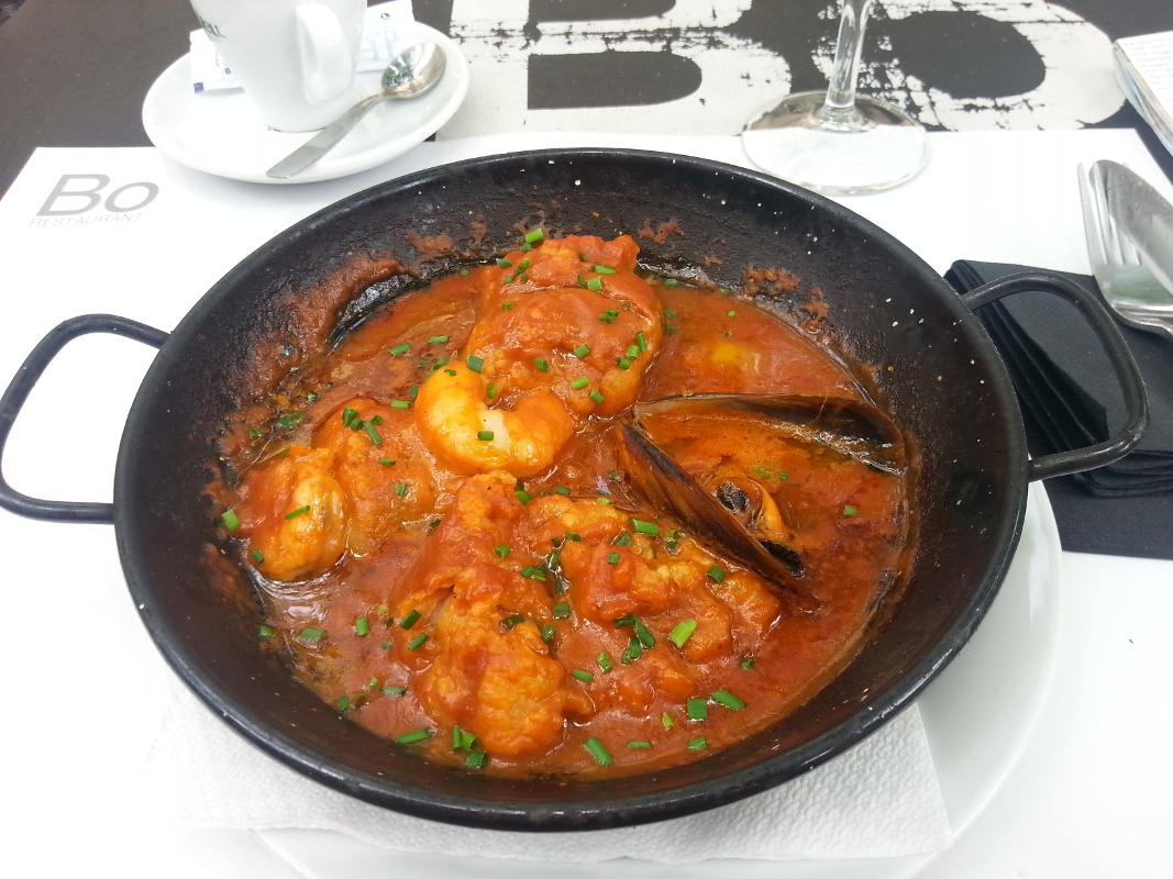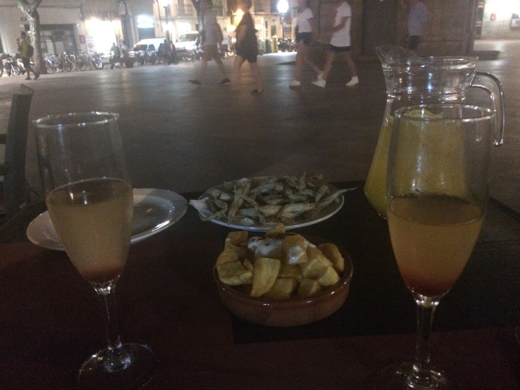 Kuchnia hiszpańska jest bardzo smaczna, ale niestety nie należy do najbardziej dietetycznych 😉 Jednym ze specjałów są Bombas – kartoflane krokiety z mielonym mięsem i czosnkowym sosem. Kaloryczna pycha 😉 Patas bravas – pieczone ziemniaczki z sosem ostrym i czosnkowym. Chipirones – małe opiekane kalmarki. Mejillones a la marinera – małże w sosie marinera. W tym roku odkryłam mątwę (sepia) – bardzo mięsista, w smaku bardziej przypomina rybę niż owoce morza. Bardzo dobra. Pescaditos – to małe pieczone rybki, bardzo fajna zakąska do wina. Podejrzewam, że paellę też tam maja dobrą, choć tam nigdy nie próbowałam.