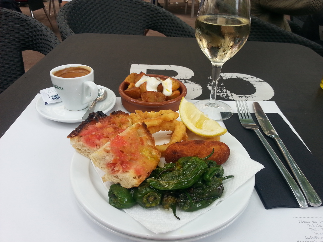 La torreta to moje zeszłoroczne odkrycie. Mała knajpka, w bocznej ulicy – w okolicach Parku Guell (jakieś 15 minut drogi). Ma typowe katalońskie jedzenie, ceny dla Hiszpanów ;-), WIFI, miłą obsługę. Szczególnie lubiłam tam zestawy dnia. Czyli przystawka, danie główne, wino/woda, kawa/deser.