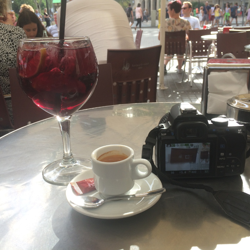 Nigdy nie zapomnę rachunku 12 euro za kieliszek Sangrii z widokiem na Sagradę Familię. Mój błąd nie sprawdziłam dokładnie, tylko przelotnie zerknęłam na ceny, że są ok. Na Rambli jest drogo. Gdy macie ochotę usiąść i napić się kawy lub coś zjeść warto przejść jeszcze parę kroków, w pobliże pomniku Kolumba – tam po lewej stronie jest La Cava Universal. Sangria przepyszna, w normalnej cenie i wielka 🙂 Do tego przekąski, kawa, desery no i wifi ;-).