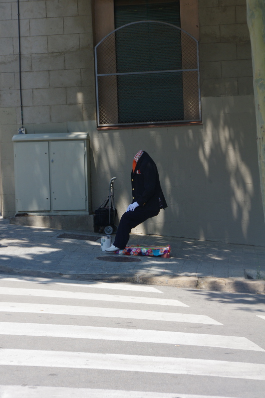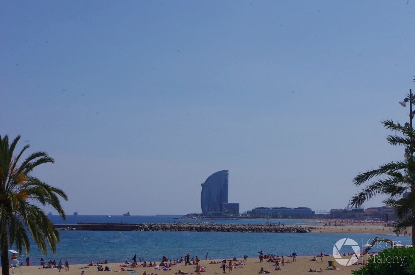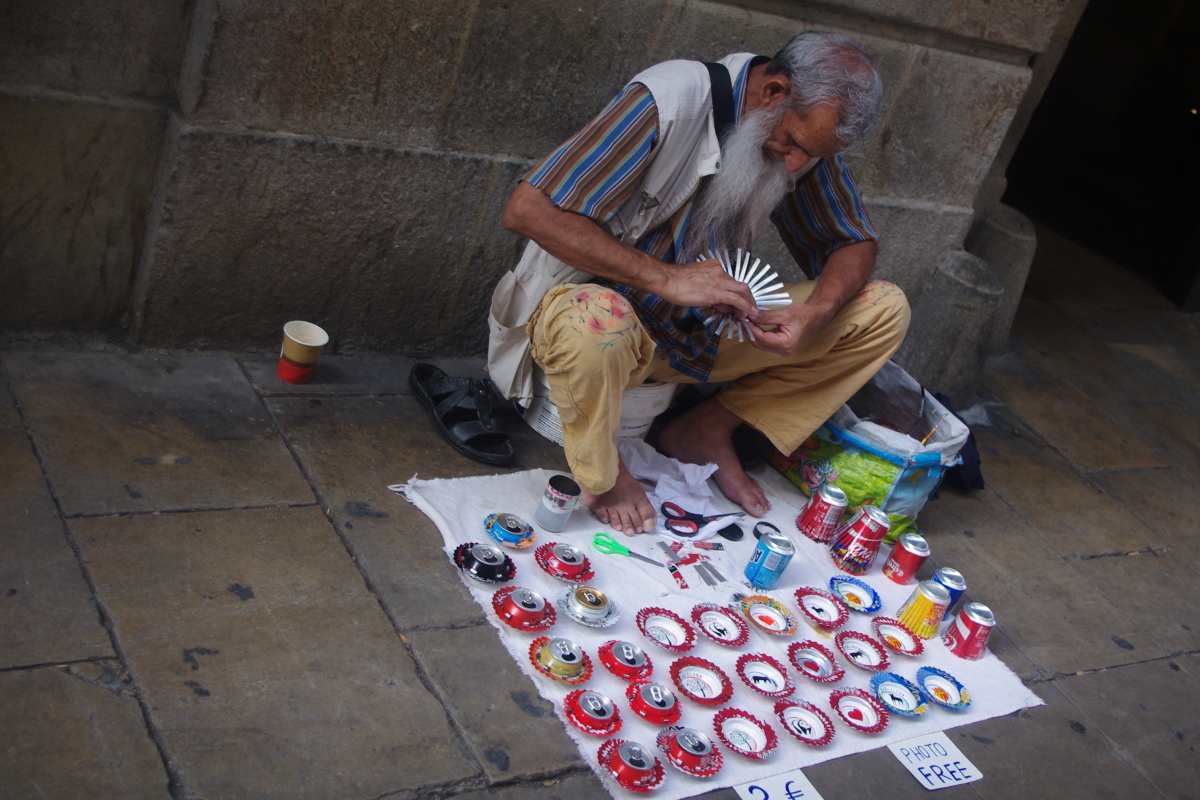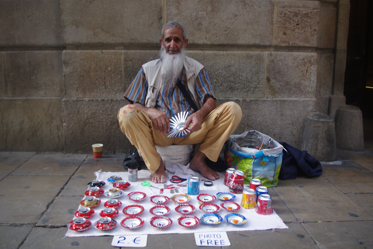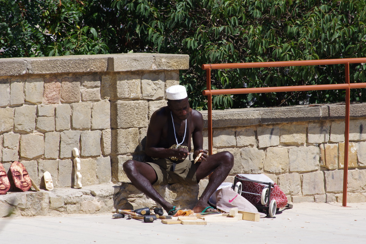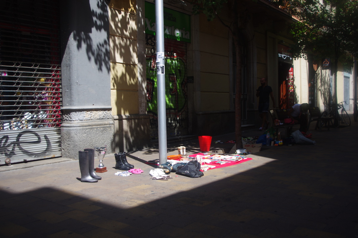 Nad morzem toczy się gra pomiędzy policjantami, a sprzedawcami podróbek. Obserwowałam parę razy tłum uciekających sprzedawców z prześcieradłami na plecach. Każdy koniec prześcieradła połączony jest sznurkiem – wystarczy jeden ruch i cały stragan zwija się w zgrabny tobołek. To wszystko kontrastuje z luksusowymi sklepami Chanel, Gucci, Bulgari etc. położonymi kilka kilometrów dalej  przy Passeig de Gracia.