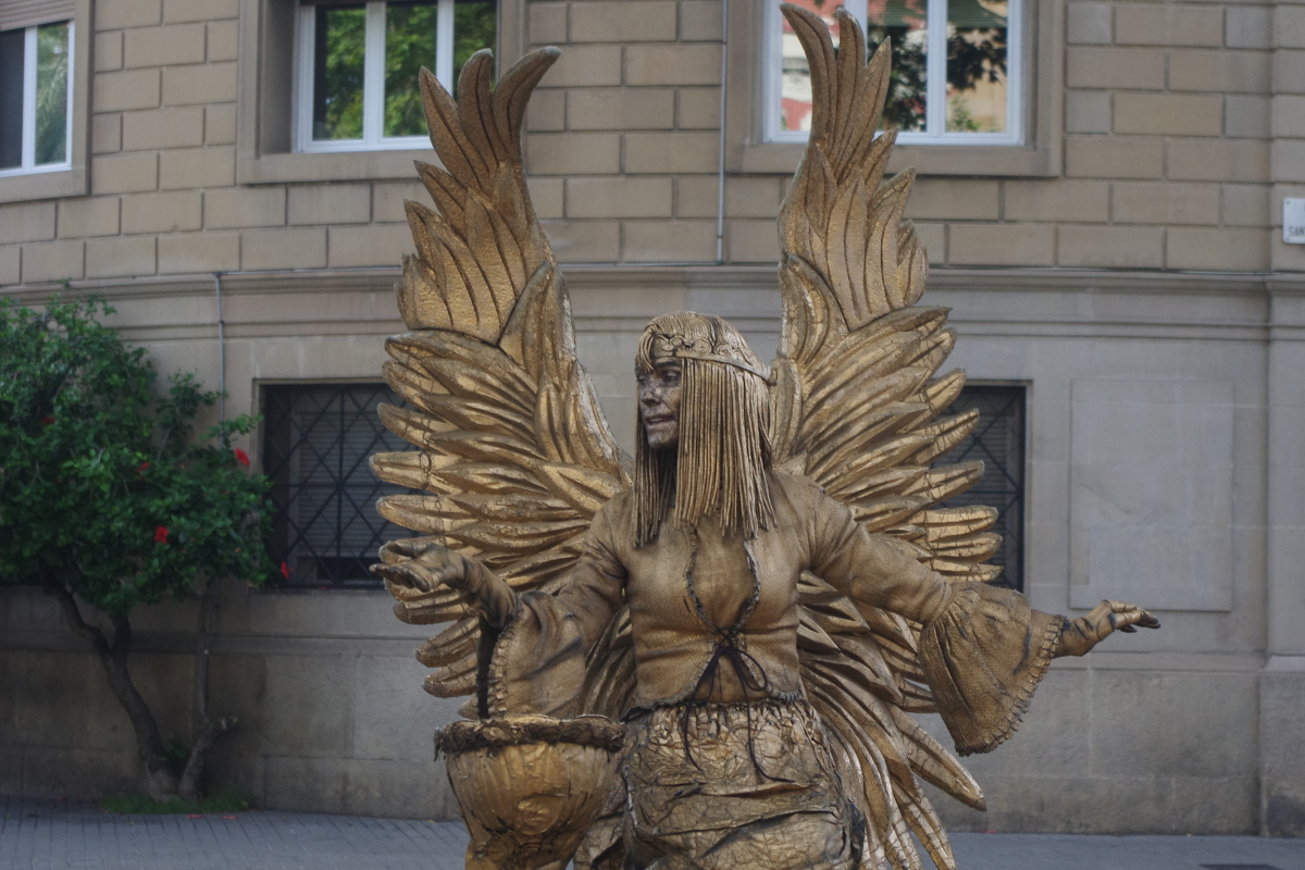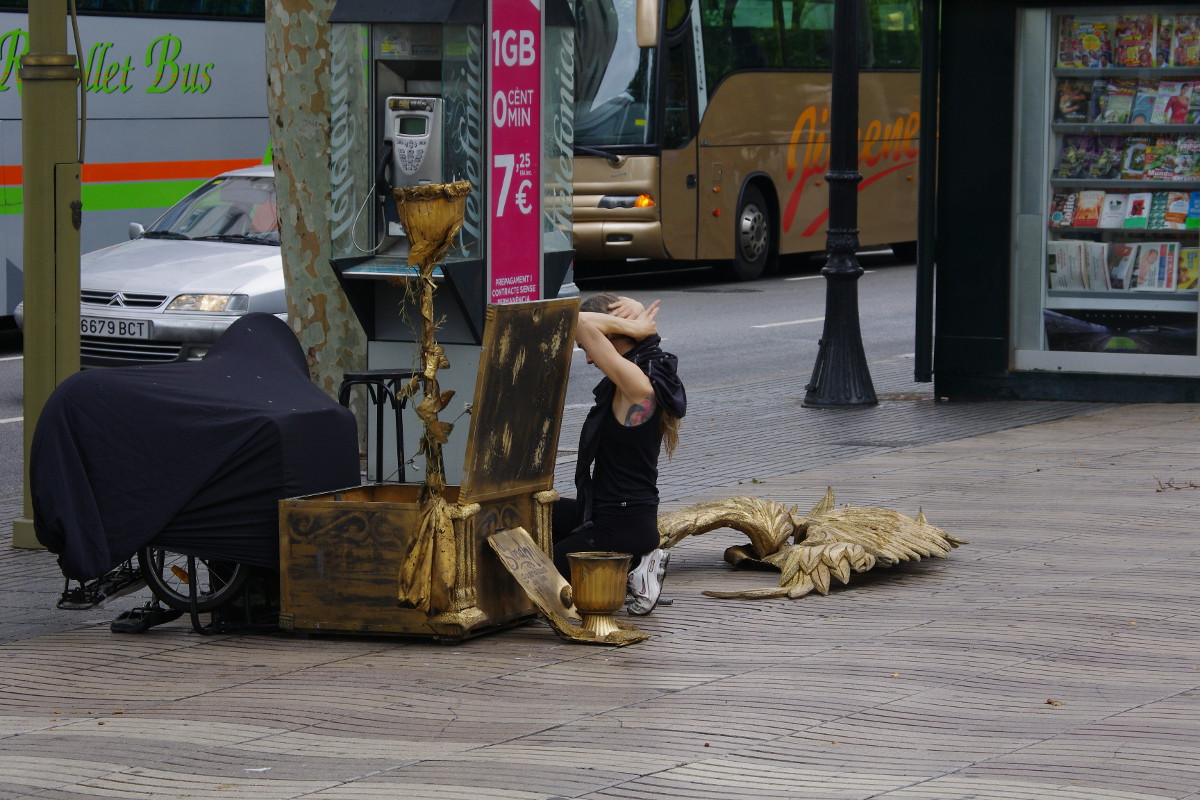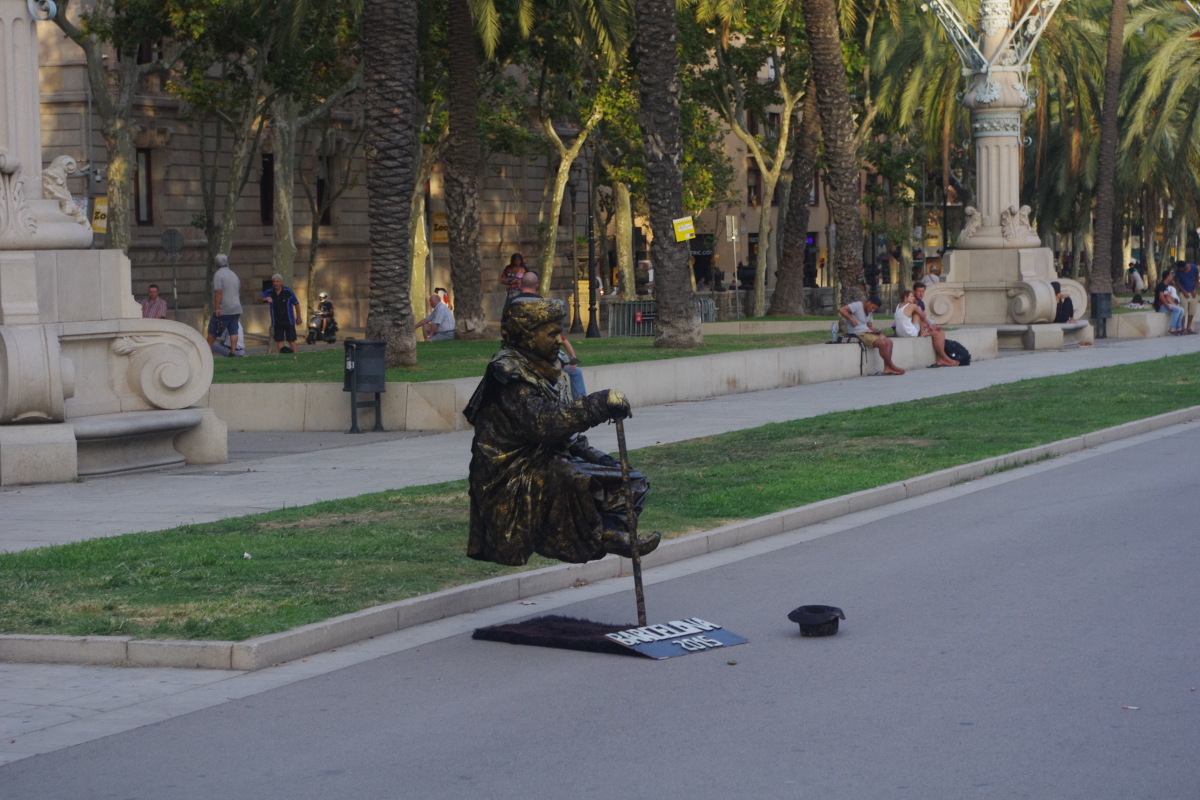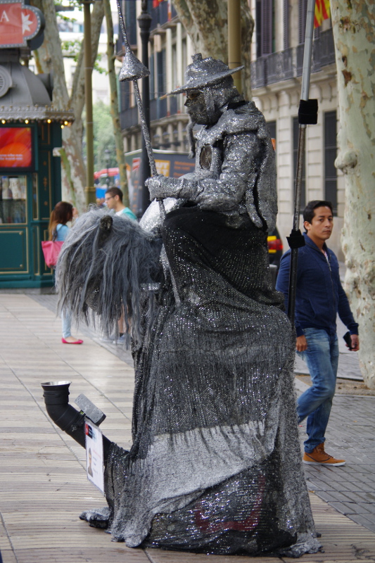 Rambla to jedna z najsłynniejszych ulic Barcelony, jednak według mnie zdecydowanie nie najciekawsza. Na Rambli moją uwagę przykuwali mimowie – ich stroje były cudowne. Lubiłam obserwować jak przygotowują się do zastygnięcia w bezruchu jak wspaniałe rzeźby. Jednak sama ulica nie urzeka. Jest pełna ludzi, straganów z pamiątkami, kafejek i barów tapas z cenami przyprawiającymi o zawrót głowy no i kieszonkowców 😉
