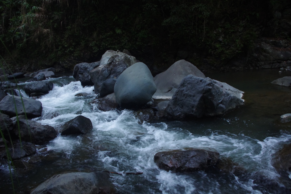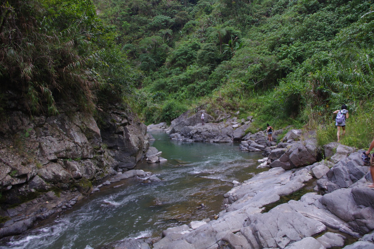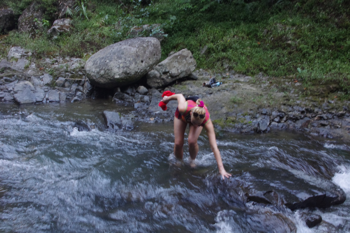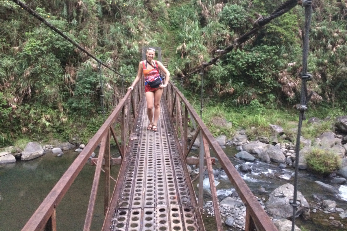 W Batadzie wynajęliśmy przewodnika, który przeprowadził nas tarasami ryżowymi do wodospadu Tappiya, a potem szliśmy do wiszącego mostu strumieniem rzeki. Wydawało mi się, że tym razem jestem gotowa na wędrówkę. Ba, nawet idealnie gotowa. Na wędrówkę tak, ale na przeprawę przez wartką rzekę nie. Szczególnie nie z paszportem, aparatem, telefonem i całym wartościowym dobytkiem. A worki wodoszczelne oczywiście w plecaku hen w górze… ale co tam 😉 I tak szliśmy dobrze ponad godzinę w górę / dół (?!) rzeki pokonując jej nurt, skacząc z kamienia na kamień, przedzierając się po pas w wodzie po śliskich kamieniach, brodząc w mule pełnym wolę nie wiedzieć czego, opędzając się od komarów. Gdzie jest mugga? Oczywiście na górze, w plecaku, hen daleko.