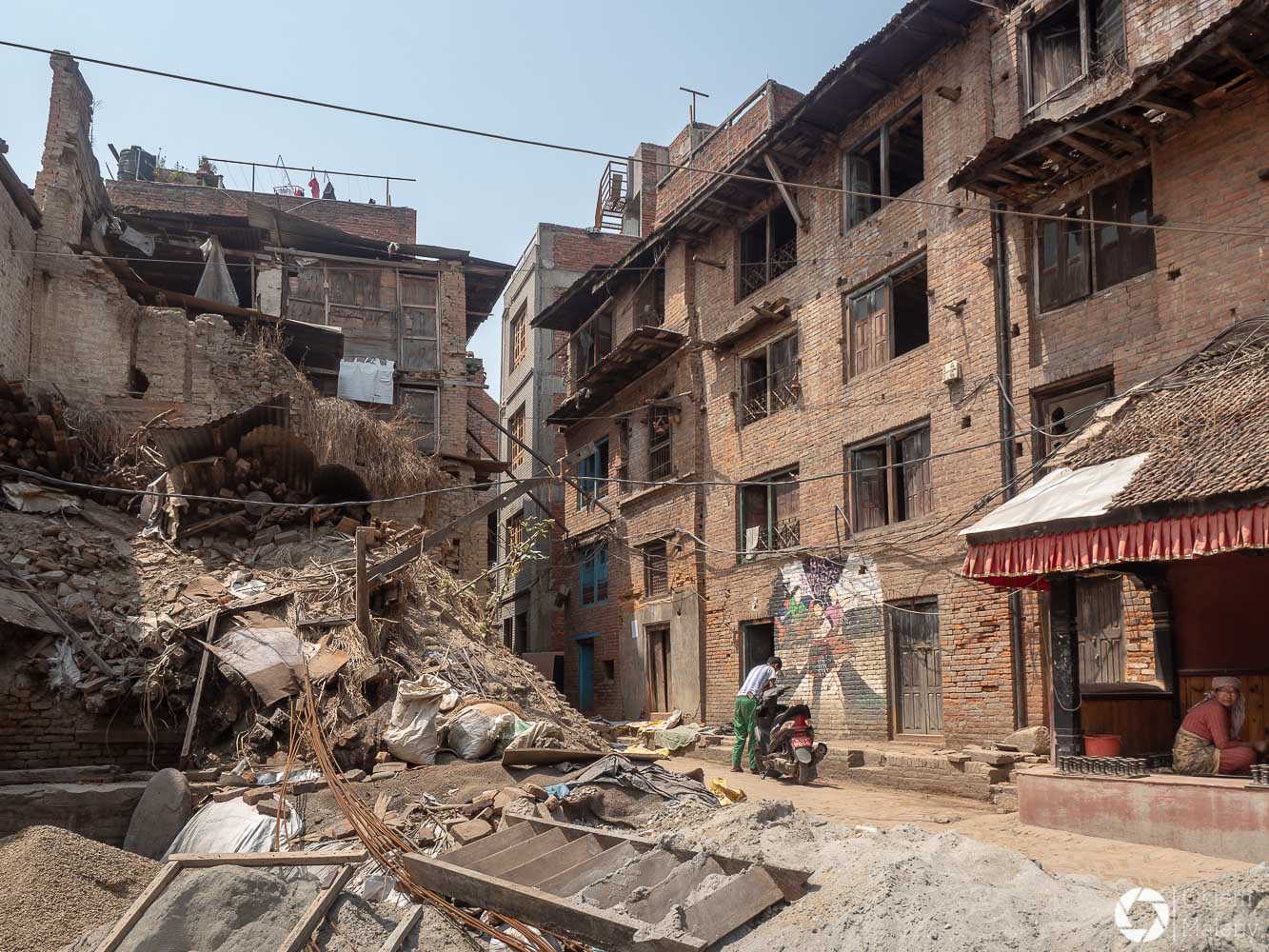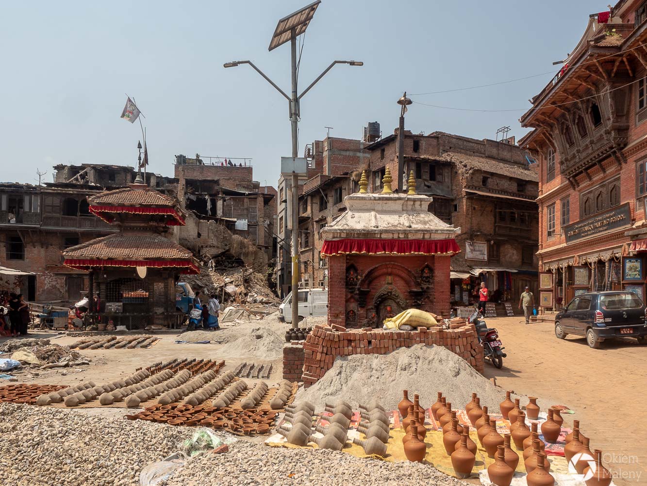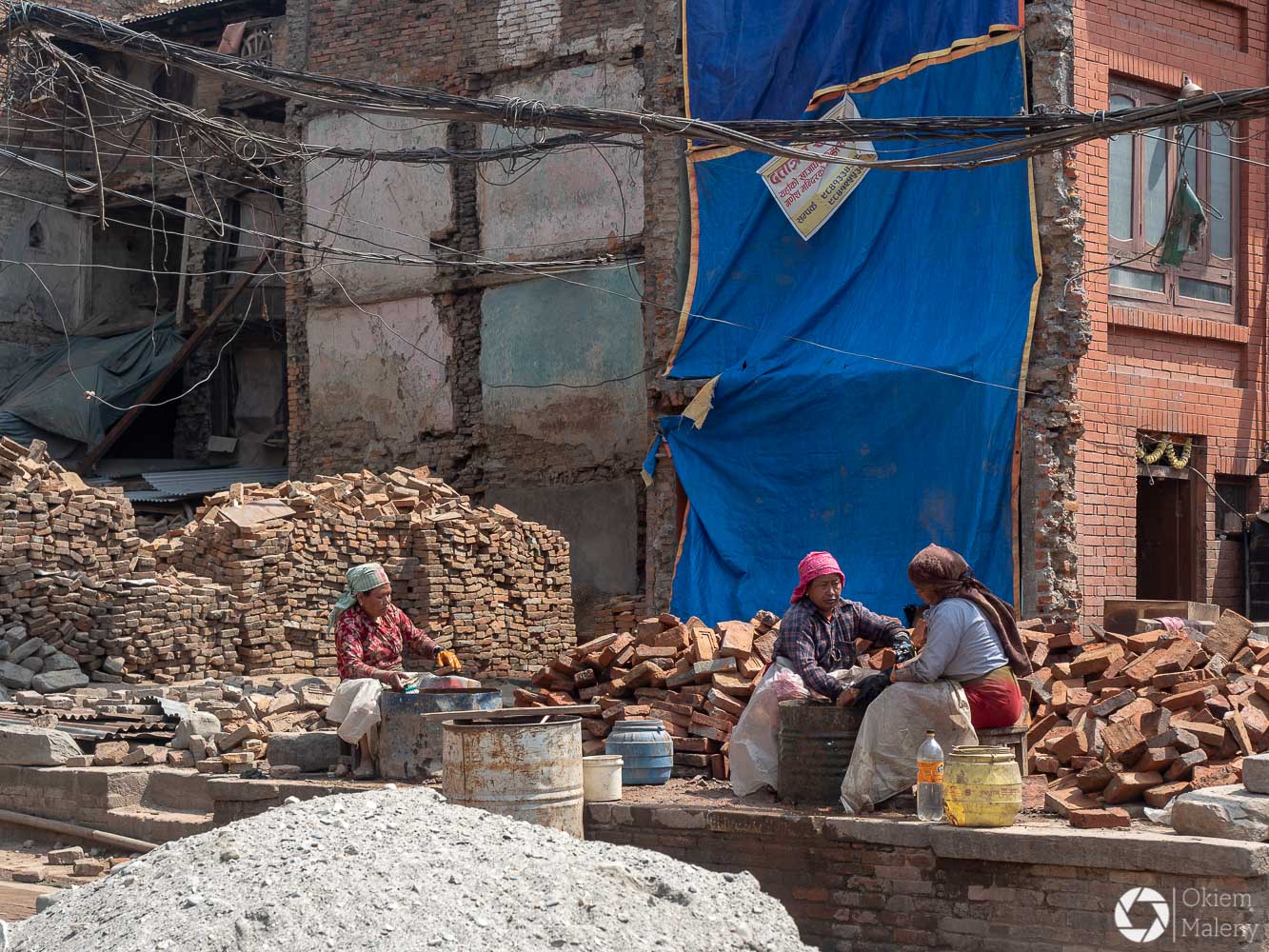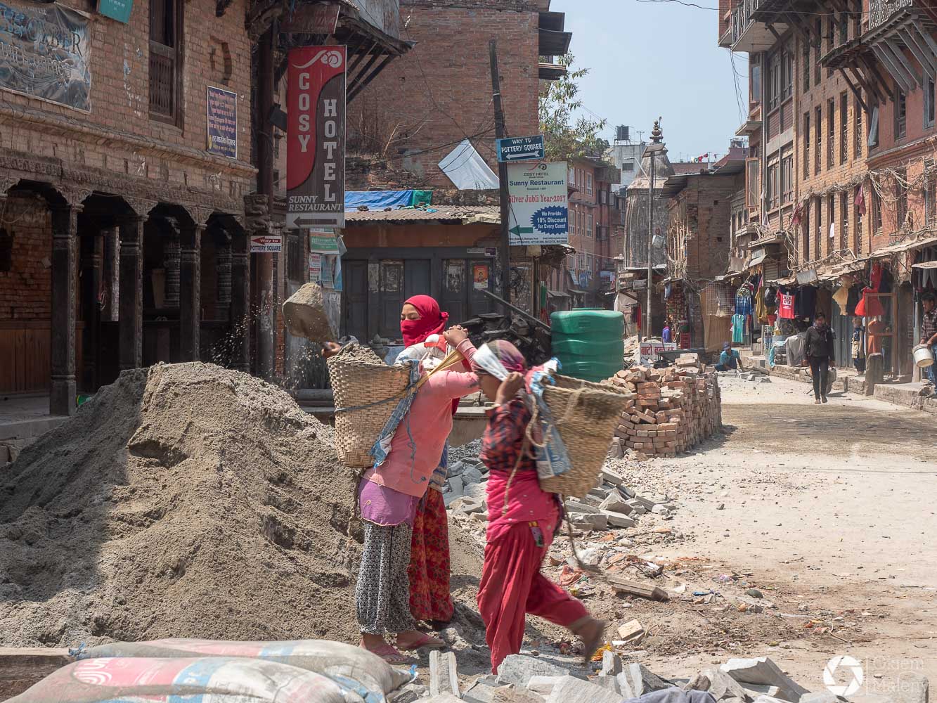 To historyczne, newarskie miasteczko z jednej strony zachwyca pieknem zdobień budynków, z drugiej zasmuca ogromem zniszczeń po trzesieniu ziemii. Praktycznie to jeden wielki plac budowy/odbudowy. Oprócz świątyń i domów pokazujących kunszt newarskiego rękodzieła mamy całą plejadę domów bez dachów, domów, z których została tylko fasada, rumowisk i pietrzących się cegieł. Na każdym kroku grupki budowlańcow – w przeważającej części kobiet – coś segreguje, muruje, usuwa gruzowiska.
