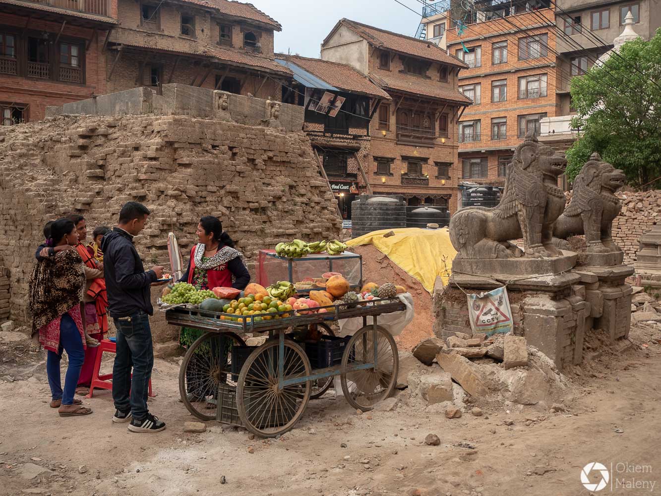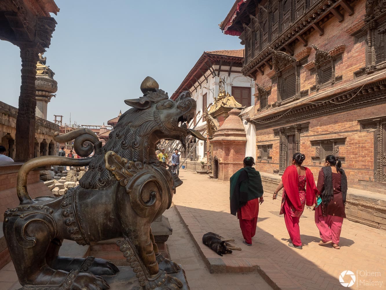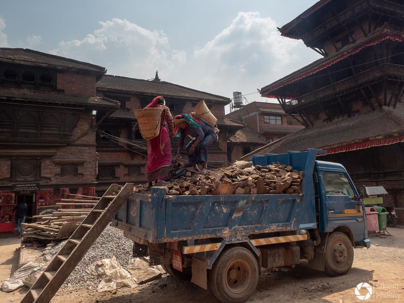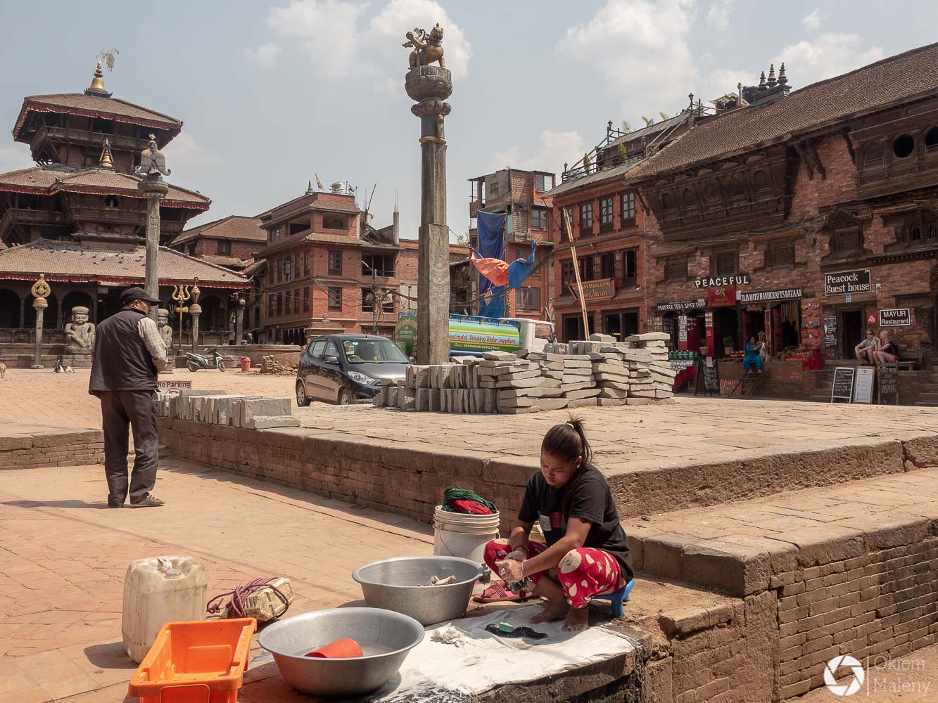 To historyczne, newarskie miasteczko z jednej strony zachwyca pieknem zdobień budynków, z drugiej zasmuca ogromem zniszczeń po trzesieniu ziemii. Praktycznie to jeden wielki plac budowy/odbudowy. Oprócz świątyń i domów pokazujących kunszt newarskiego rękodzieła mamy całą plejadę domów bez dachów, domów, z których została tylko fasada, rumowisk i pietrzących się cegieł. Na każdym kroku grupki budowlańcow – w przeważającej części kobiet – coś segreguje, muruje, usuwa gruzowiska.