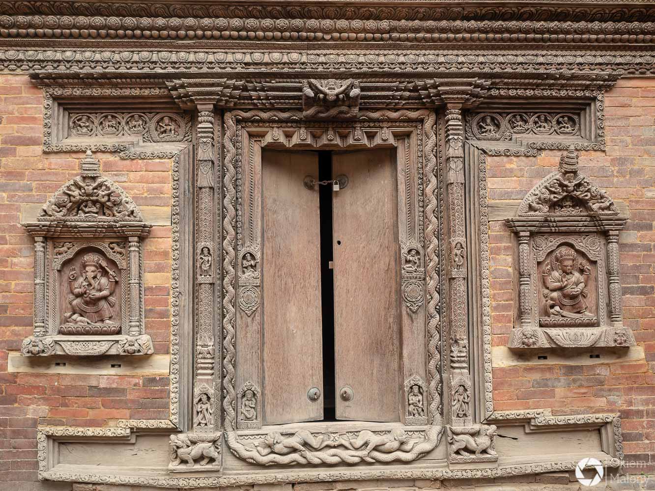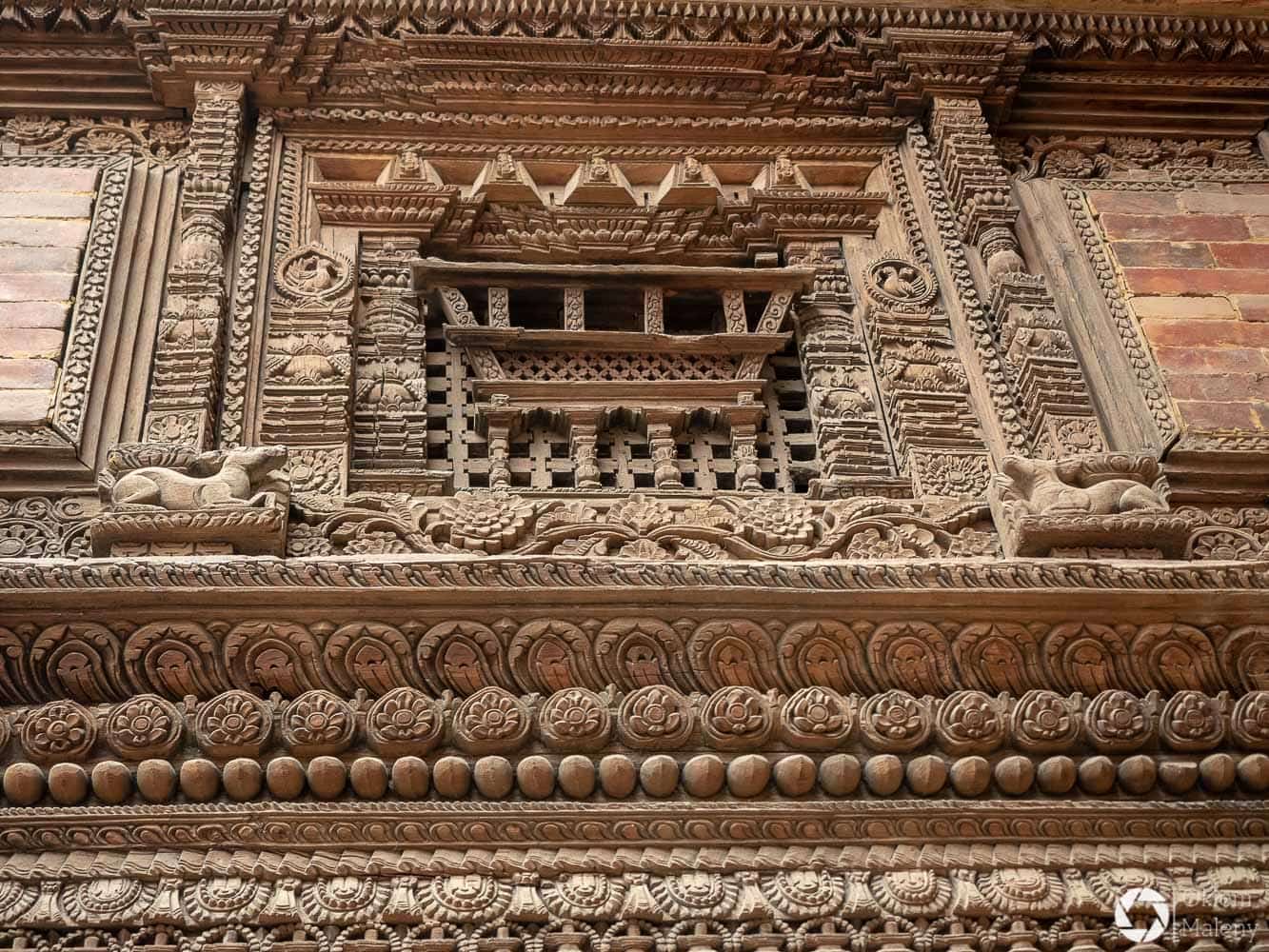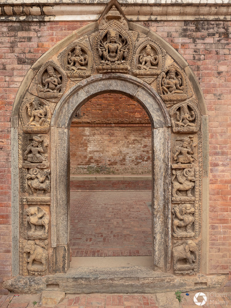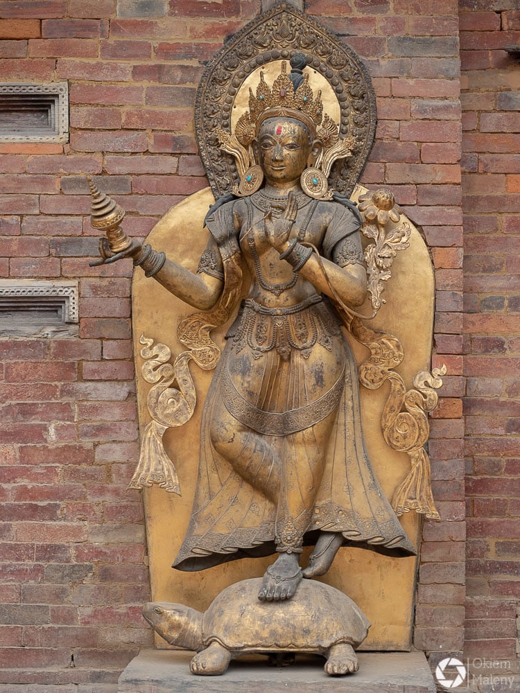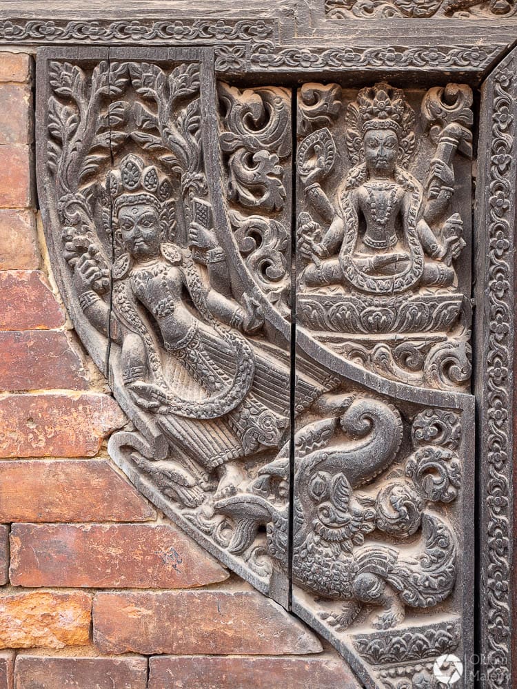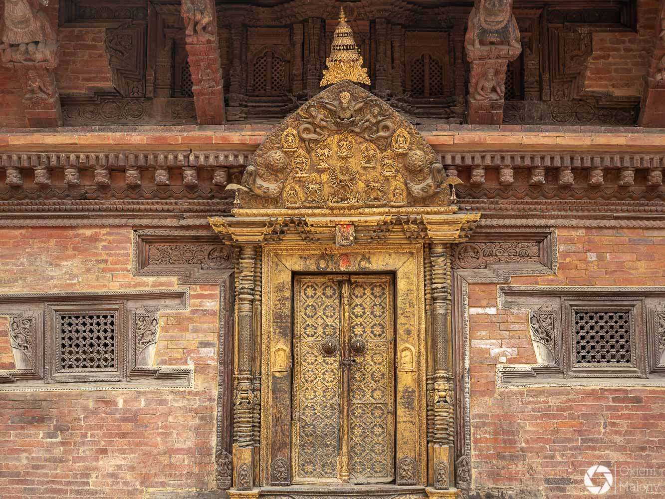 Plac Durbar to jeden z trzech głównych placów Bhaktapuru. Oprócz licznych świątyń na uwagę zasługuje Złota Brama, znajdująca się tuż przy Pałacu 55 okien. Mam totalnego świra na punkcie finezyjnych zdobień w twardych materiałach takich jak kamień, metale oraz drewno. Można stać długo i podziwiać niewiarygodną precyzję jej twórcy. Zresztą zachwyt nad precyzją budowniczych będzie Wam towarzyszył często i gęsto podczas wizyty w Bhaktapurze i w Patanie również.