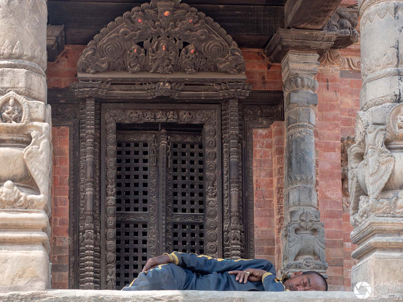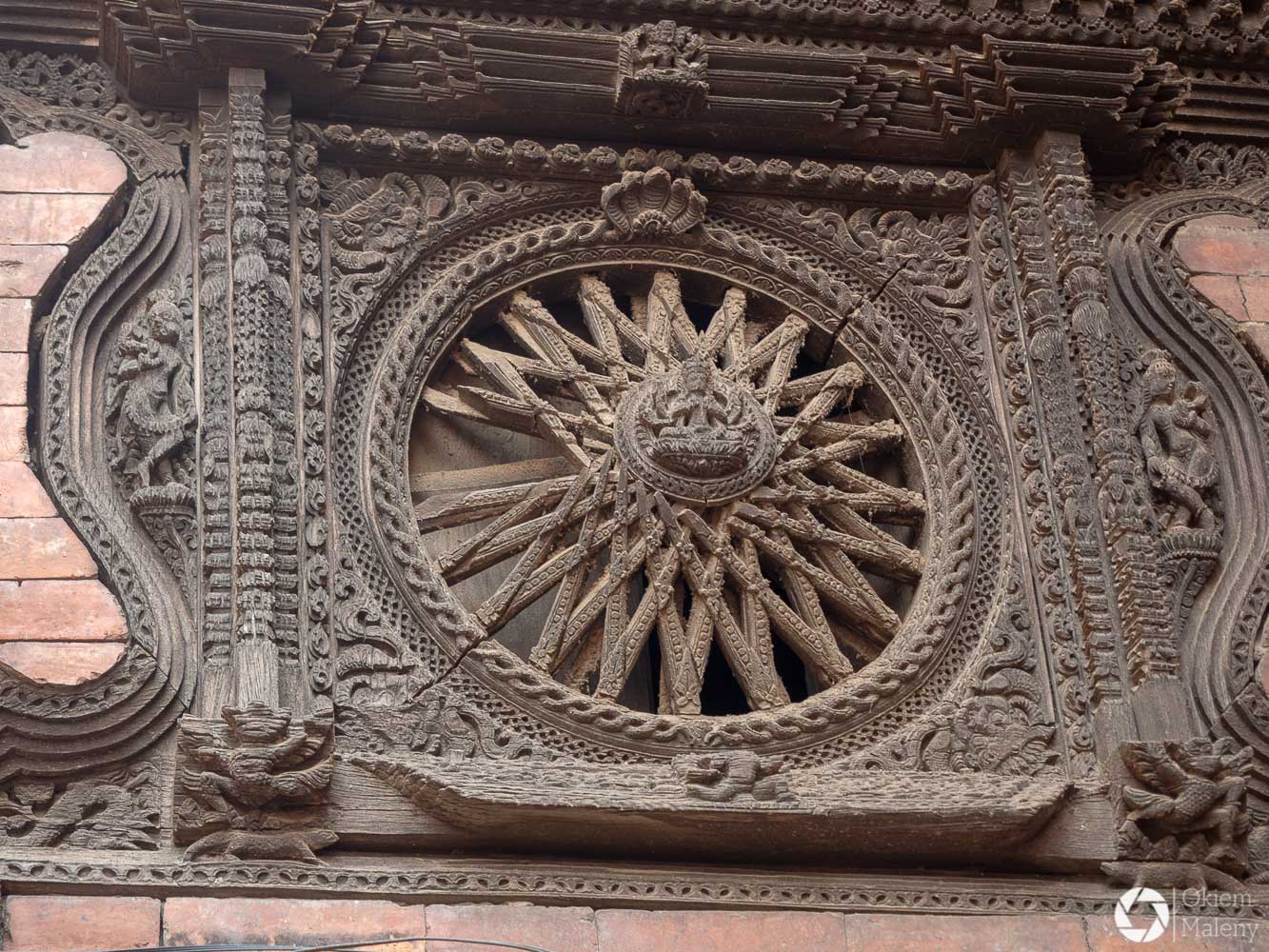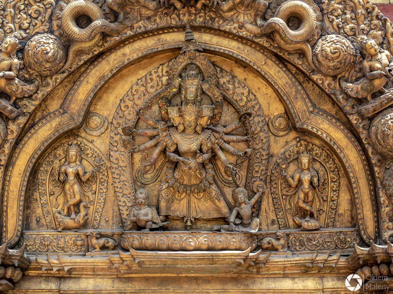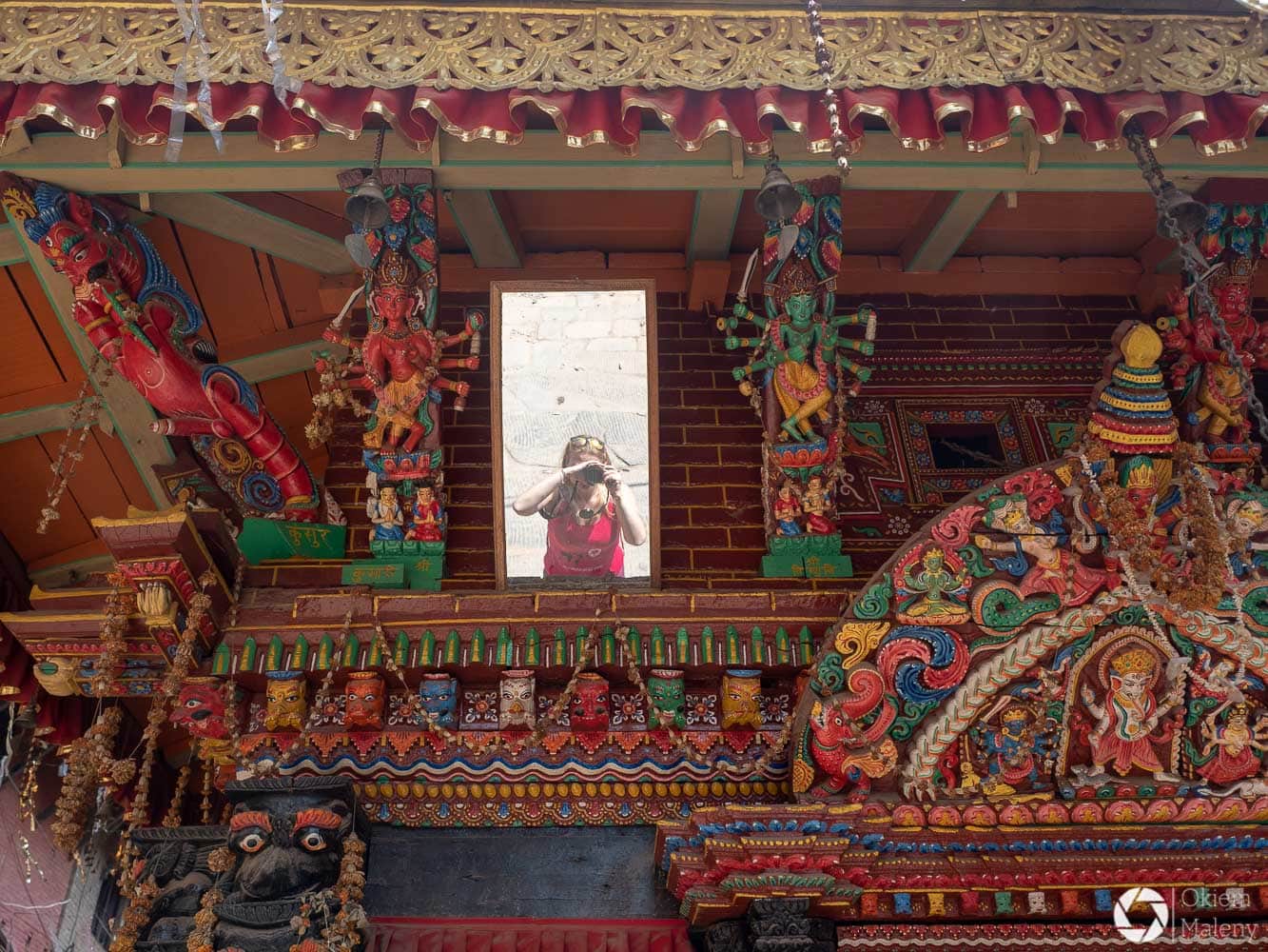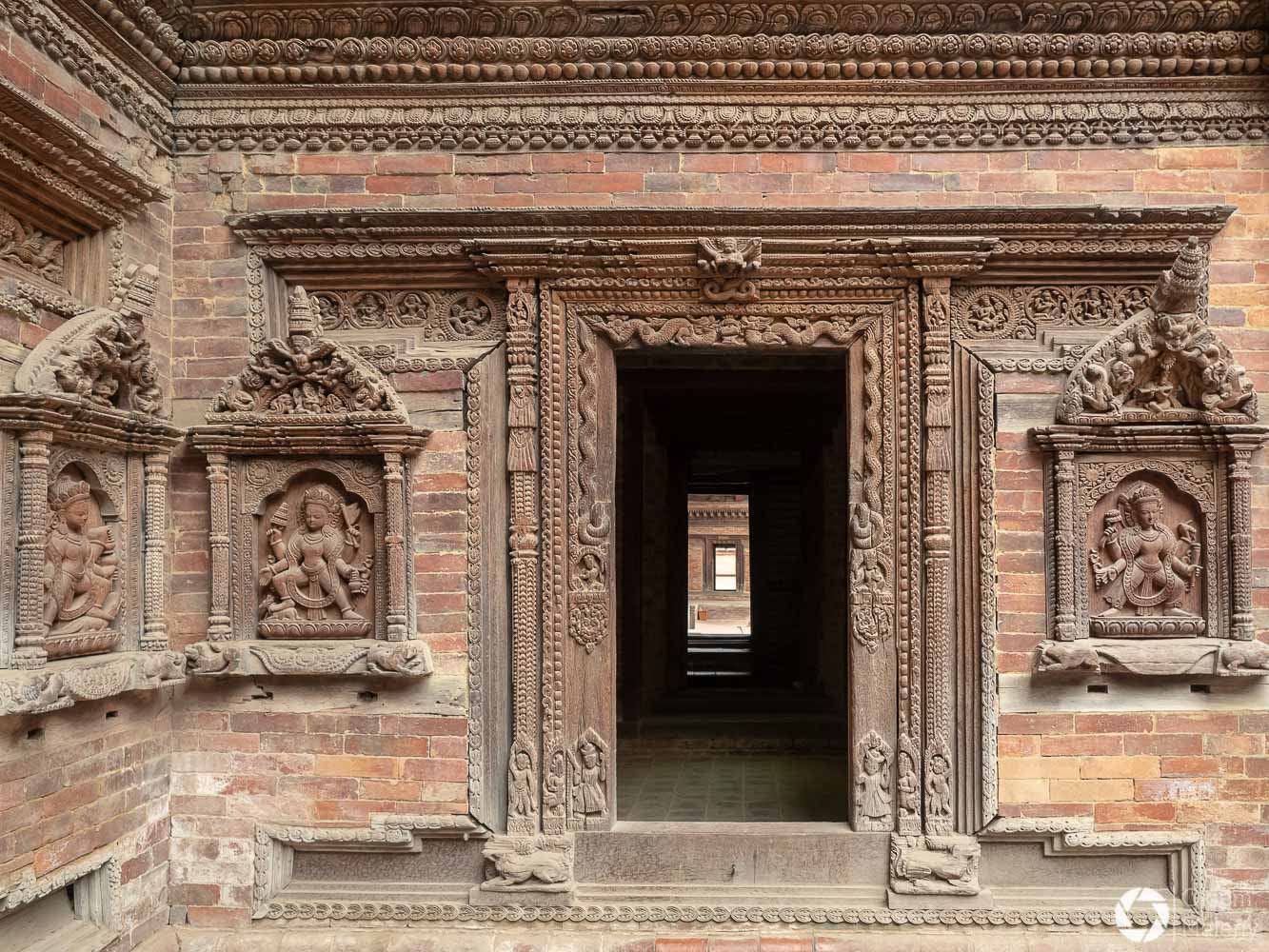 Plac Durbar to jeden z trzech głównych placów Bhaktapuru. Oprócz licznych świątyń na uwagę zasługuje Złota Brama, znajdująca się tuż przy Pałacu 55 okien. Mam totalnego świra na punkcie finezyjnych zdobień w twardych materiałach takich jak kamień, metale oraz drewno. Można stać długo i podziwiać niewiarygodną precyzję jej twórcy. Zresztą zachwyt nad precyzją budowniczych będzie Wam towarzyszył często i gęsto podczas wizyty w Bhaktapurze i w Patanie również.