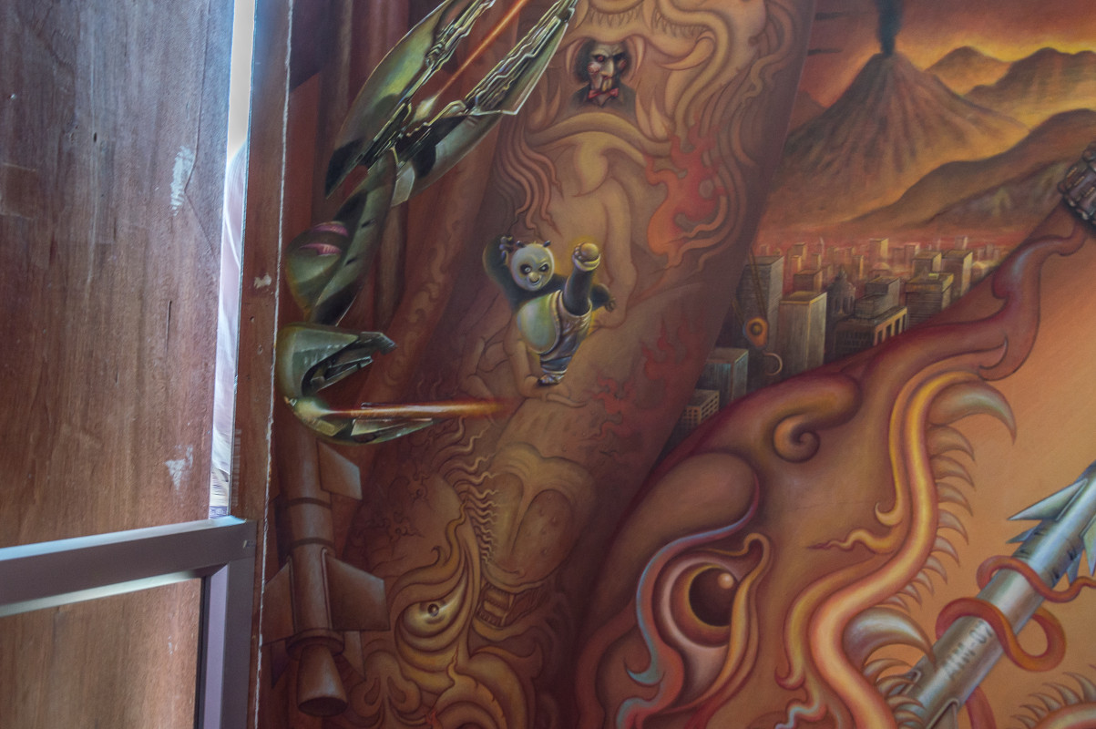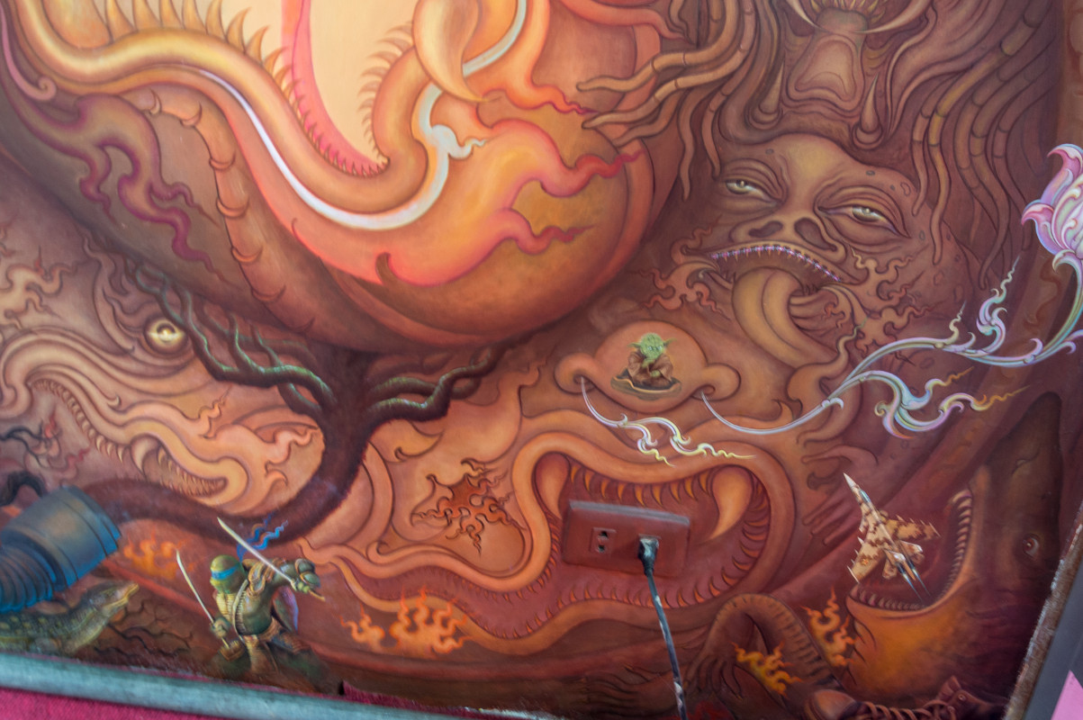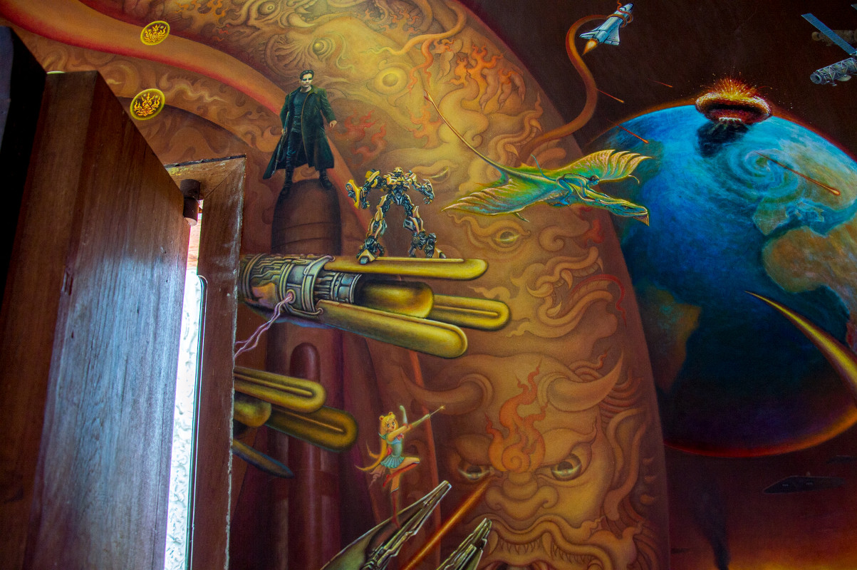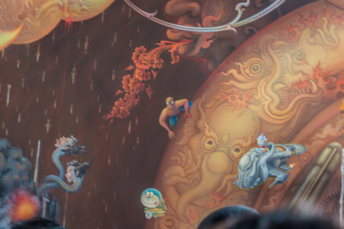 Wszystko zmienia się o 180 stopni gdy wchodzimy do wnętrza świątyni. Szczerze mówiąc, poczułam się jakby ktoś ze mnie ostro zakpił. A dokładniej jej architekt – Chalermchai Kositpipat, nazywany czasem tajskim Gaudim. Ściany świątyni zdobią ogromne freski / murale?, na których znajdziecie wszystko co dusza zapragnie – jest tam Hello Kitty, statki kosmiczne, kung fu Panda, Budda w masce p-gaz, Neo z Matrixa, spiderman, wybuchy nuklearne i co jeszcze dusza zapragnie, albo raczej nie zapragnie. Podobno ma to ukazywać, że świat jest generalnie złym miejscem, ale sposób przekazu zdecydowanie do mnie nie przemawia. Poniższe zdjęcia dzięki Harry’emu Lee, któremu udało się je w ukryciu wykonać.