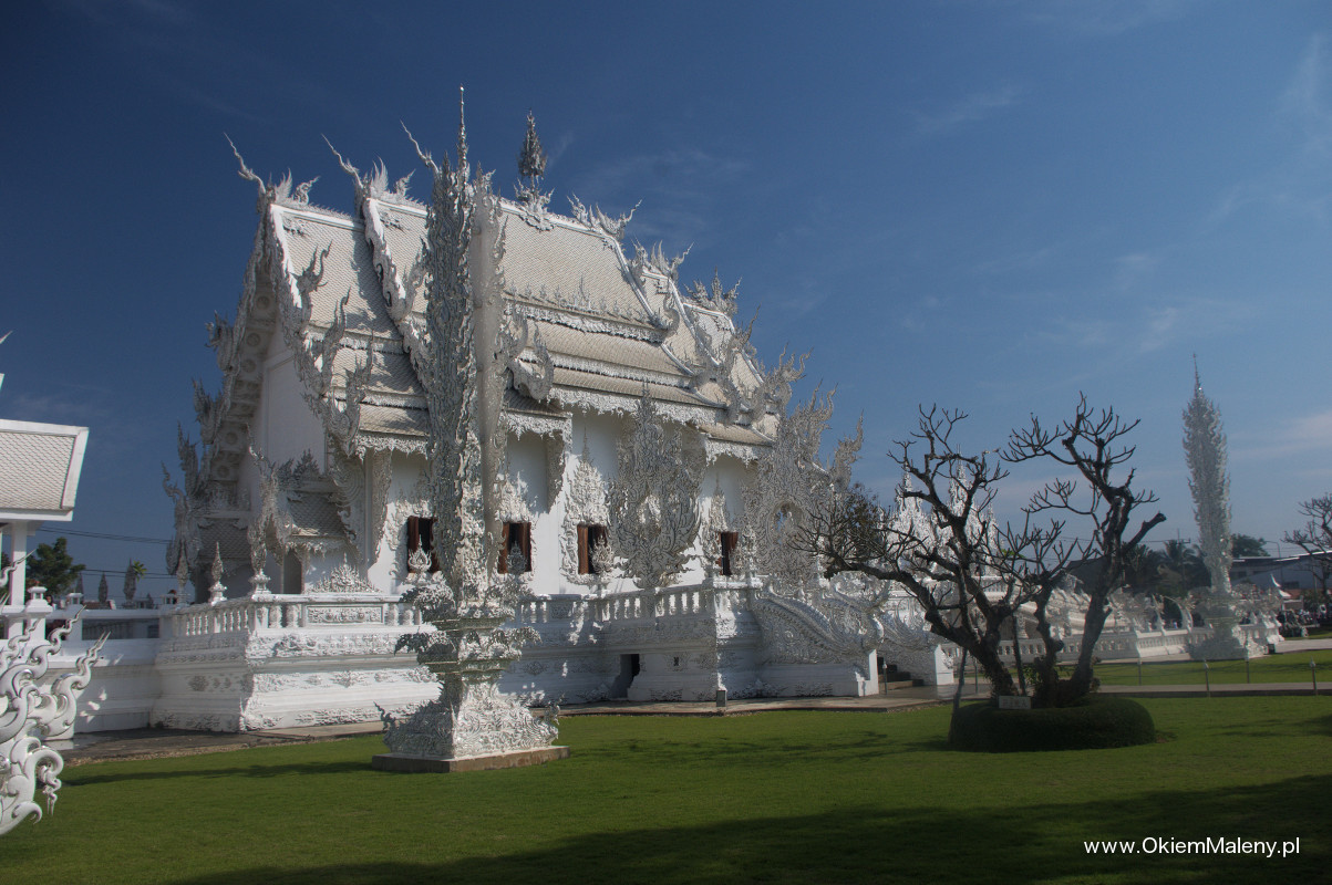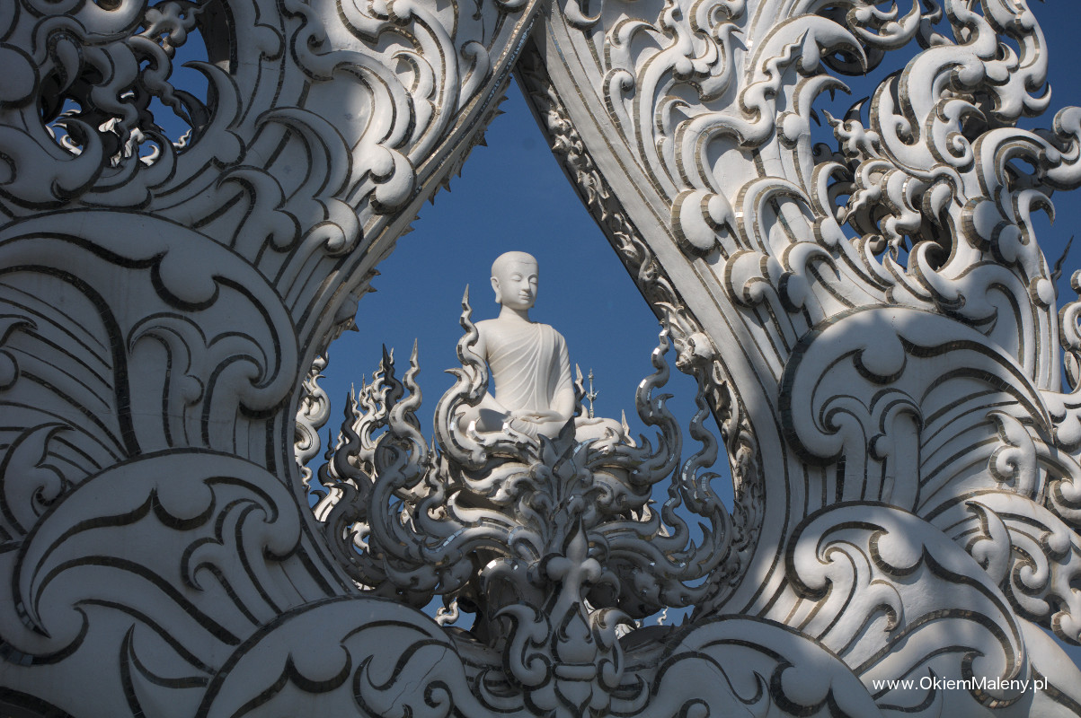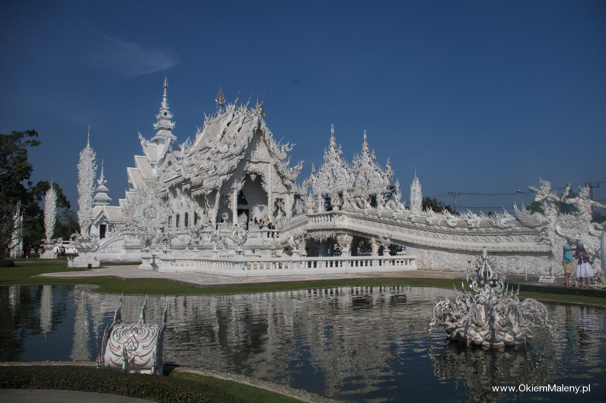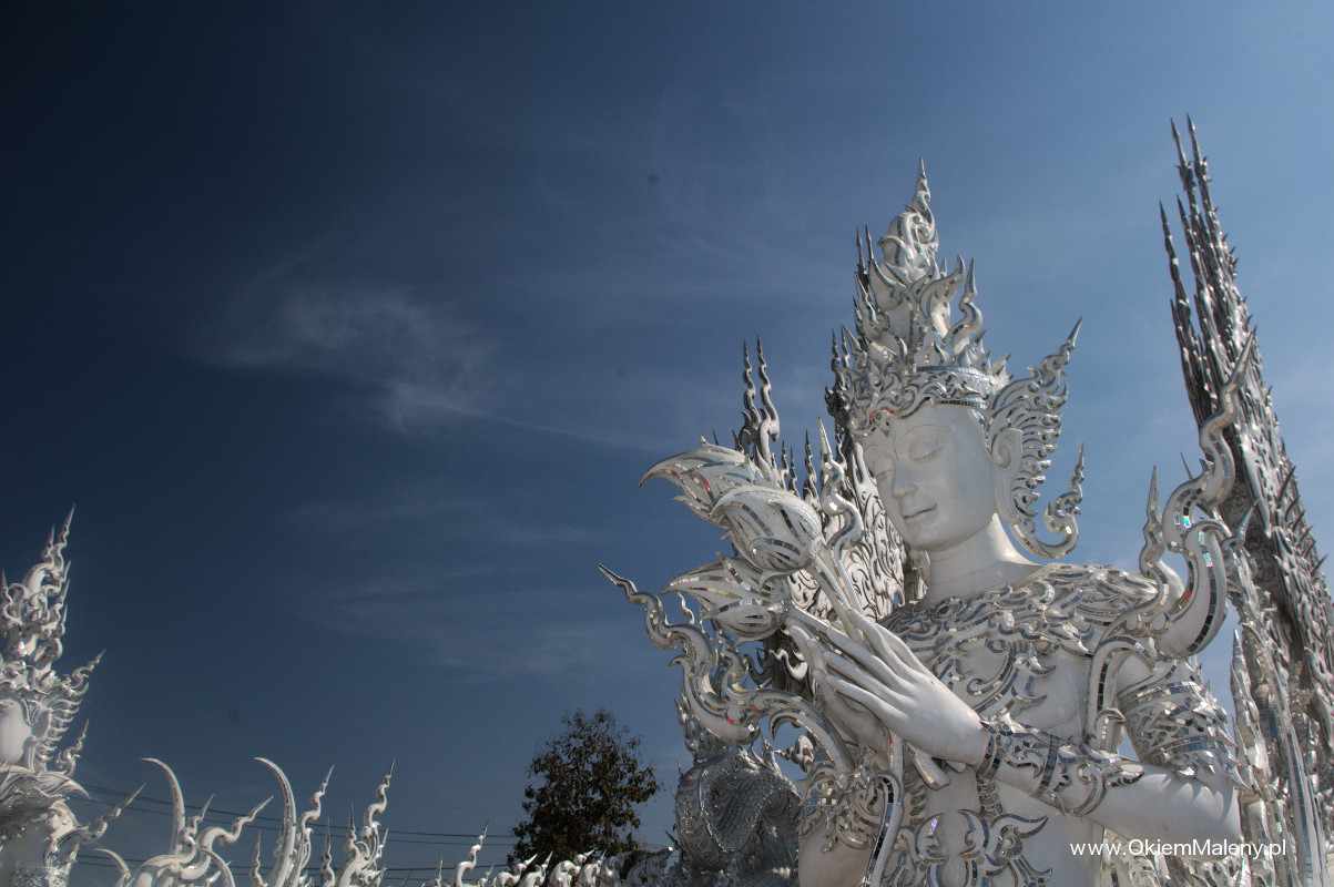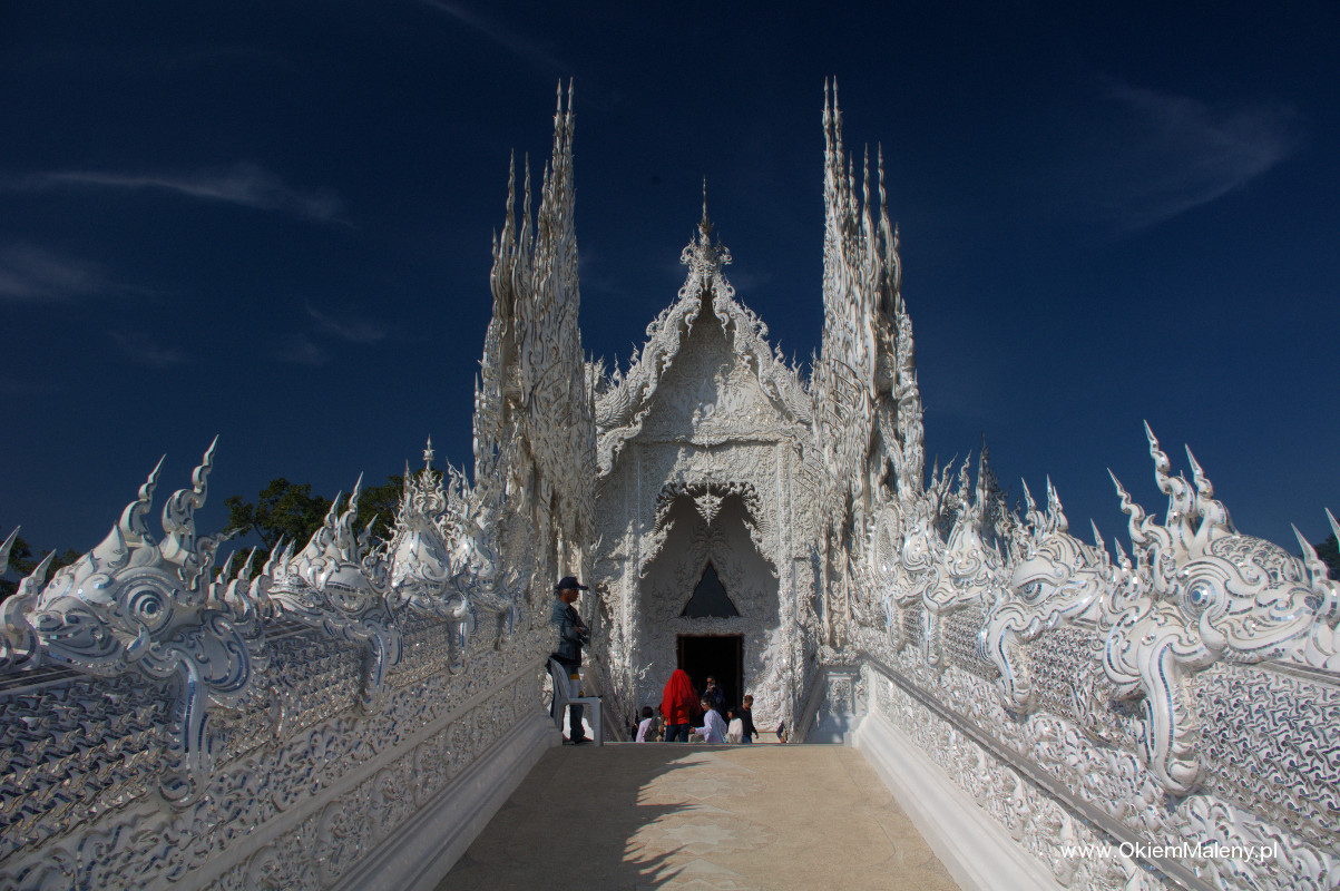 Ale od początku. Autobus z Chiang Mai wyrzuca nas kilkaset metrów od świątyni, nie jest widoczna z głównej drogi. Dobrze zaznaczyć kierowcy, że chcecie wysiąść przy świątyni, nie musicie potem wracać się ze stacji autobusowej w centrum miasta. Widzimy w oddali niesamowitą biel na idealnie błękitnym niebie. Wrażenie niesamowite. Świątynia prezentuje się bardzo okazale. Jednak im bliżej się podchodzi tym więcej zaskakujących elementów, które nijak tu nie pasują.