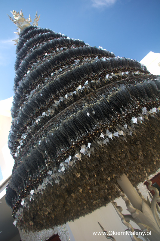 Po wejściu na teren przyświątynny robi się dużo spokojniej. Wat Rong Khun prezentuje się naprawdę okazale. Jej wspaniała biel kontrastuje z kolorami nieba i trawy, jej sylwetka odbija się w sztucznym jeziorku. Z prawej strony ogromne parasole wotywne, z lewej świątynia. Jest cała rozrzeźbiona, wygląda jak utkana z koronki.Do świątyni wchodzi się przez wielki most symbolizujący cykl odrodzenia, strzeżony przez Strażników – pół ludzi, pół ptaków. Przy wejściu na most po obu stronach z ziemi wyłaniają się setki żebrzących rąk. Ja miałam wrażenie, że te ręce raczej chcą złapać przechodnia, zwieść z drogi. Podobno symbolizują niepohamowane pragnienia i chciwość co nawet by się zgadzało.