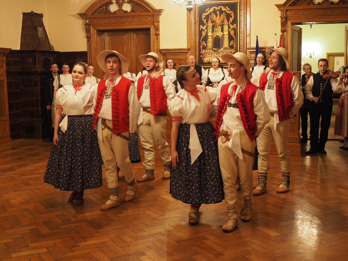 Miasto Cieszyn ugościło blogerów czym chata bogata dosłownie i w przenośni. Pierwszego dnia przywitał nas w sali obrad ratusza miejskiego Burmistrz miasta Cieszyna oraz Burmistrz Czeskiego Cieszyna. Po części oficjalnej był pokaz tańca regionalnego. Niespodzianką była nauka tańca – uwaga, uwaga mój talent taneczny został doceniony. Rodzina na tę wieść prawie zachłysnęła się herbatą, gdyż moje umiejętności są często dobrym materiałem na anegdotki – a tu proszę, razem z Dorotą z via mundo wygrałyśmy piękne parasole z logo Cieszyna.