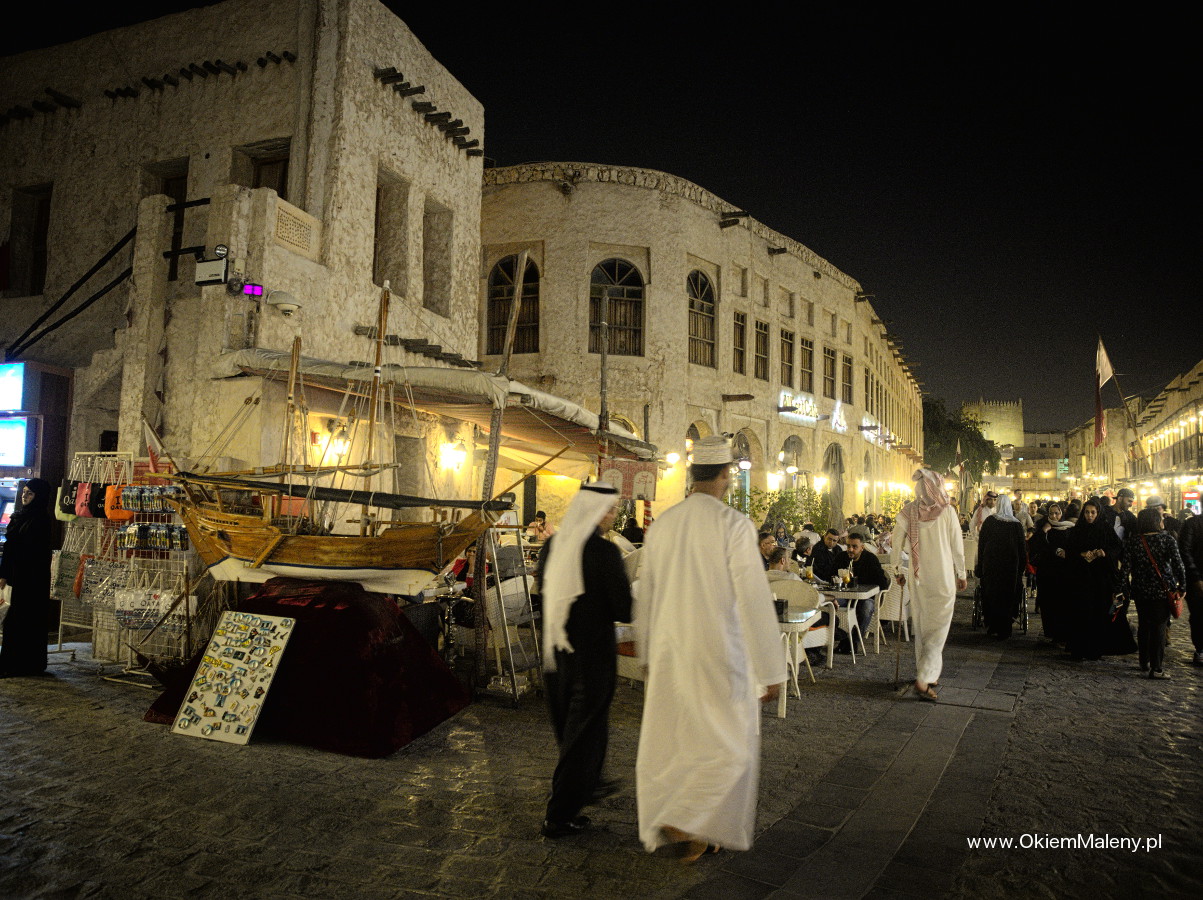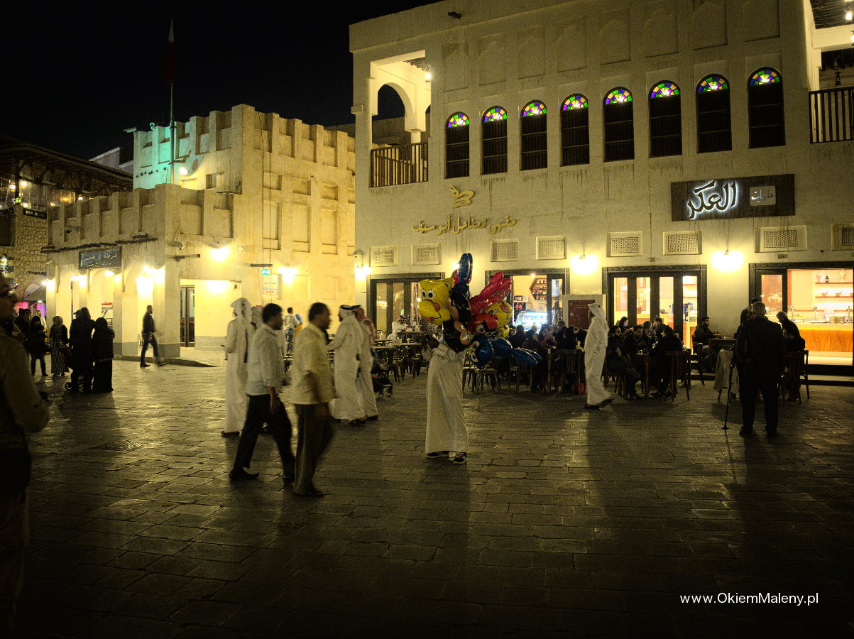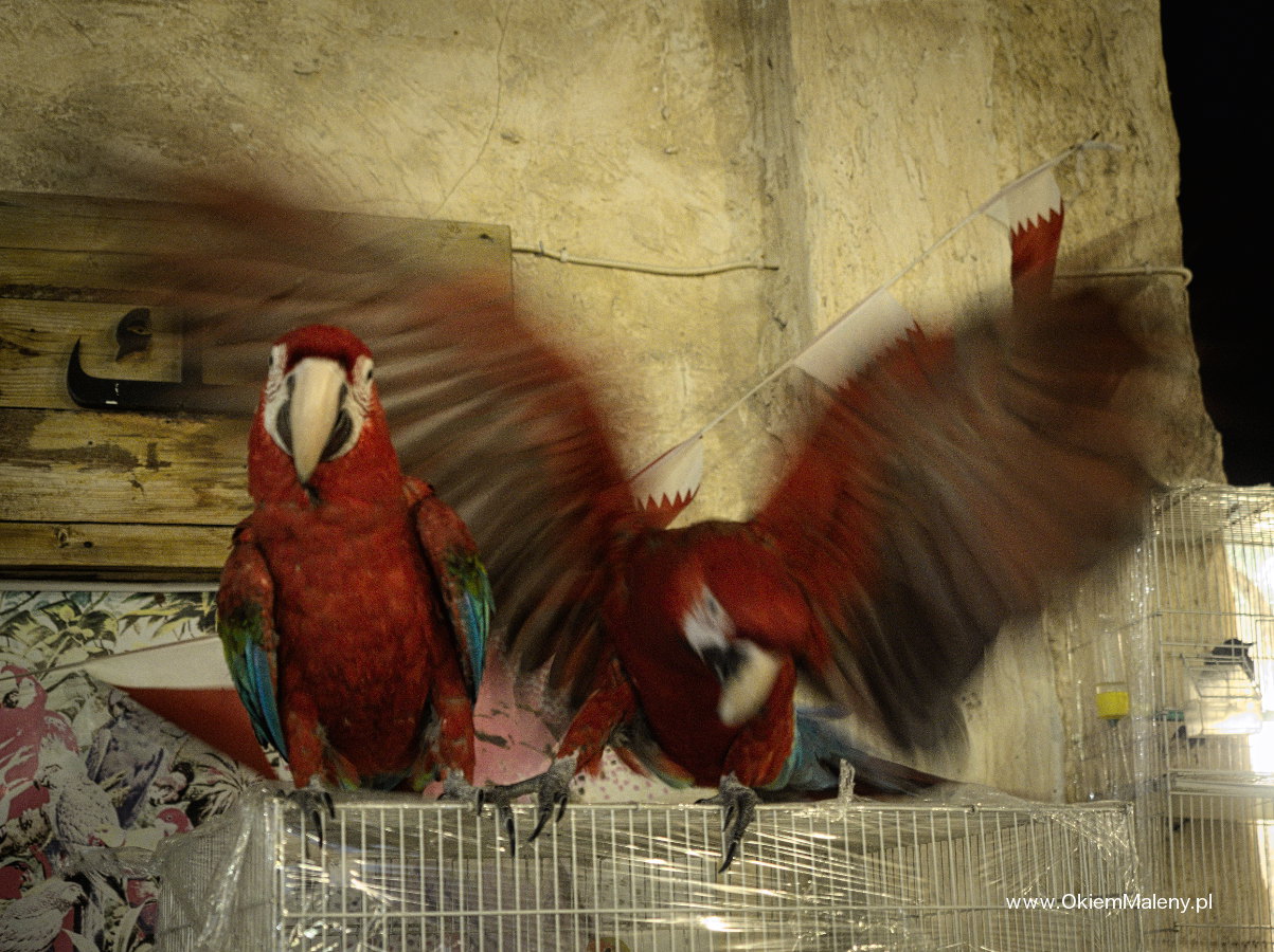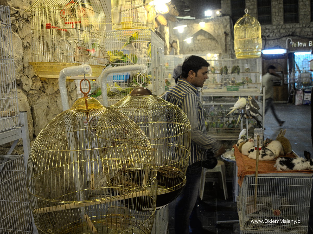 Ostatnim punktem programu były odwiedziny na typowym katarskim targu. Znajduje się tam wiele knajpek, kafejek, sklepików i kramów. Warto zapuścić się w plątaninę wąskich uliczek. Tak trafiliśmy na mini targ ze zwierzętami. Były tam setki klatek z przeróżnymi ptakami. Oczywiście największe wrażenie robiły ogromne papugi. Oprócz ptactwa roiło się od miniaturowych króliczków. Większość była ubrana w sukieneczki.