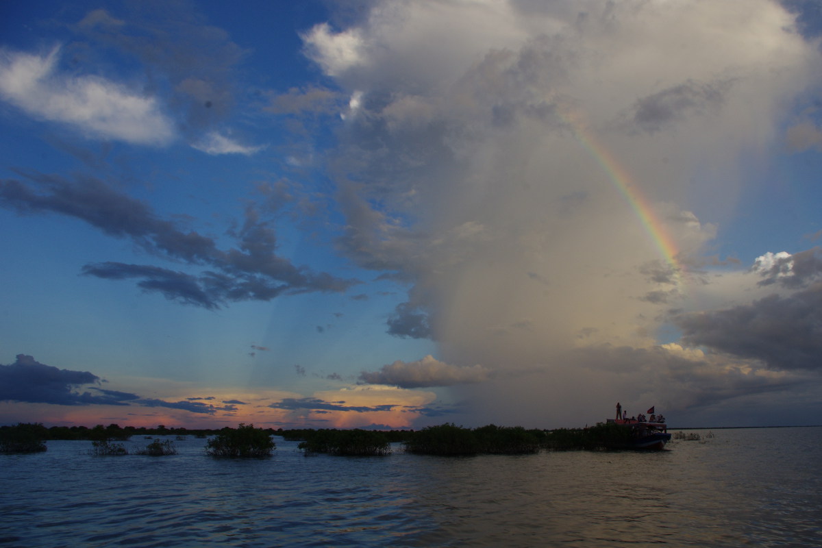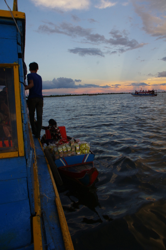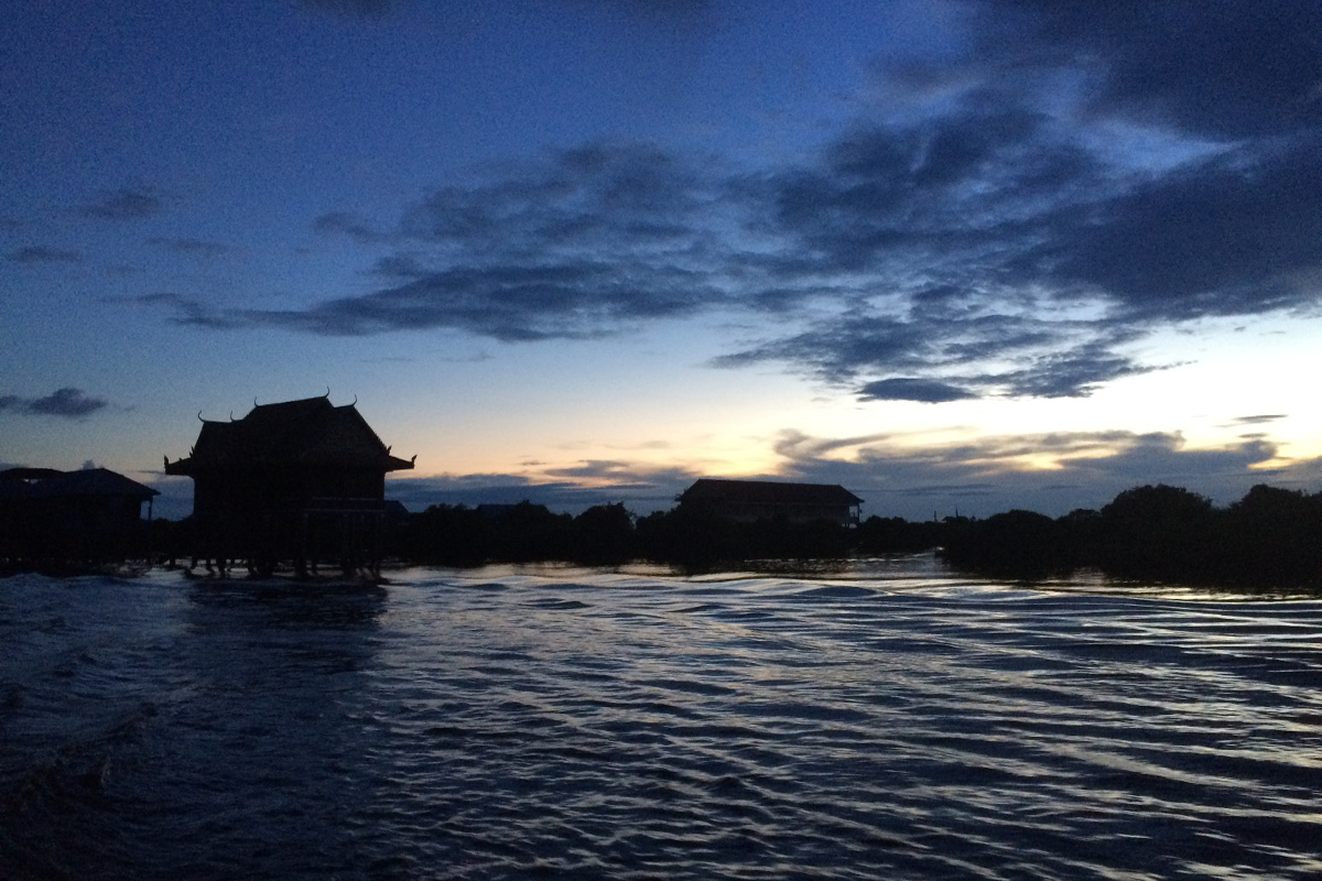 Wioska Kampong Phluk o tej porze dnia robiła niesamowite wrażenie. Kolorowe domy, łodzie, mętna woda odbijała całą feerię barw. Jeśli będziecie planowali wizytę w pływających wioskach postarajcie się być tam przed zachodem słońca. Naprawdę warto. Wracaliśmy po zachodzie Słońca. W wiosce panowała ciemność, gdzieniegdzie tliło się jakieś światło. Światło naszej łódki zwołało wszystkie komary i inne latające stworzenia z okolicy. Na łódce na chwile zapach spalin przyćmił specyficzny zapach muggi. Na horyzoncie szalała burza, srebrzyste pioruny rozdzierały ciemne niebo.