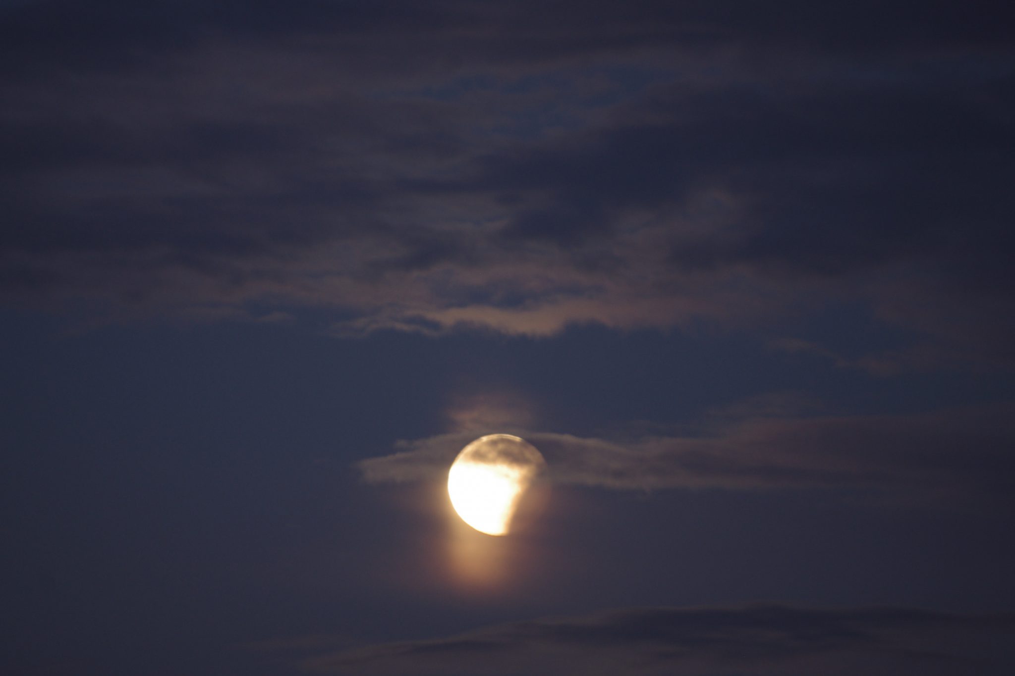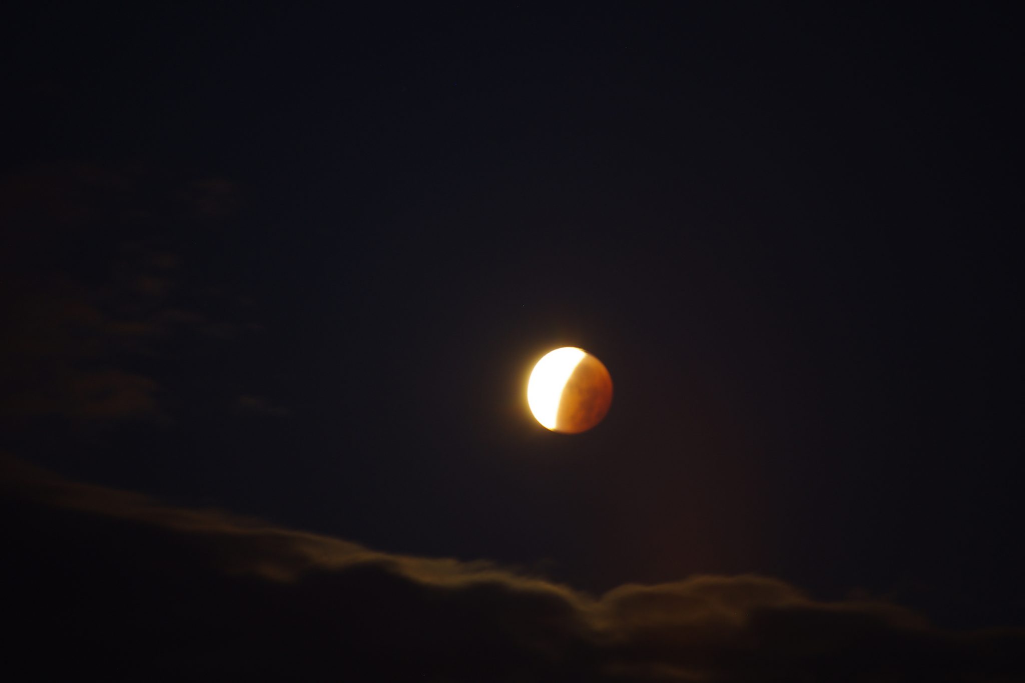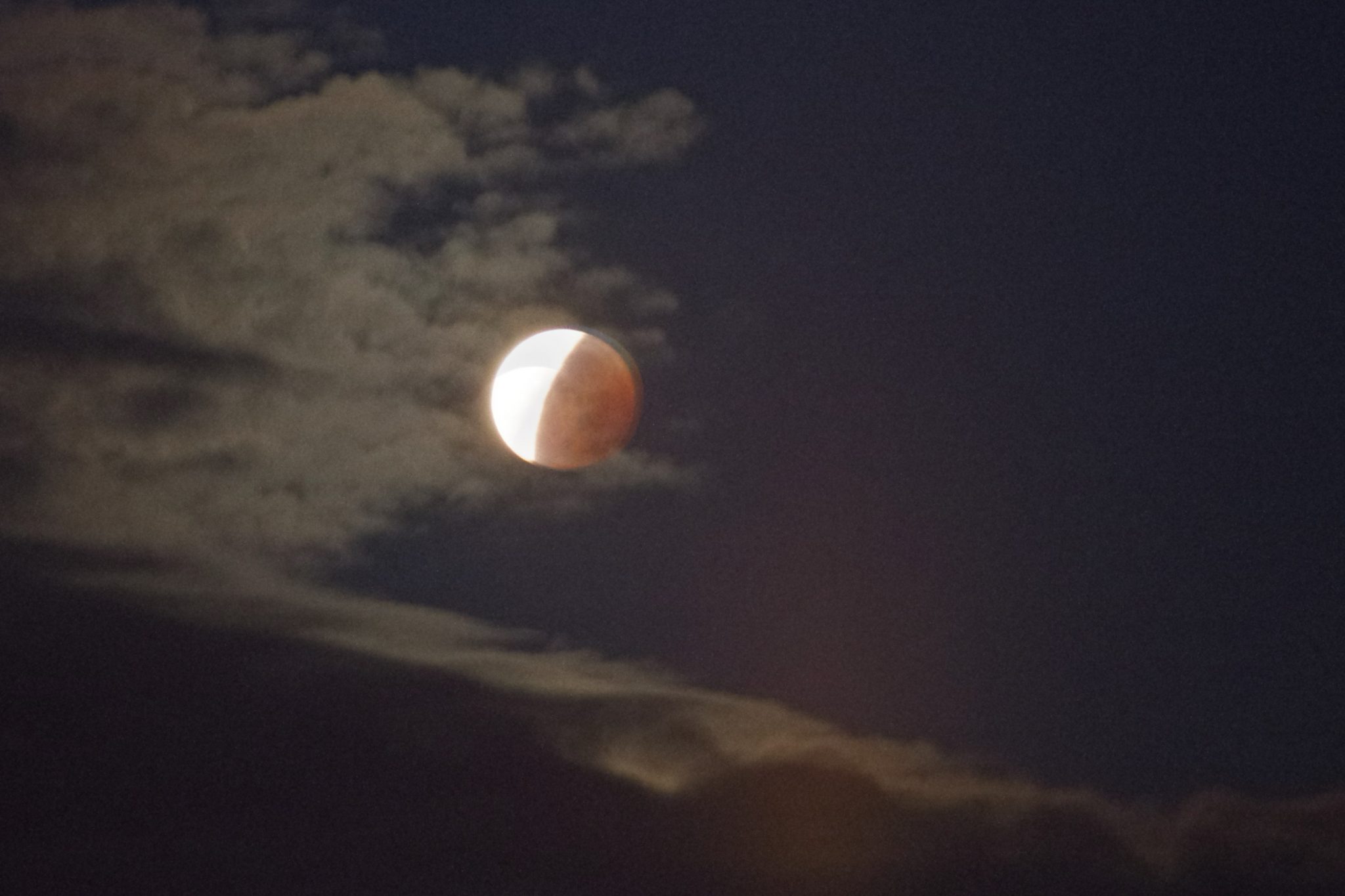 3.44 budzik dzwoni. Wstaję jak żołnierz, wyłączam dwa kolejne budziki nastawione na wszelki wypadek. Rzut oka za okno – chmur brak, po omacku nałożyłam bluzę. Oczyma wyobraźni widziałam już tę wielką, ognistą kulę, która będzie celem mojego obiektywu. Wyszłam ze statywem i poczułam wielkie rozczarowanie. Co taki mały? To ma być ten super księżyc? Super to on był jakieś 7 godzin temu. No nic. Niecierpliwie czekałam na 4.11 kiedy miało być perygeum, no i zaćmienie całkowite. Mały, bo mały, ale jeszcze wyobraźnia malowała obrazy niesamowitej krwistej kuli. Być może to wina miejskich świateł, choć koło mnie za dużo ich nie ma, jednak kolor też taki już sprany kilka razy był. Na dodatek chmury pojawiły się kilka minut po zaćmieniu i zamiast stworzyć niesamowitą scenerię to po prostu zasłoniły wszystko. Niepocieszona wróciłam spać.