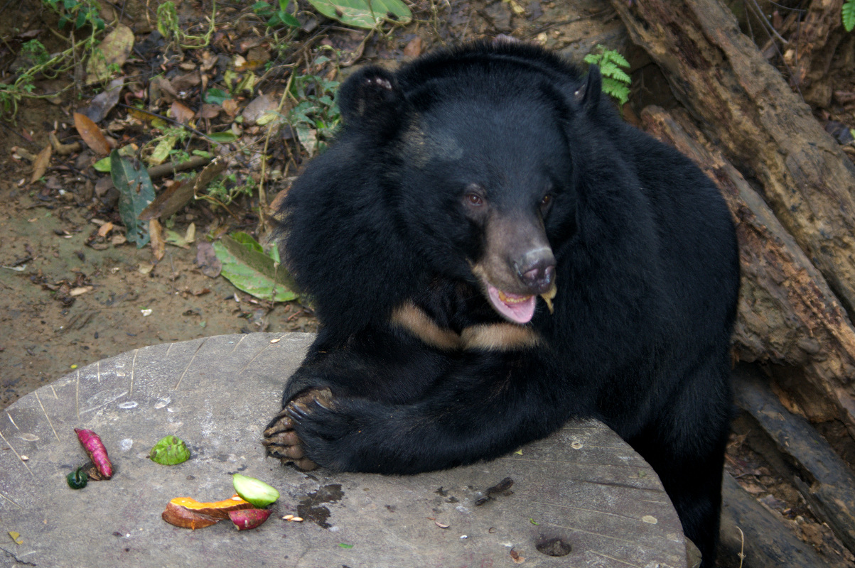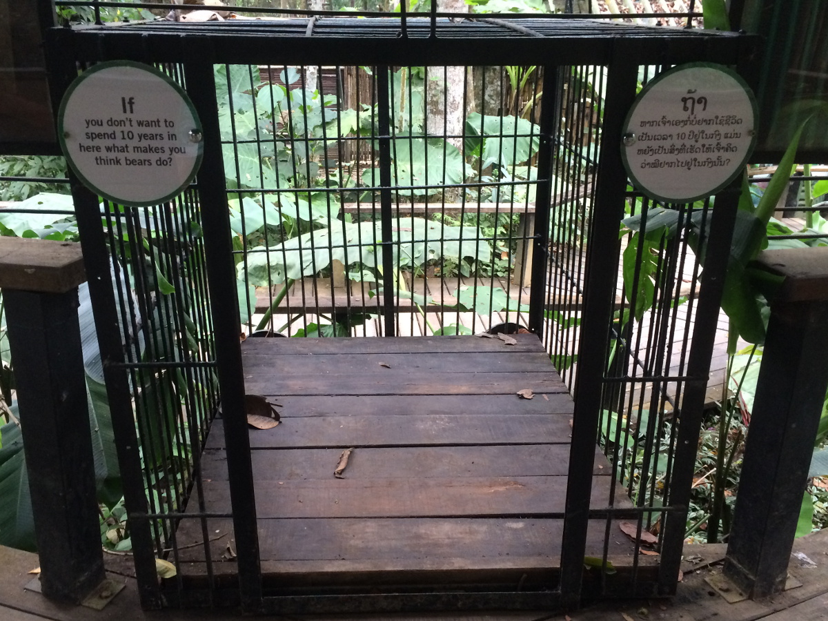 W Luang Prabang przeżyłyśmy załamanie pogody w Azji. W Hong Kongu było najzimniej od 60 lat, w Wietnamie zmarli turyści z wychłodzenia organizmu, a w Luang Prabang wszyscy zamarzali moknąc w strugach deszczu. W tych niesłychanie malowniczych okolicznościach przyrody, totalnie zamarznięte i zrezygnowane, pijąc gorącą herbatę podjęłyśmy decyzję. Trudno, jedziemy. W songthaew zamarzałyśmy jeszcze bardziej smagane zimnym wiatrem. Ja, z marsową zapewne miną, obserwowałam sino-szare niebo. Pierwsza rzeczą po przybyciu był zakup gorącej herbaty.Ogrzewając się kubkami trzymanymi w dłoni wyruszyłyśmy zwiedzać wodospady Kuang Si. Przy tej pogodzie nie spodziewałam się rewelacji. Pierwszym punktem jest schronisko czarnych niedźwiedzi azjatyckich. Miśki zostały odratowane z rąk handlarzy i oszczędzono im spędzenia życia w klatce metr na metr lub zabicia z uwagi na organy wykorzystywane w medycynie naturalnej.