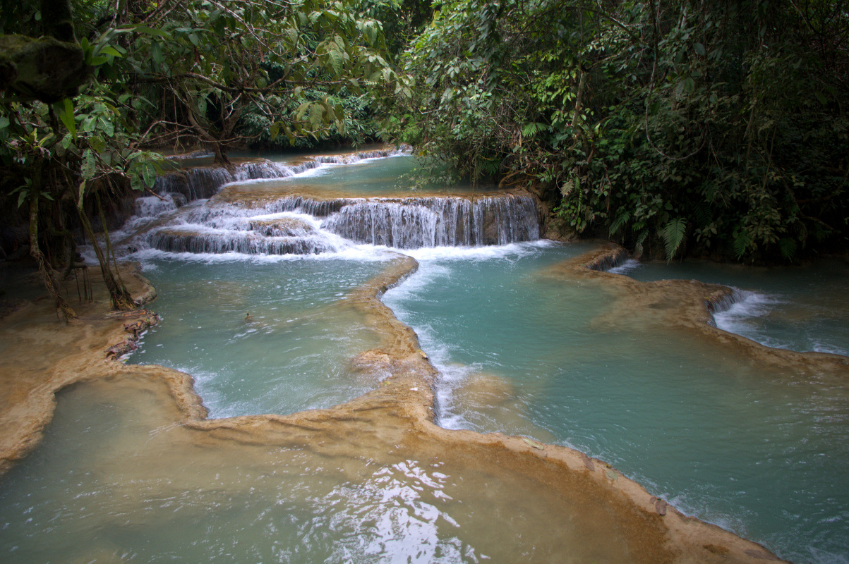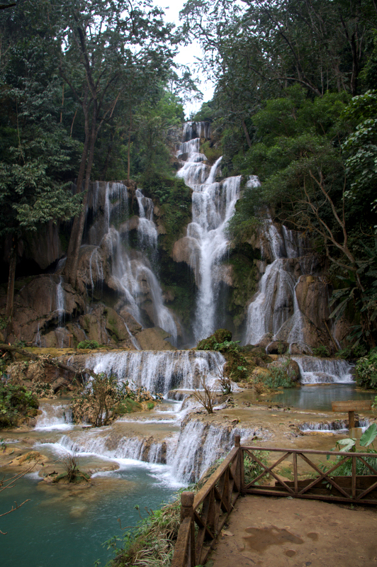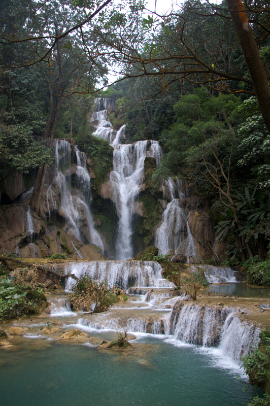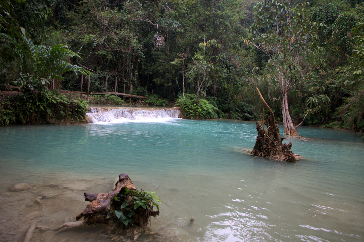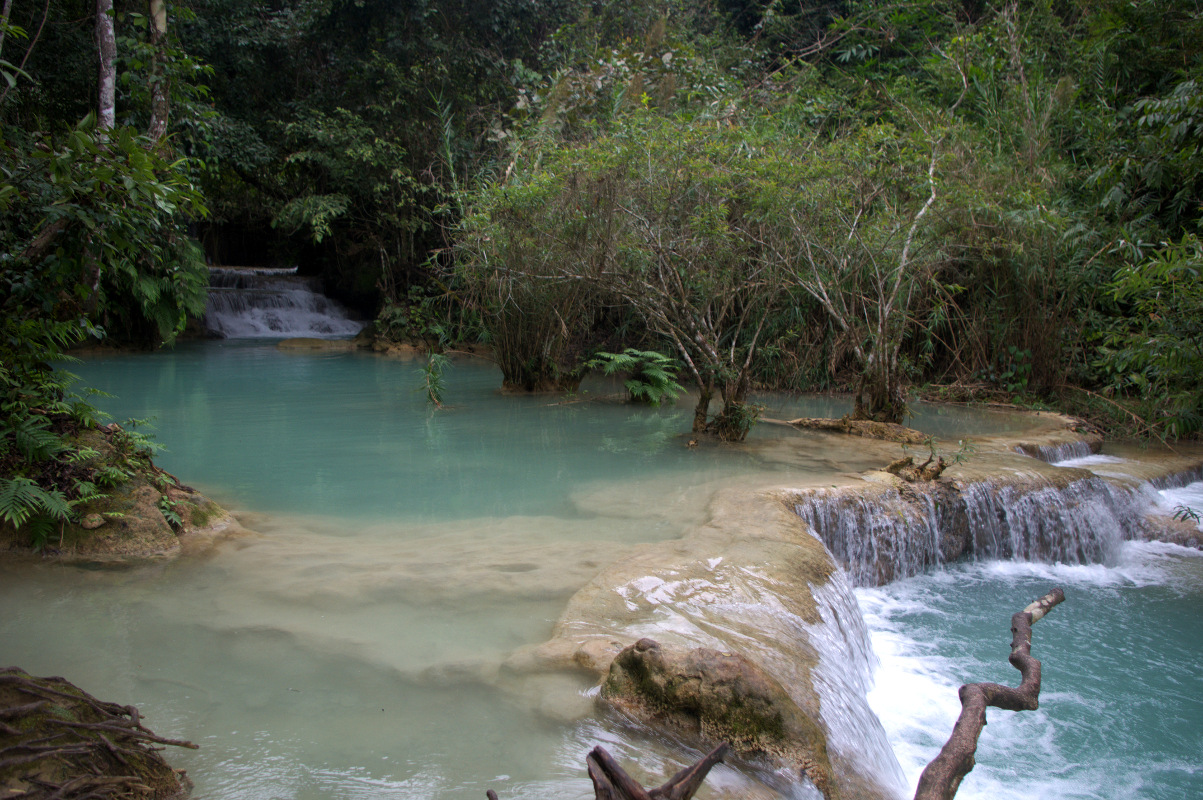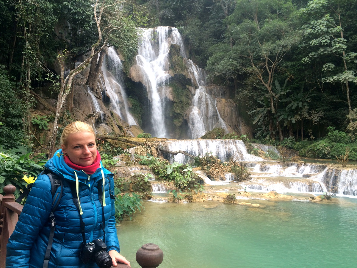 Po przejściu kilku metrów naszym oczom ukazują się pierwsze kaskady wodospadu Kuang Si. Są oszołamiająco piękne. Mimo szarego nieba, zimna, braku dobrego światła robią wrażenie bajkowego krajobrazu. W moim dzienniku pisanym dzień pózniej porównałam je z Batadem na Filipinach: […] Potem szwendałyśmy się po mieście zamarznięte i milczące. Wreszcie padła decyzja. Jutro wyjeżdżamy do Wientianu nocnym autobusem, a póki nie pada jedziemy obejrzeć wodospad Kuang Si. I to była dobra decyzja z kilku powodów. Po pierwsze dziś leje i z wodospadów nici, po drugie spacer nas obudził, dodał energii. Wodospad, który był głównym powodem przyjazdu do Laosu prezentował się cudownie nawet w pochmurnym niebie. Niesamowicie piękny. Tak piękny ze można by było tam zostać, siedzieć i podziwiać bez końca. W takich chwilach szkoda iść dalej. Tak było w Batadzie na Filipinach – miejsce, z którego odchodzi się zostawiając kawałek serca.
