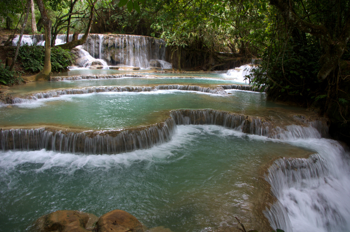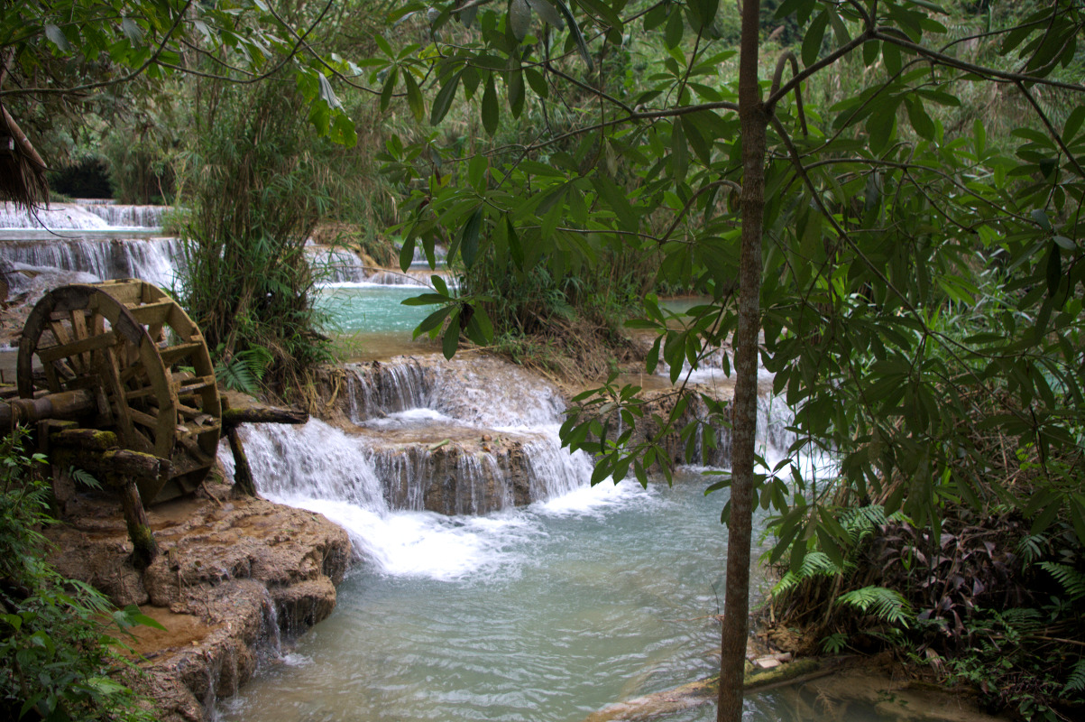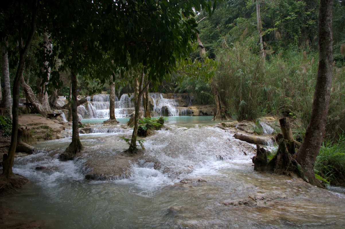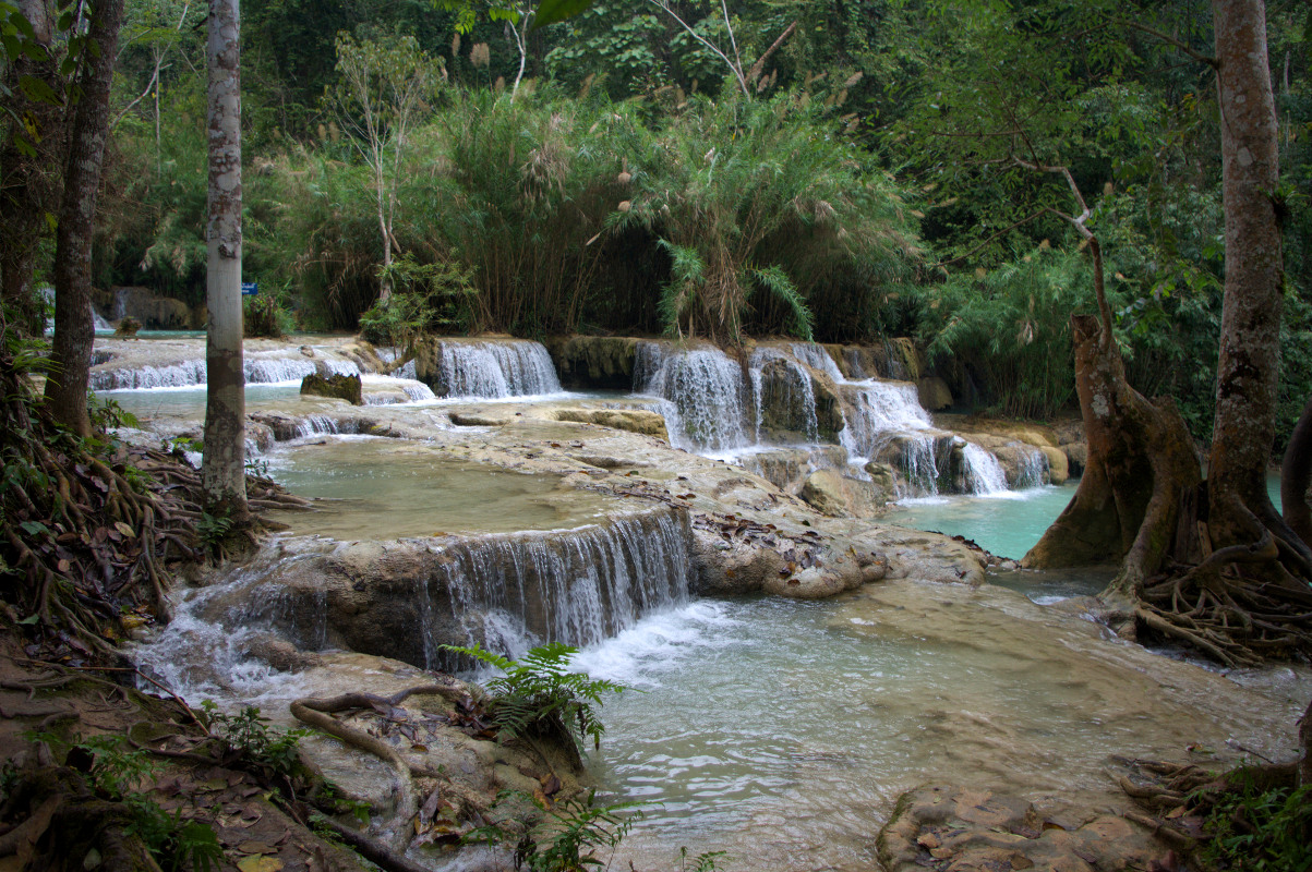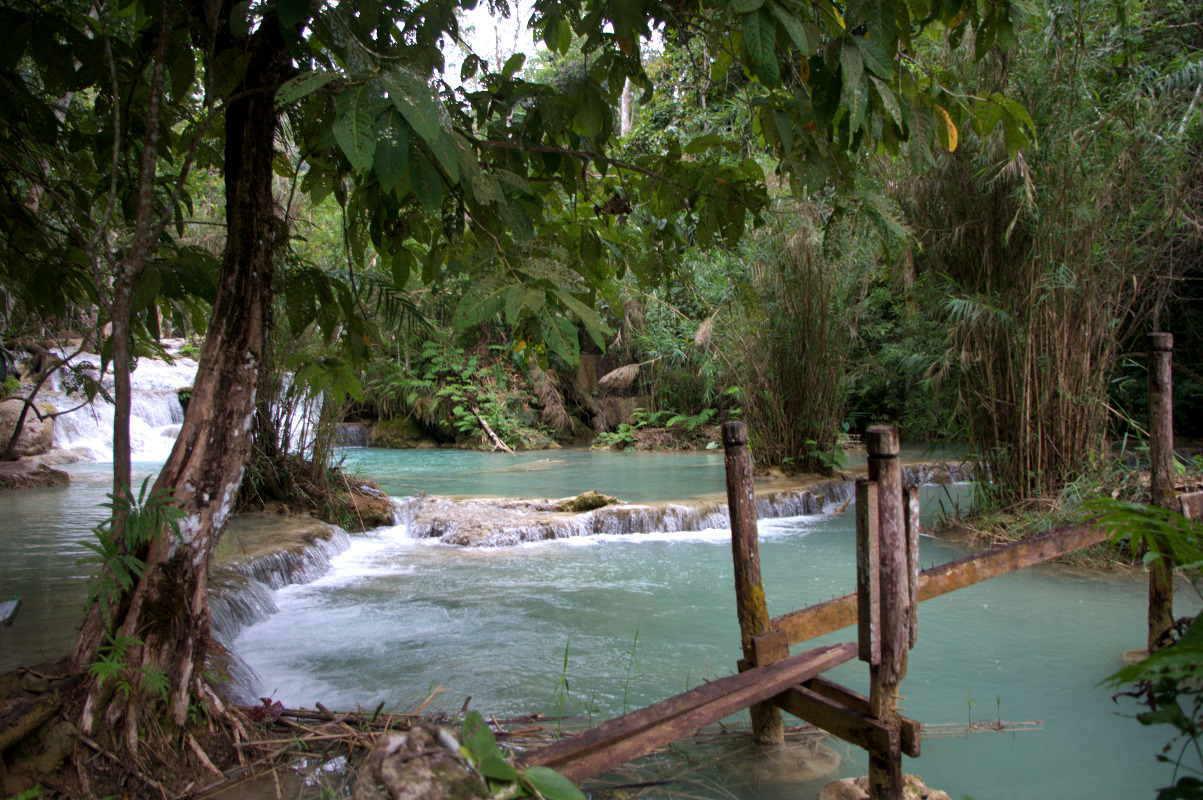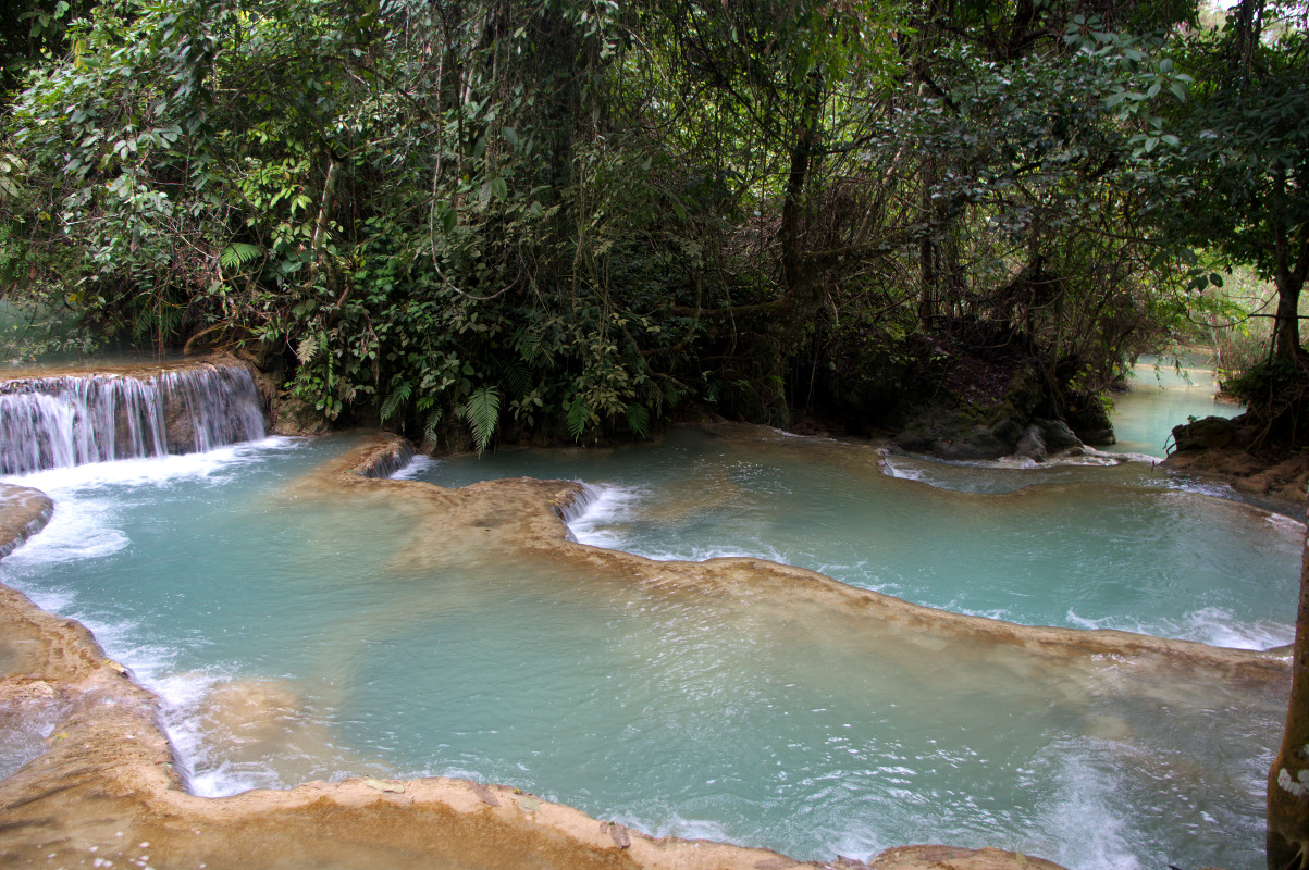 Po przejściu kilku metrów naszym oczom ukazują się pierwsze kaskady wodospadu Kuang Si. Są oszołamiająco piękne. Mimo szarego nieba, zimna, braku dobrego światła robią wrażenie bajkowego krajobrazu. W moim dzienniku pisanym dzień pózniej porównałam je z Batadem na Filipinach: […] Potem szwendałyśmy się po mieście zamarznięte i milczące. Wreszcie padła decyzja. Jutro wyjeżdżamy do Wientianu nocnym autobusem, a póki nie pada jedziemy obejrzeć wodospad Kuang Si. I to była dobra decyzja z kilku powodów. Po pierwsze dziś leje i z wodospadów nici, po drugie spacer nas obudził, dodał energii. Wodospad, który był głównym powodem przyjazdu do Laosu prezentował się cudownie nawet w pochmurnym niebie. Niesamowicie piękny. Tak piękny ze można by było tam zostać, siedzieć i podziwiać bez końca. W takich chwilach szkoda iść dalej. Tak było w Batadzie na Filipinach – miejsce, z którego odchodzi się zostawiając kawałek serca.