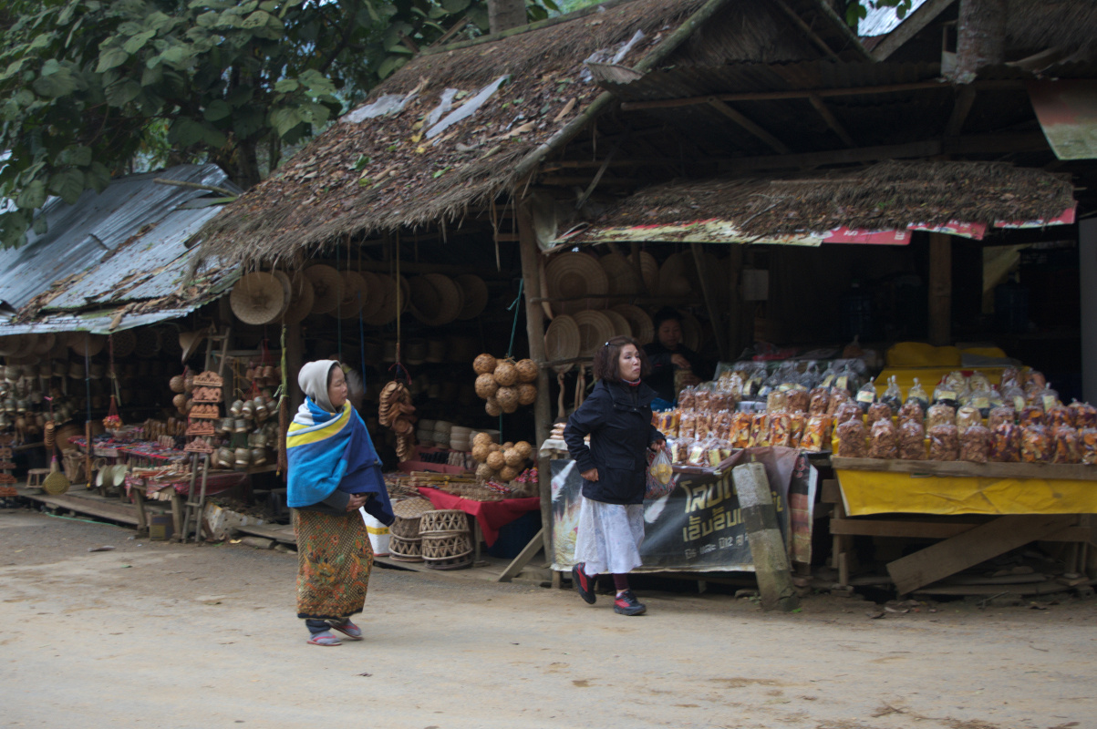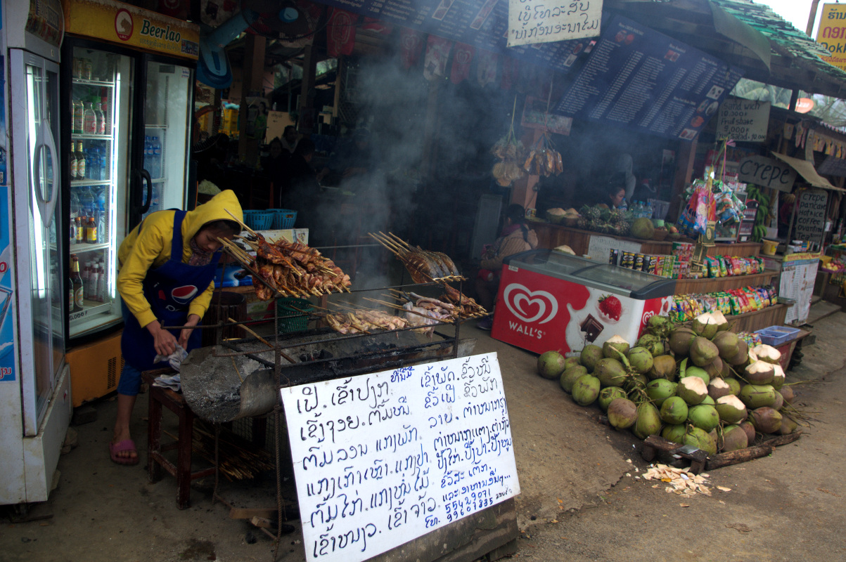 Wodospady są oddalone od Luang Prabang o około 45 km (więcej o Luang Prabang przeczytacie tu: [KLIK]). W dawnej stolicy Laosu znajdziecie multum wycieczek do tych wodospadów, jednak warto to zrobić samemu. Wystarczy zaczepić pierwszego lepszego kierowcę songthaew. Przejazd kosztuje 200.000 kip (8.000 kip = 1 $). Nie martwcie się nie zapłacicie tej ceny – kierowca bardzo sprawnie sam zorganizuje grupę, pytając przechodniów, czy aby nie mają ochotę na wycieczkę do wodospadu. I tak cena od osoby spada niepostrzeżenie do 50.000 kip za przejazd w dwie strony – songthaew czeka na was 2 godziny, przejazd trwa około godzinę. Bilet wstępu kosztuje 20.000 kip. Przed wejściem do wodospadów jest multum straganów z jedzeniem i pamiątkami. Napewno nie będziecie mieli okazji zgłodnieć. Z uwagi na pogodę my pierwsze kroki skierowałyśmy ku straganowi z gorącą herbatą.