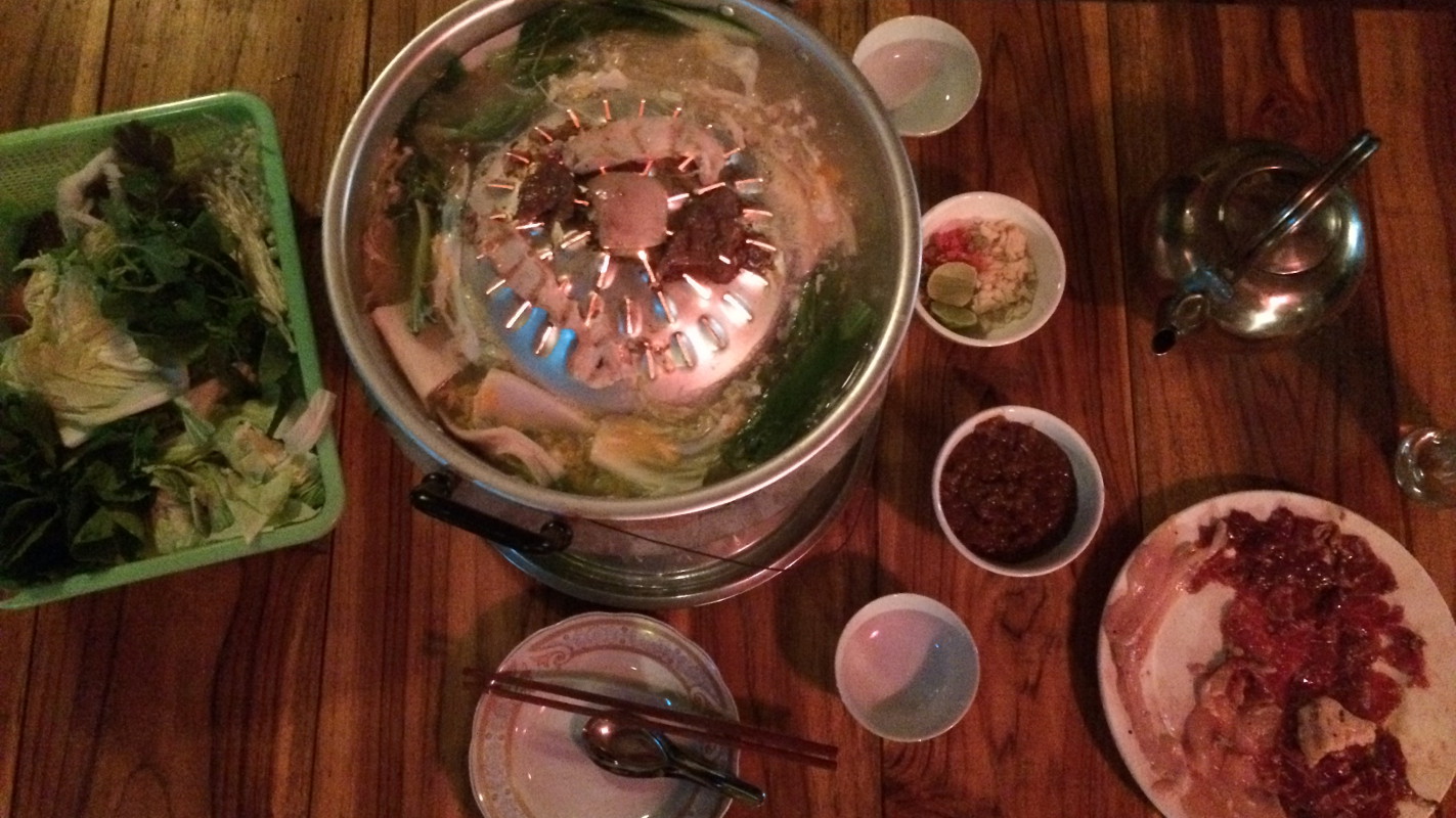 Odkrycie z Nong Khiaw. Jesli lubicie zabawy typu fondue, gdzie samemu trzeba się troche pobawić nim coś zjecie napewno przypadnie Wam do gustu. Dostaniecie puzzle i trzeba je połączyć. Najpierw na stół przybędzie żeliwny kociołek z żarzącymi się węglami i stalową nakładką. Kolejny element to czajniczek w bulionem, koszyk zieleniny i grzybów, makaron, surowe mięso, solidny kawał słoniny i jajko. Co dalej? Bulion wlewamy do rynienki i w nim gotujemy makaron i warzywa z grzybami, skorupkę jajka zręcznie przebijamy pałeczką i wlewamy do bulionu. Wierzchołek nakładki smarujemy słoniną i kładziemy cienkie plastry mięsa. I tak powoli sobie jemy, dokładamy składniki. Bardzo smaczne i przy okazji fajna zabawa.