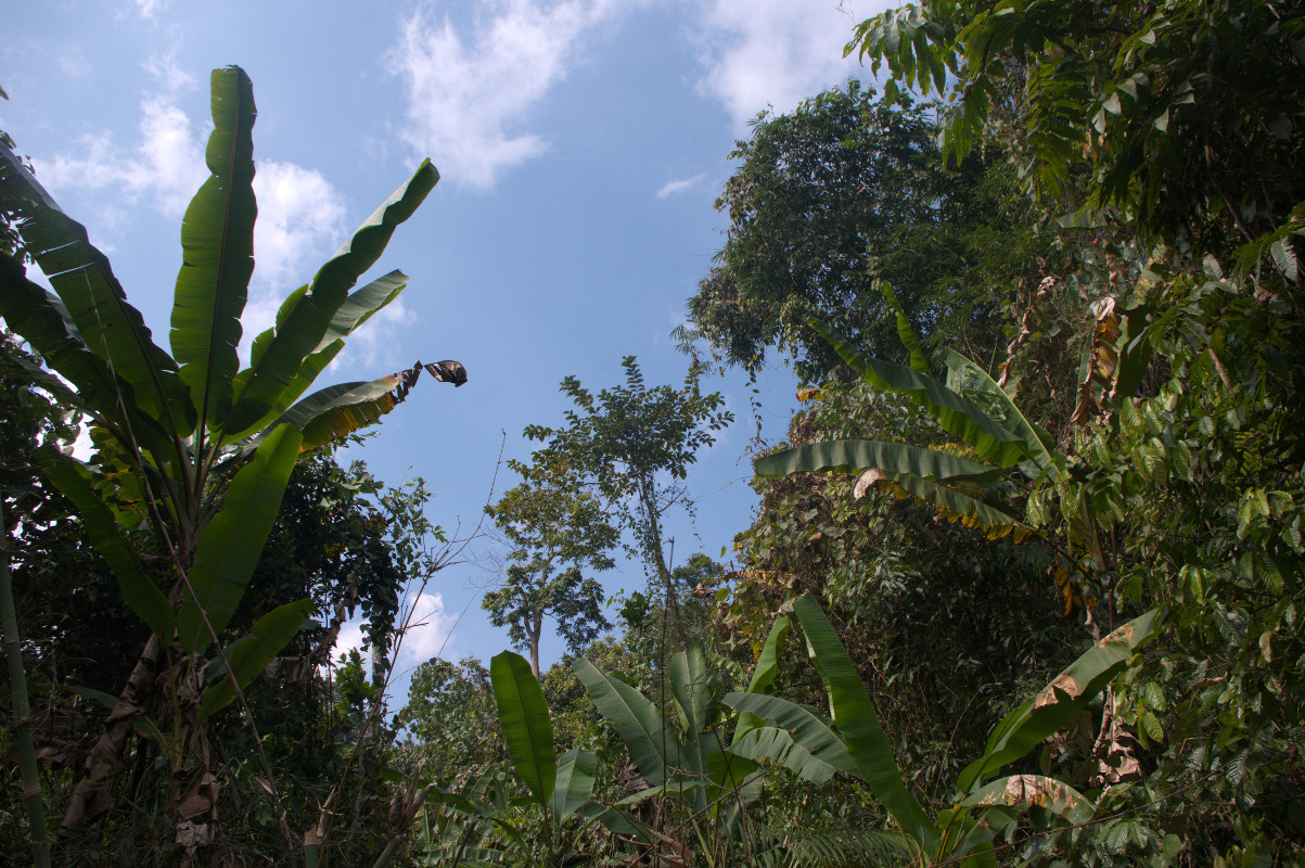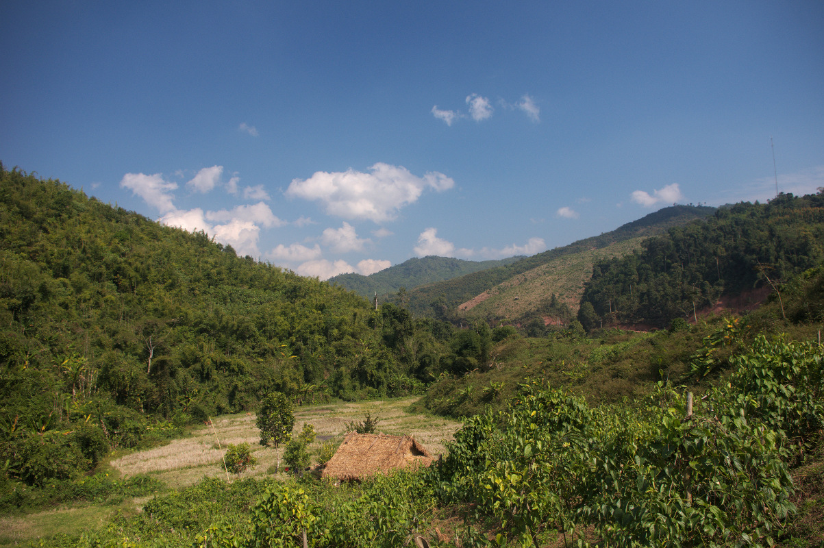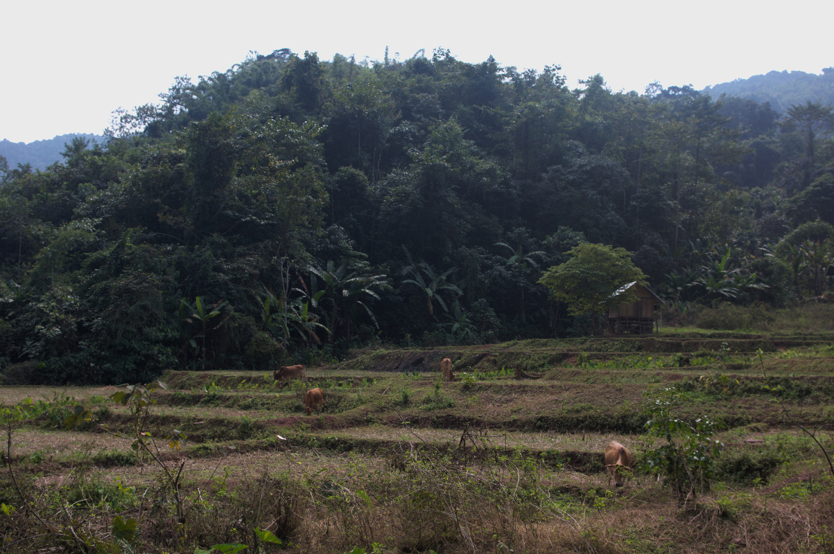 Krajobraz dość szybko się zmienił. Wyszliśmy z dżungli i zaczęliśmy wędrować po odsłoniętym terenie wśród dawnych pól ryżowych. W napotkanym bambusowym szałasie zrobiliśmy chwile przerwy. Nasi przewodnicy dostrzegli drzewo pomelo i już po chwili jedliśmy pomelo prosto z drzewa. Co ciekawe nasi przewodnicy jedli je z solą.