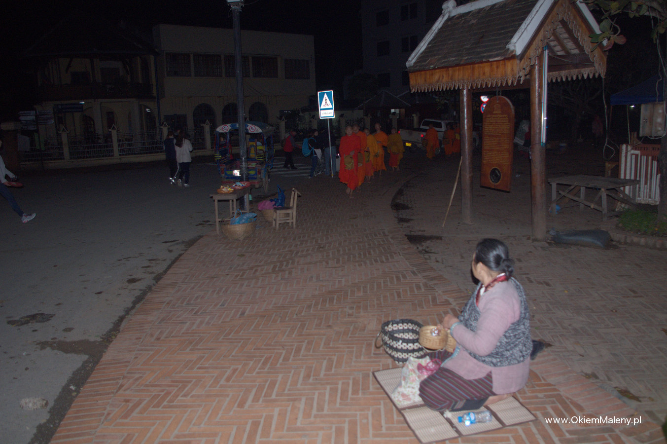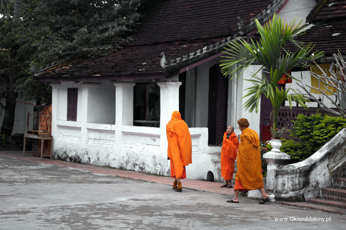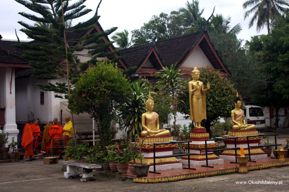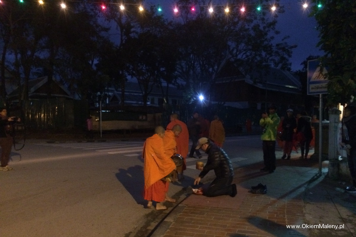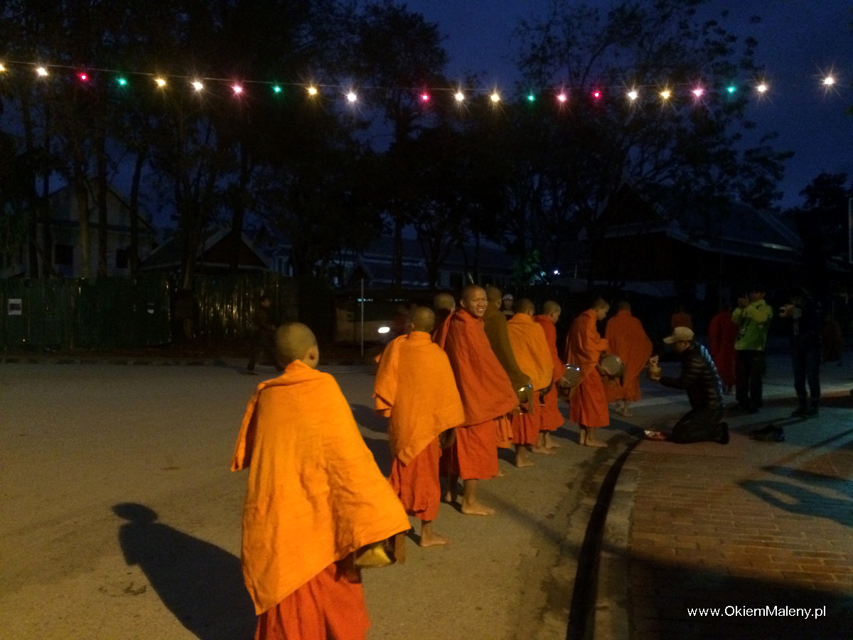 Luang Prabang słynie z porannej procesji mnichów. Codziennie o wschodzie słońca mnisi wyruszają zbierać dary od wiernych. Wierni klęczą wzdłuż ulicy, przed sobą na matach mają dary – ryż, owoce, słodycze. I tak ulice miasta o wschodzie słońca nabierają pomarańczowego koloru od szat około 200 mnichów, którzy wędrują wśród wiernych w ciszy i spokoju zbierając jałmużnę. Tyle teorii. W praktyce jest nieco inaczej.
