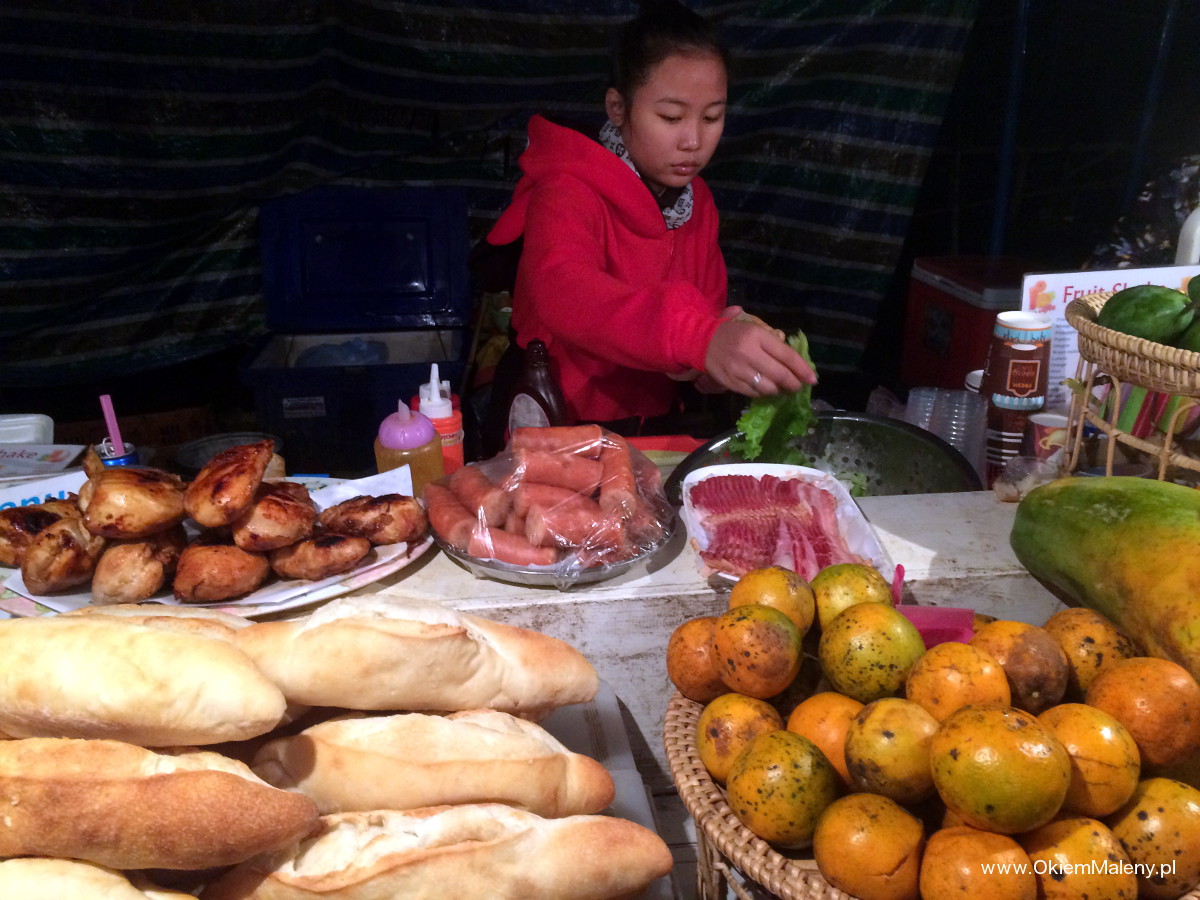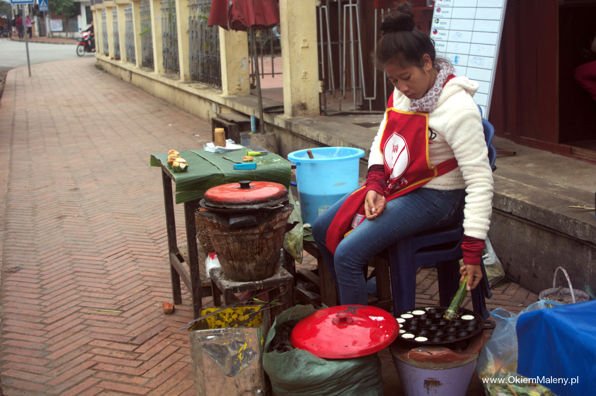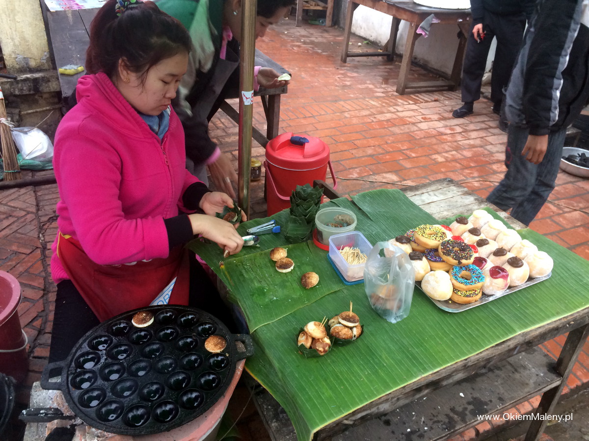 Bagietki, a dokładniej bagietko – kanapki. Taka pozostałość po francuskiej koloni. Do wyboru, do koloru. Wszystkie zawierają surowe warzywa, więc teoretycznie powinny być omijane z daleka. Ich zaletą był fakt, że po pierwsze były smaczne, po drugie bardzo sycące po trzecie rozbite namioty oferowały dach nad głową i schronienie od deszczu po czwarte była tam również gorąca herbata i pyszna kawa. W Luang Prabang odkryłam też malutkie, kokosowe kuleczki. Coś pysznego. Mini ciasteczka. Nie wiem czy smakowały mi tak, głównie dlatego,że były ciepłe 😉 Ale to jedna z pyszniejszych rzeczy jedzonych w Laosie.