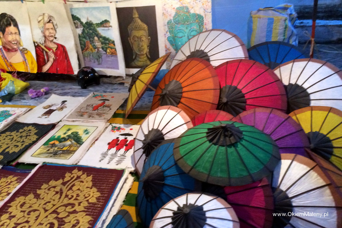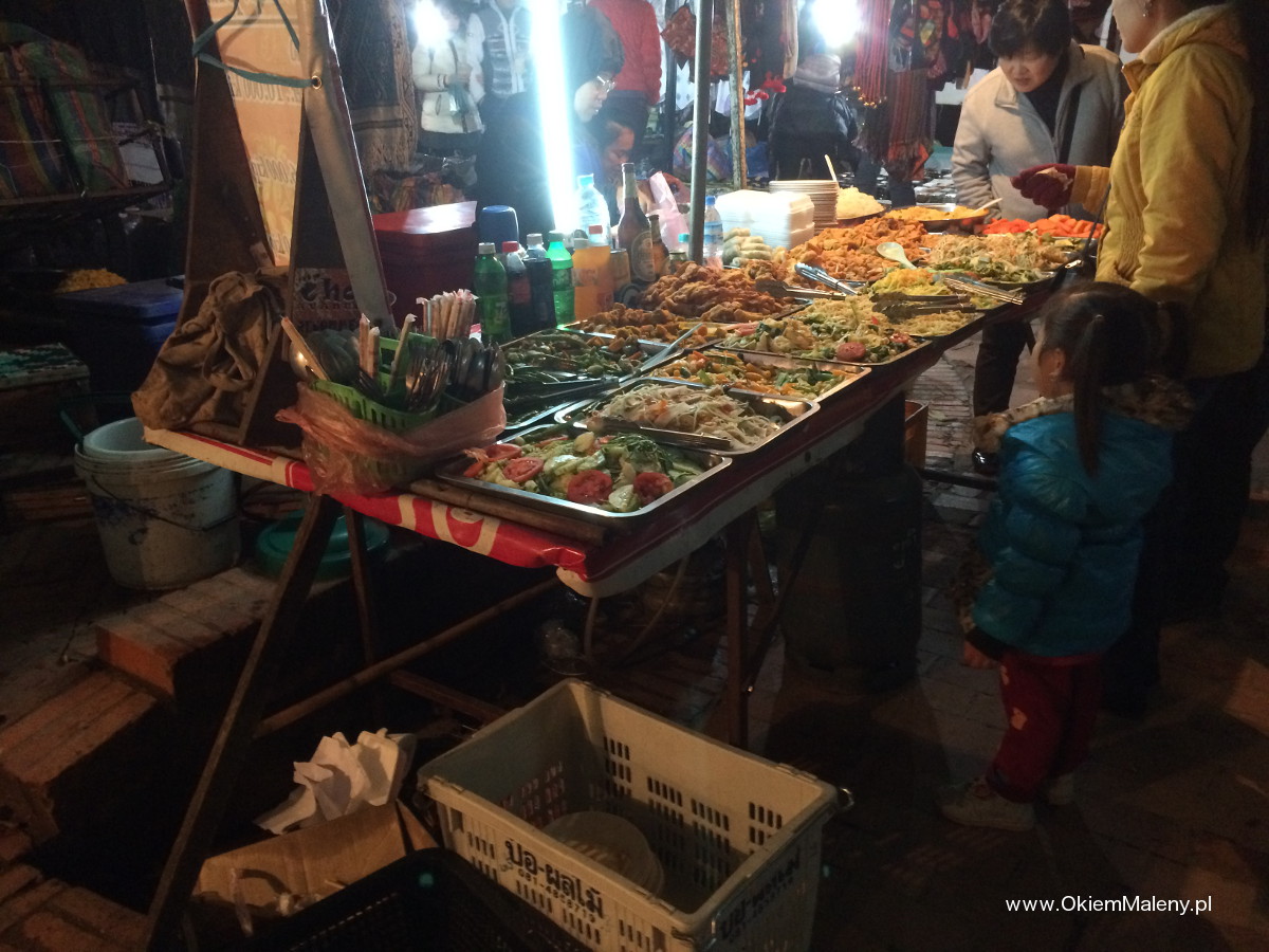 Około 18 główna ulica zamienia się w nocny market. Jeśli planujecie gdzieś kupić pamiątki to jest dobre miejsce. Znajdziecie tam wszystko czego dusza zapragnie i jeszcze więcej 😉 Figurki, przyprawy, herbaty, ubrania, ozdoby. A jeśli w końcu zgłodniejecie, a przejadły Wam się już słynne bagietki, to jak dobrze poszukacie można się najeść po uszy za około 1,5 $. Night Market w deszczu przypominał trochę jakąś dziwną grę. Koło 18 na ulicy zaczynało się rozkładanie straganów, chwilę później wiatr się zmagał i szarpał wszystkim. Dwie chwile później zaczynało kropić, ale wszyscy udawali, że wszystko jest ok. Turyści chodzili między pamiątkami owinięci w co kto miał, Laotańczycy starali się chronić swoje skarby od wiatru i deszczu, owinięci jak tylko się dało. Tylko japonki na ich stopach zdradzały, że w tym miejscu powinno być teraz naprawdę ciepło. Jakiś czas potem deszcz kończył zabawę i zaczynał lać niemiłosiernie, i wtedy robiło się wesoło. Sprzedawcy w tempie przyspieszonym składali stragany, a turyści skakali od namiotu do namiotu, aby choć na sekundę schronić się przed ulewą. W sumie trudno powiedzieć czemu skakali, bo deszcz zacinał równo, przechodzić nie miał zamiaru i to schronienie dawało tylko iluzoryczne poczucie ochrony.