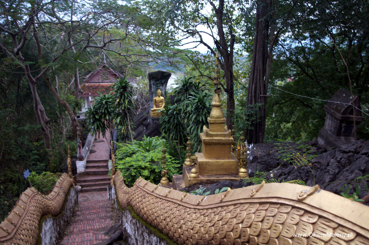 Wzgórze z niezliczoną ilością złotych posągów Buddy. Wierzchołek wzgórza wieńczy złota stupa Wat Chomsi z 1804 roku. Wdrapać się trzeba 150 m nad poziom miasta, po wielu schodach, ale warto. Dobry punkt aby zobaczyć jak na dłoni całe Luang Prabang, obserwować okoliczne wzgórza i leniwe meandry Mekongu. Napewno jest to dobre miejsce aby podziwiać zachód Słońca. W zimne dni szczególnie polecane aby się rozgrzać marszem pod górę, w ciepłe dni warto wyposażyć się w butelkę wody, lub i dwie.