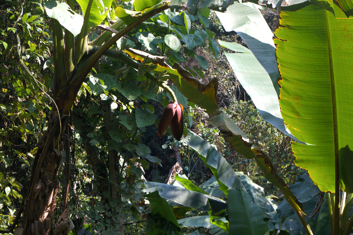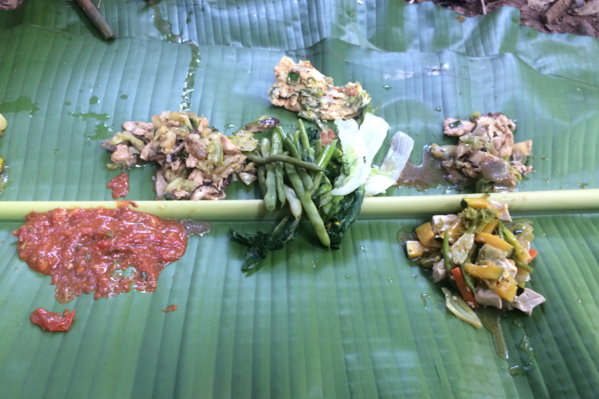 Nim się spostrzegłyśmy przyszła pora na lunch. Z czego można zrobić stół w środku dżungli? Z liścia bananowca. Położony na ziemi i idealnie sprawdził się w tej roli. Praktycznie to w dwóch rolach, bo był stołem i obrusem w jednej osobie 😉