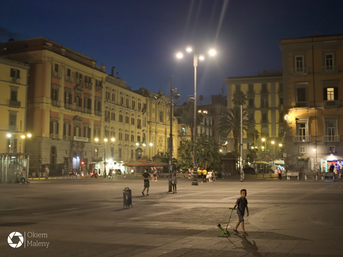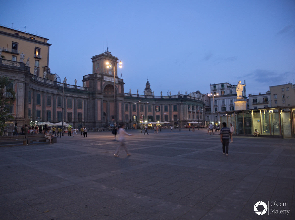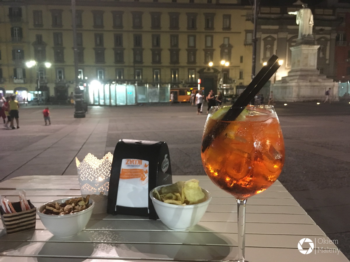 A jak wygląda wieczorny Neapol? Jeśli znajdziecie hotel tuż przy placyku z knajpkami będziecie mieli okazje go zaobserwować. Co wieczór siedziałyśmy do około 23 na piazza Dante. Z żalem co wieczór go opuszczałyśmy. Życie tam toczyło się conajmniej do północy. Małe dziewczynki jeździły na miniaturowych skuterach, chłopcy grali w piłkę, ktoś spacerował z psem, ktoś rozmawiał, przychodzili tancerze wraz z własną orkiestrą i trenowali, następnego dnia była zmiana zamiast tancerzy pojawiała się grupa capoeiry, pełno ludzi siedziało w knajpkach i powoli popijało Aperol Spritz, kelner czasem podłączał się na chwilę do gry w piłkę. Wszystko to pod okiem patrolu wojskowego, a właściwie dwóch. Czasem przyjeżdżał trzeci patrol wojskowy, tym razem nie z misją strzeżenia placu, tylko aby dowieźć jedzenie 2 pozostałym.