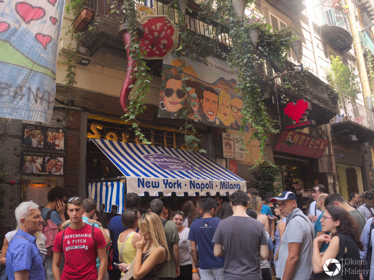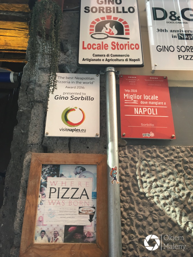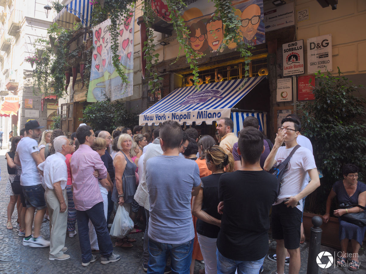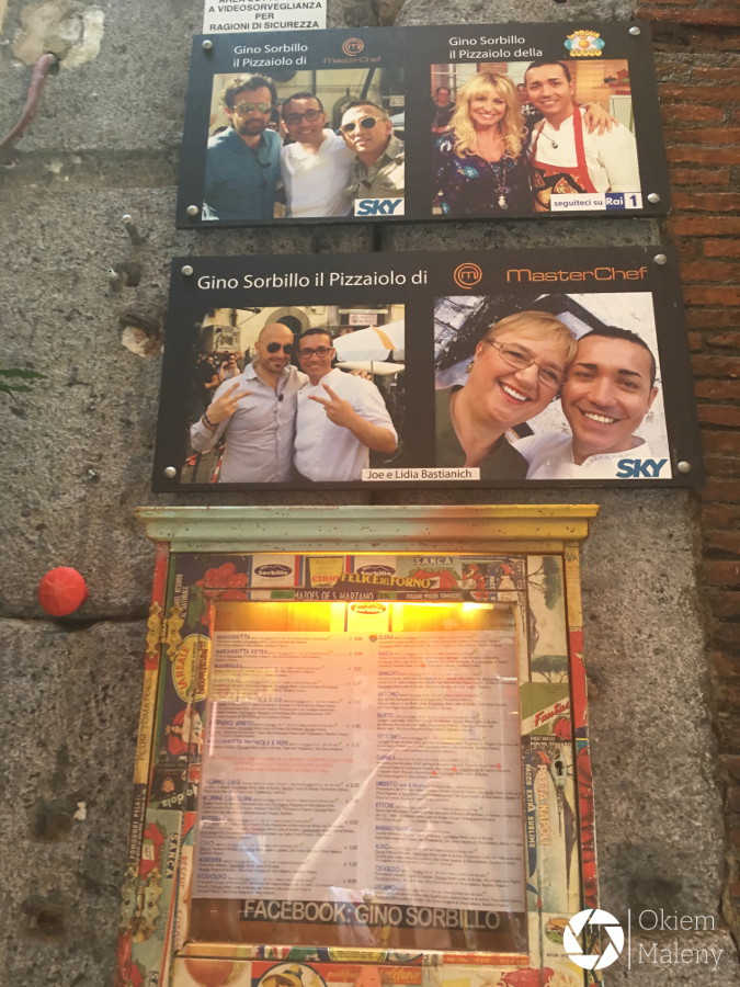 Przy okazji warto wspomnieć, że Gino Sorbillo, mimo że jest uważana za najlepszą pizzerię w Neapolu i wcale nie ma wygórowanych cen. Cena pizzy oscyluje między 5 a 10 euro. Pizzeria otwierana jest o 12.00 na kilka godzin. Potem jest przerwa i otwiera się ją ponownie o 19:00. Dobrze być około pół godziny przed otwarciem by mieć szansę na stolik. Nim drzwi się otworzą i goście zostaną wpuszczeni do środka pojawia się kelner, który tłumaczy, w której sali są stoliki na ile osób. Gdy już wiadomo czy pójść na lewo, czy na prawo można wejść. Nie liczcie na kelnerów, którzy będą stali i czekali, aż się zdecydujecie lub długo Wam doradzali. Oni uwijają się jak mróweczki w tym tłumie i nie mają czasu na dopieszczanie klientów 😉