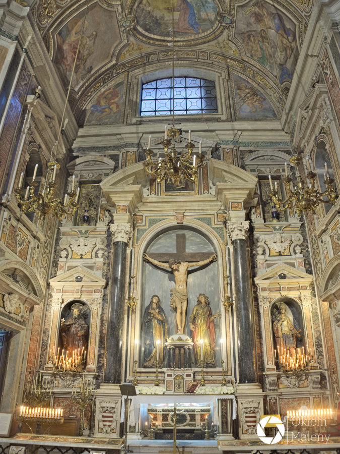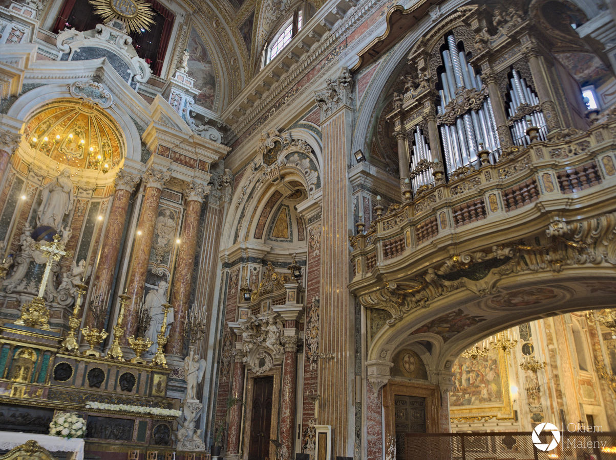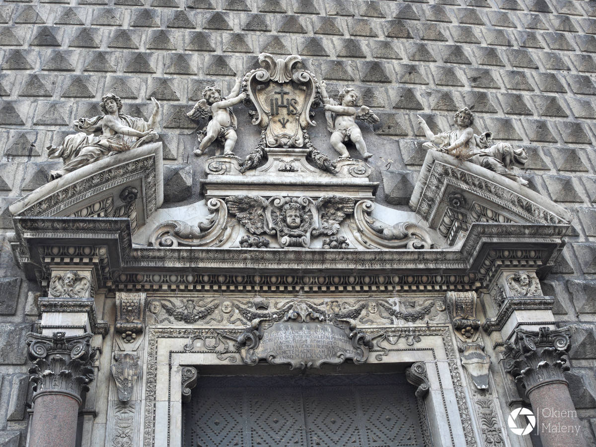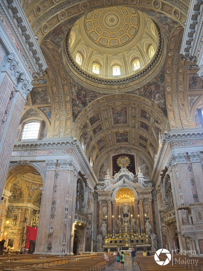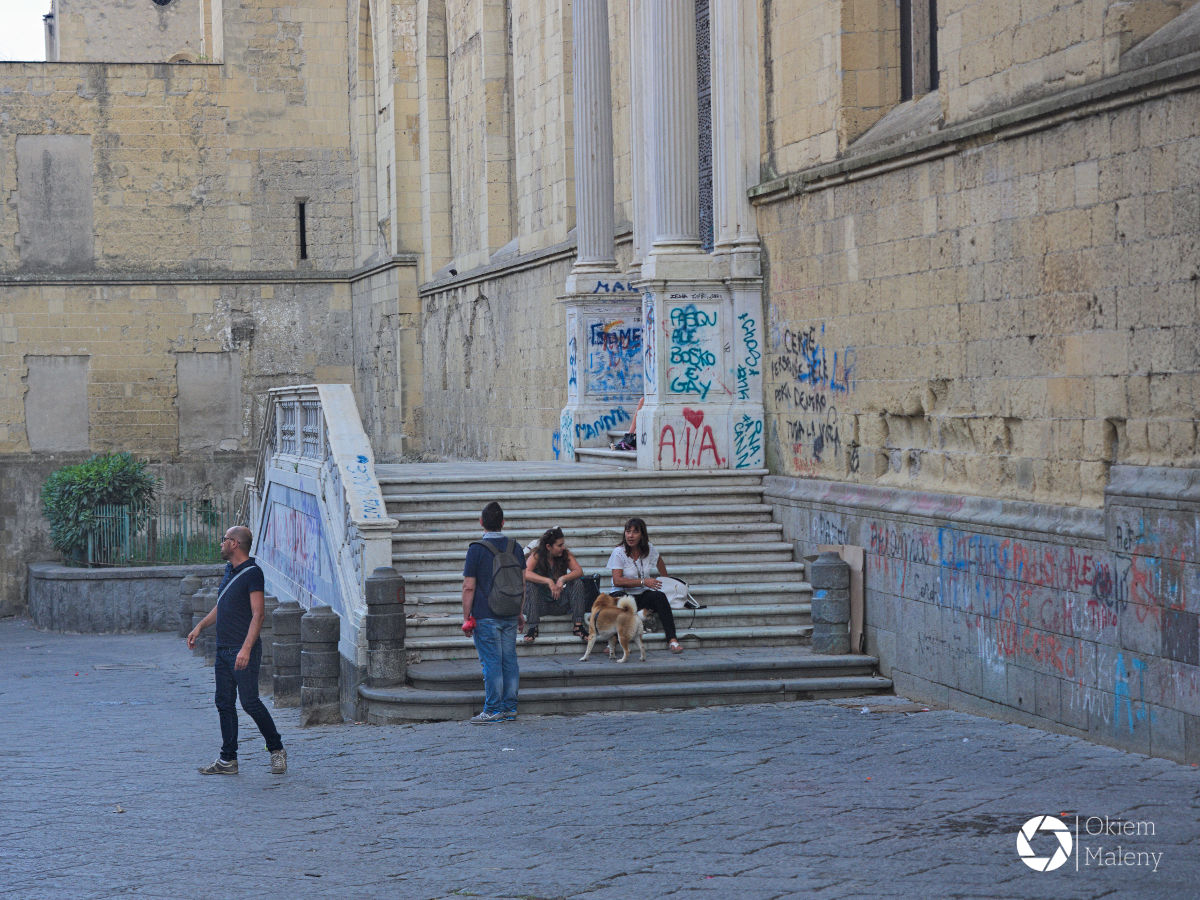 Nieopodal Santa Chiara, na placyku Piazza del Gesu Nouvo znajduje się inny, cudowny kościół – Gesu Nuovo. Z zewnątrz niepozorny, jednak wnętrze zachwyca. Pochodzi z XVI wieku i kiedyś stanowił część pałacu. Zdążyłyśmy tuż przed zamknięciem. Pan z kluczami i dzwonkami głośno nimi potrząsał i obwieszczał czas końca odwiedzin. Gdy nas spostrzegł podbiegł do nas i oznajmił, że jesteśmy niczym kwiaty w ogrodzie. To jest właśnie ten niepowtarzalny urok i spontaniczność Włochów. Ich zaczepki, entuzjazm i szczerość rozbrajają. Tego tak bardzo brakuje w naszym zimnym, północnym kraju. Szczególnie jak porówna się jakość zaczepek na ulicy …