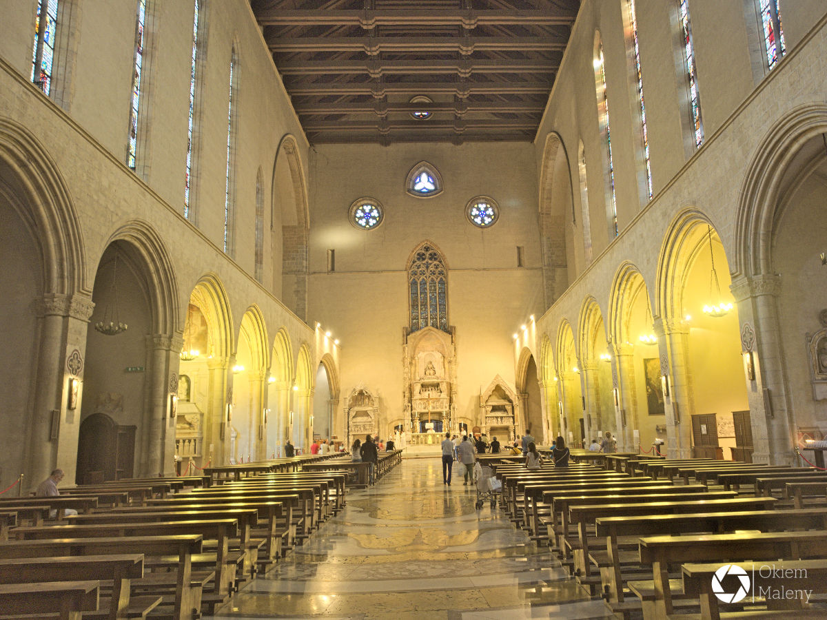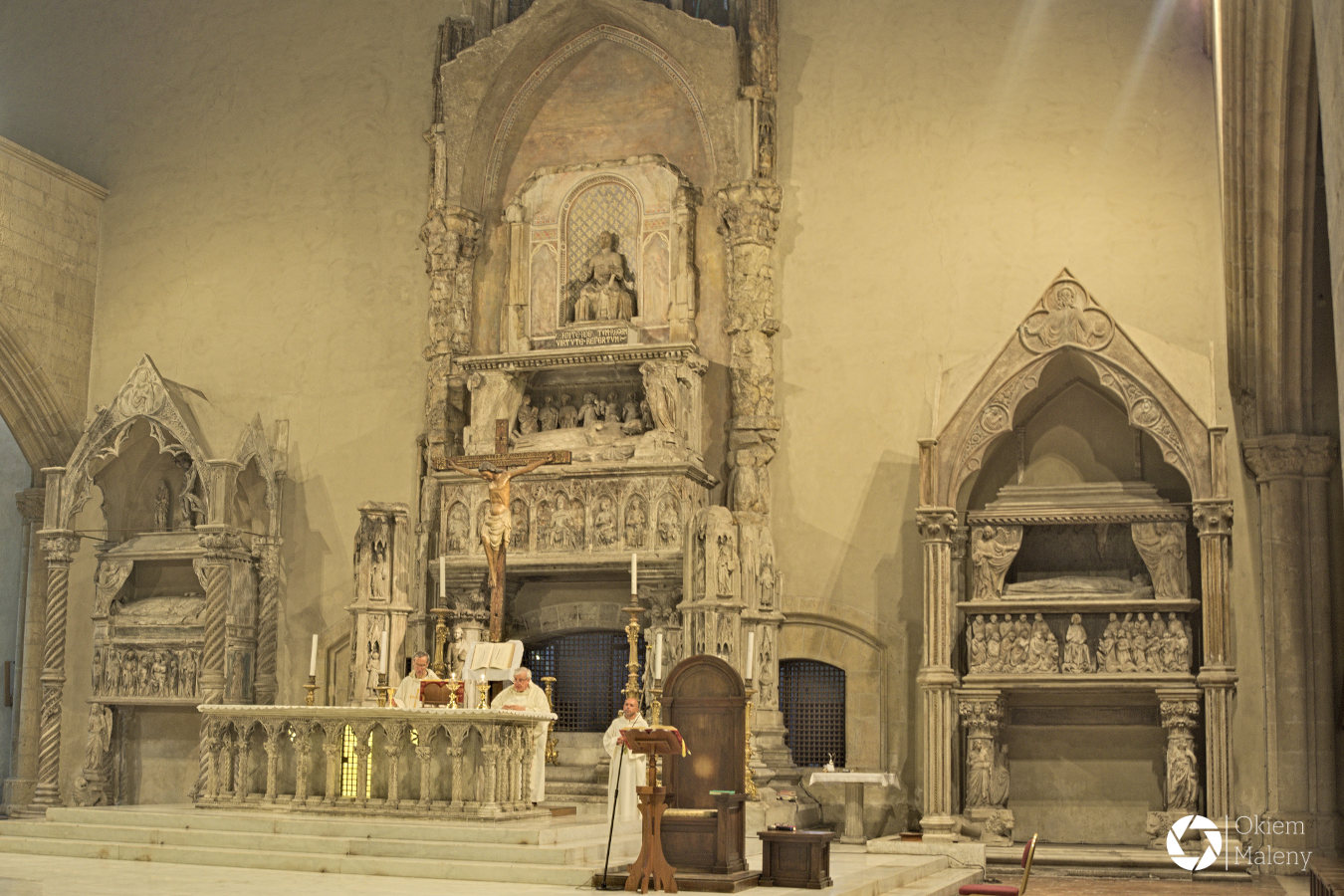 Pamiętam zaskoczenie gdy przekroczyłam bramy monasteru Santa Chiara. Na dziedzińcu dzieci grały w piłkę nożną, z boku znajdował się wybieg dla psów. Boczna elewacja kościoła pokryta była graffiti. Na schodach siedzili ludzie, coś jedli, rozmawiali, sprawdzali wiadomości na smartfonach. Trochę przypomniało mi to klimat buddyjskich świątyń w Birmie, których dziedzińce są pełne gwaru i życia. Po przekroczeniu kościelnych wrót znalałam się w innym świecie. Trwała msza. Wnętrze kościoła zachwycało surowością i spokojem. Wykonane jest w stylu gotyku prowansalskiego i pochodzi z XIV wieku.