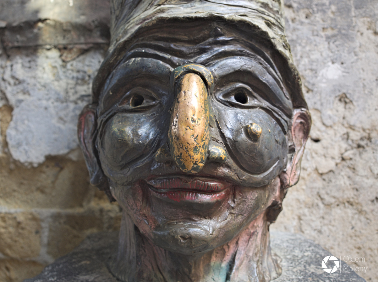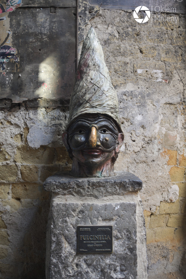 Niedaleko sklepiku z pamiątkami, w bocznej uliczce jest figurka Pulcinelli. Pulcinella to typowej neapolitańska maska. Pulcinella ma wielki nos, ciemną maskę przykrywającą oczy i zawsze jest w długiej czapce. Jest symbolem miasta. Łączy w sobie właściwą Neapolitańczykom chęć życia i pokonywania przeszkód, niezależnie od tego, jak ciężkie byłby warunki (źródło: Marta Sterna: Teorie pochodzenia Pulcinella). Nie jest to postać, którą możemy jasno zdefiniować jako dobrą lub złą. Jak opowiadał podsłuchany przewodnik – Pulcinella odzwierciedla uczucia mieszkańców miasta do Neapolu, którzy jednakowo kochają go i nienawidzą, ale zawsze są dumni, że są Neapolitańczykami. Jeśli jesteście ciekawi naukowej opinii o Pulcinelli kliknijcie w link powyżej.
