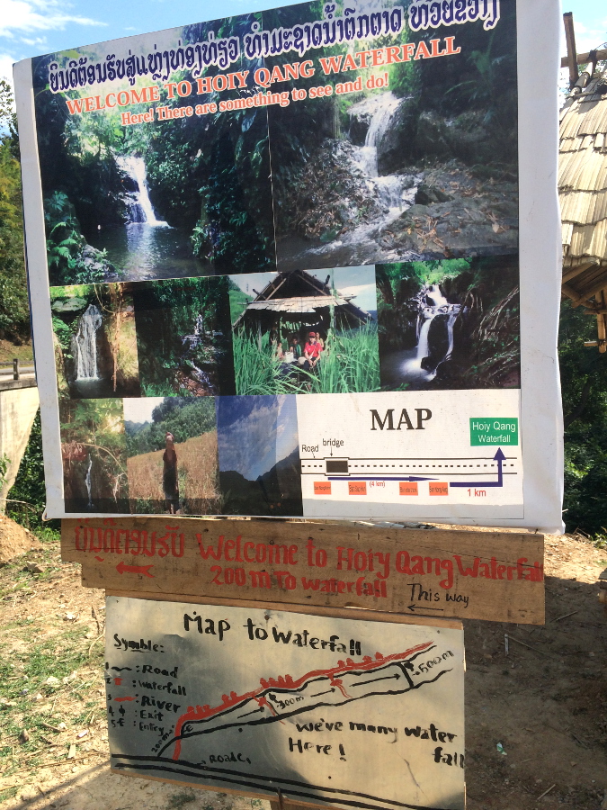 Kolejny przystanek to wodospady Hoiy Qang. Od jaskiń dzieli je kolejne 5 km drogi. Podobno jest ich 5. My znalazłyśmy dwa. Zwiedzałyśmy je trochę w biegu, bo czas nas gonił. Było już po 14, a my musiałyśmy obejrzeć wodospady, wrócić do Nong Khiaw – około 10 km i wspiąć się kilkaset metrów na punkt widokowy 🙂