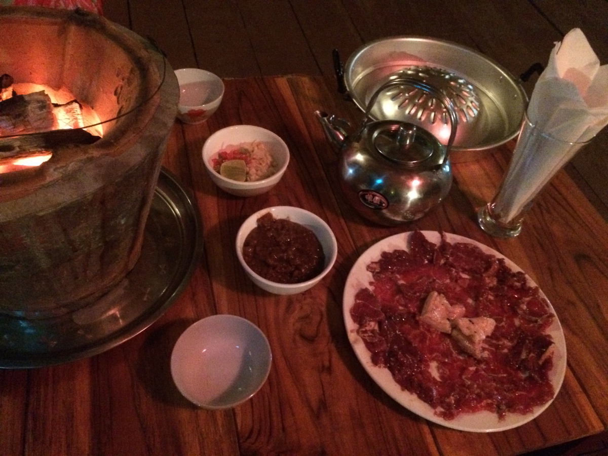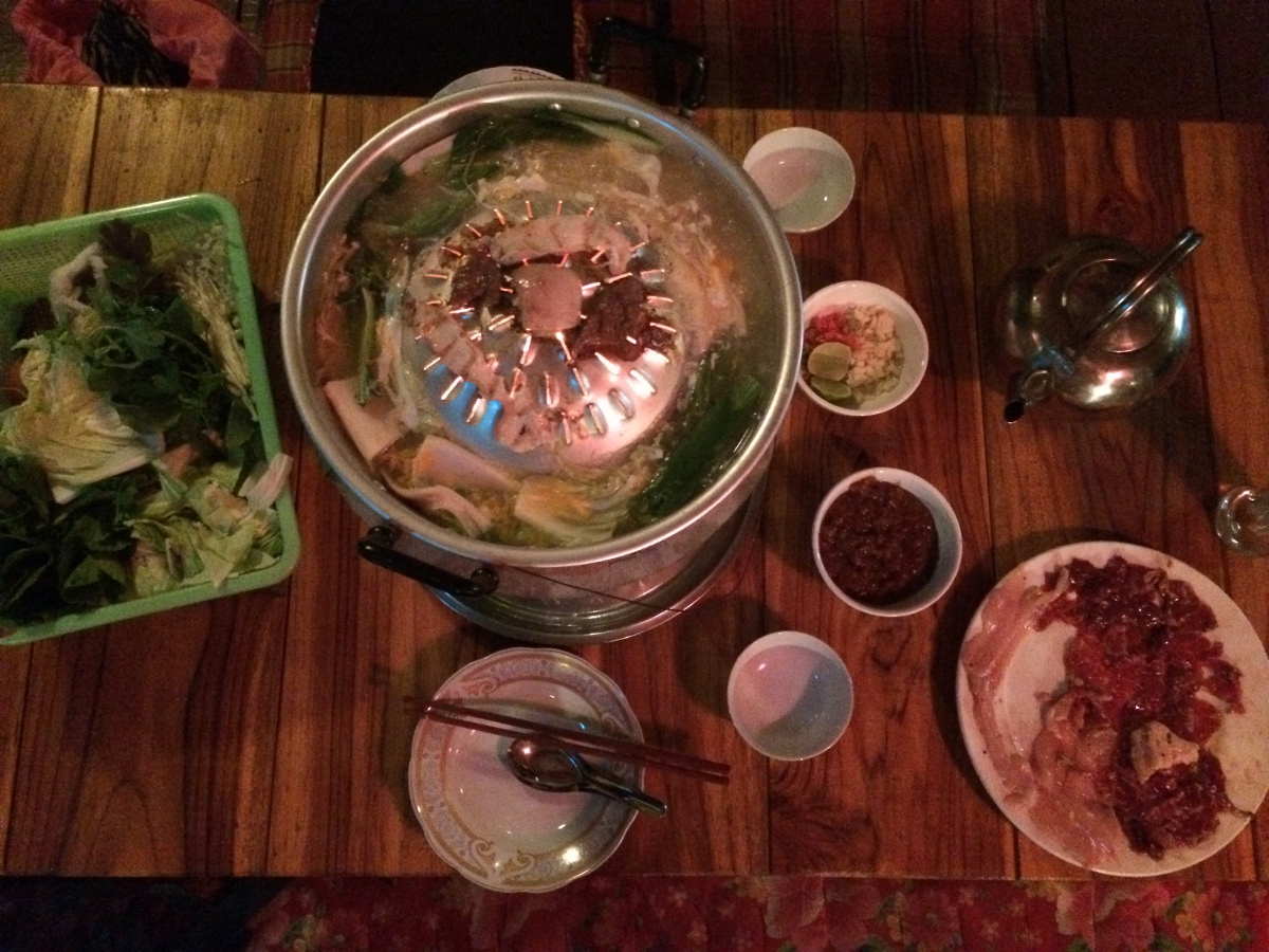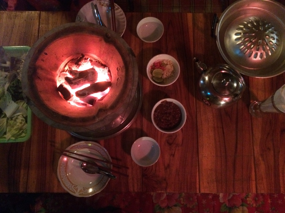Po całodniowym ściganiu się z czasem czekała nas zasłużona nagroda. Już dzień wcześniej zaplanowałyśmy tą kolacją. Laotańskie Barbecue w Qbar. Dwuosobowy zestaw kosztuje 100.000 kip (12,5$), ale naprawdę warto. Laotańskie barbecue przygotowujecie sami. Dostajecie na stół „palenisko”, surowe warzywa, grzyby, mięso, jajka, makaron, bulion i potem trzeba połączyć puzzle:) Najpierw wierzch specjalnej przykrywki paleniska smarujecie słoniną, na „cypel” kładziecie mięso, do rynienki wokół wlewacie bulion i wkładacie warzywa, grzyby, makaron. Jajko przebija się zdecydowanym ruchem pałeczki i polewa się nim to co w rynience się gotuje. I tak można spędzić dużo czasu gotując, piekąc, jedząc.