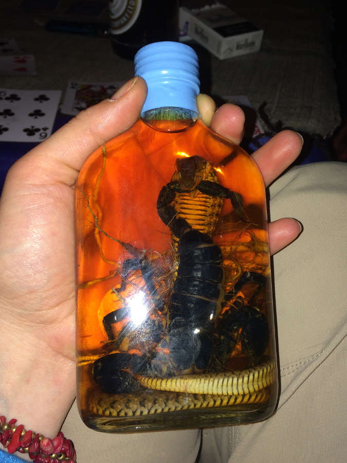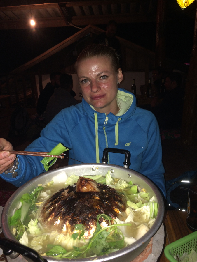 W Qbarze kelnerami było dwóch Francuzów. Twierdzili, ze jesteśmy pierwszymi ich gośćmi z Polski. W to nie do końca wierzę, ale ich gościnność była niesamowita. Skończyła się też bardzoooo trudnym porankiem skoro świt dnia następnego 😉 Tym bardziej, że przy stoliku obok urodziny świętowała grupka Francuzów. Opisu miksu tego wieczoru Wam oszczędzę, bo na jego wspomnienie do tej pory mój żołądek mówi głośne NIE! w skrócie oprócz Lao Lao, Lao beer, Lao-cokolwiek spróbowałam też Lao whisky ze żmiją i skorpionem w środku. Oj niedobre. Ma lekko słodkawy posmak, taki mdławy. Nie wiem ile nakrętek tego specyfiku wypiłam, ale zdecydowanie za dużo. Przypominały mi o sobie cały następny dzień. Pobudka była po 6, szybkie pakowanie i bieg 2 km z plecakiem-potworem na stację autobusową. Taka poranna gimnastyka w sam raz na kaca 😉