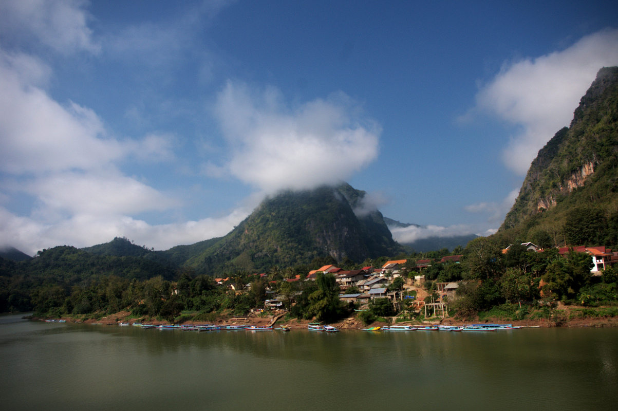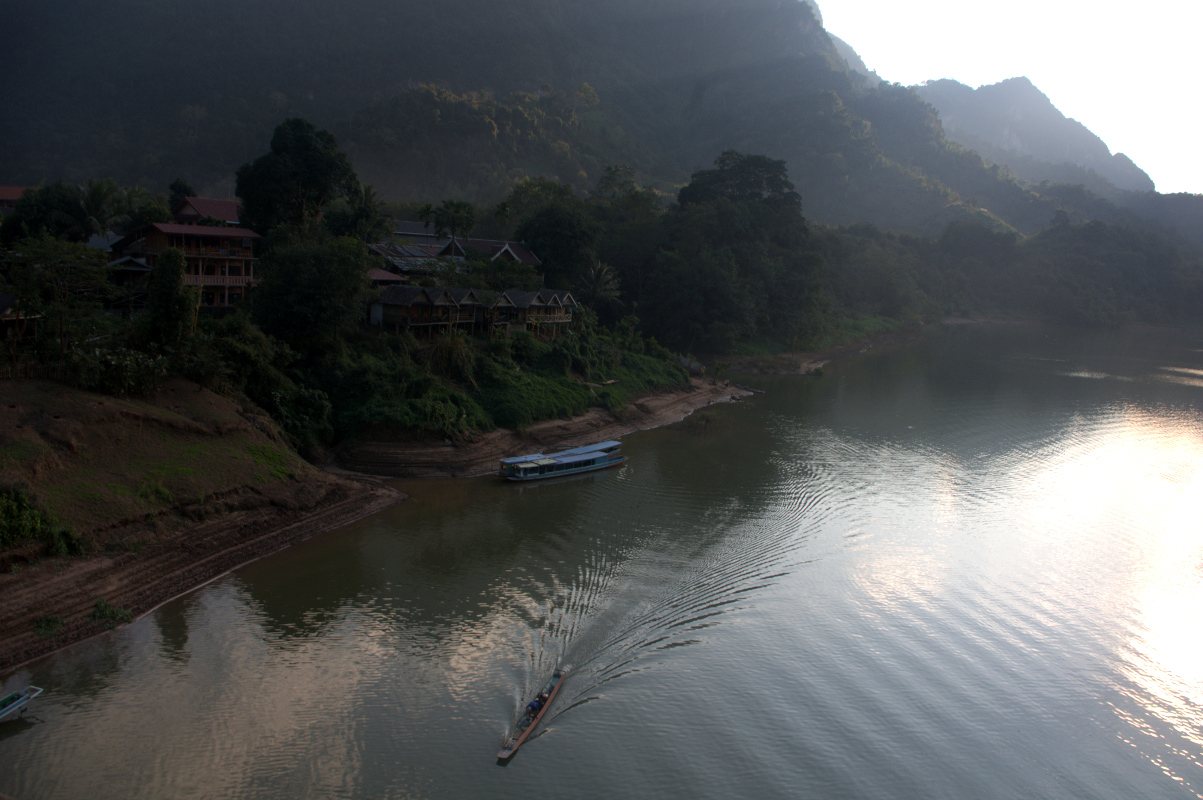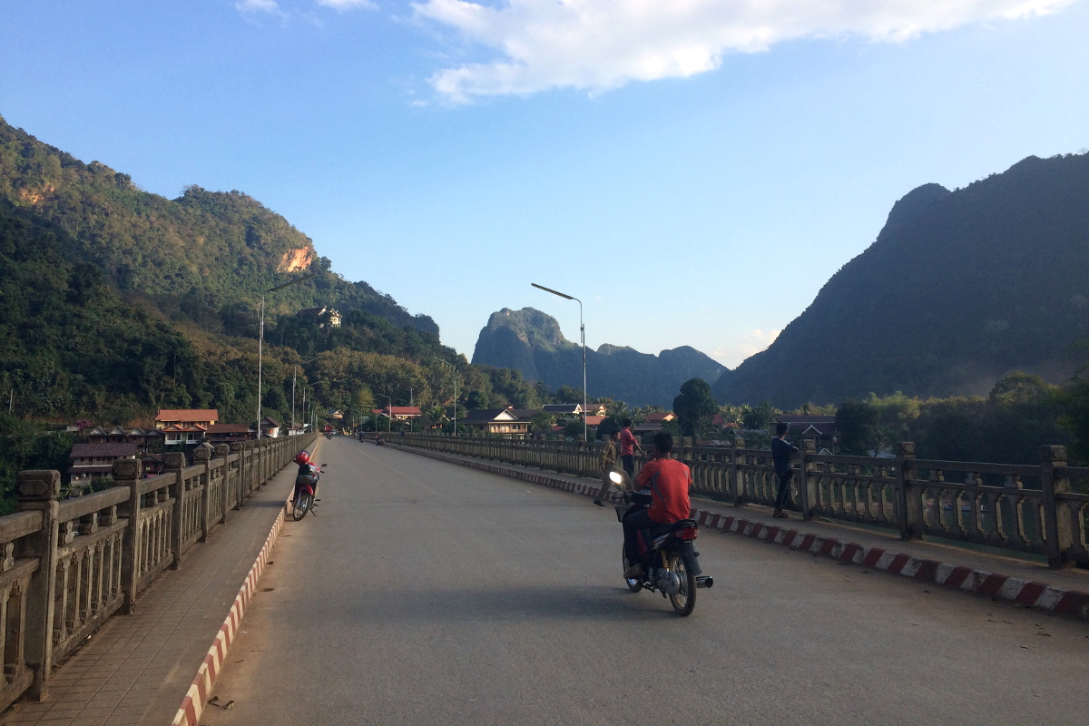 Mini Van podwozi nas tuż pod główny punkt Nong Khiaw czyli most przez rzekę Nam Ou. Widok zapiera dech w piersiach. Jest po prostu niewypowiedzianie pięknie. Wysokie góry, malutka miejscowość, spokojnie płynąca rzeka. Na chwilę zapominam o gorączce, ale ona daje się we znaki w czasie poszukiwania noclegu.