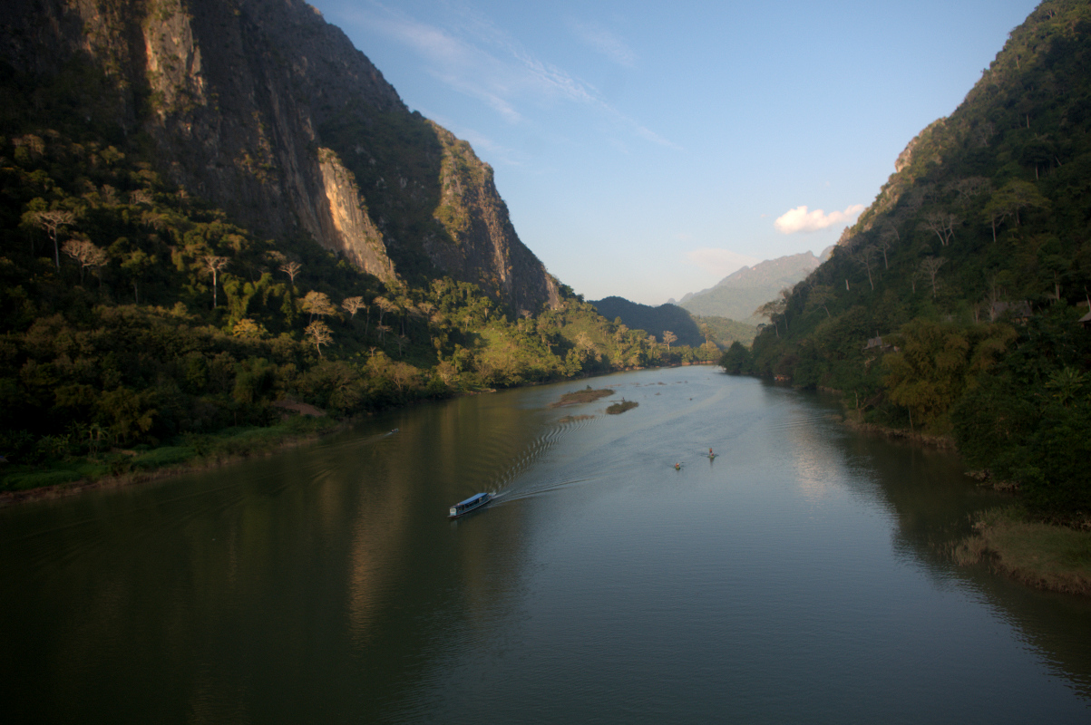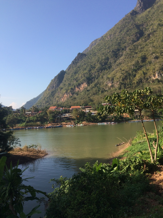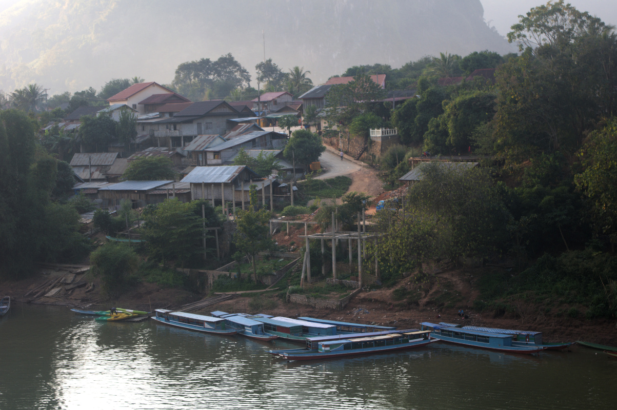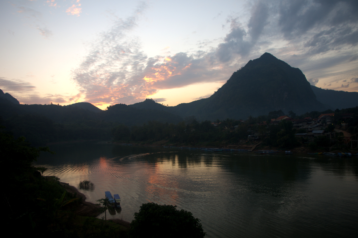 Mini Van podwozi nas tuż pod główny punkt Nong Khiaw czyli most przez rzekę Nam Ou. Widok zapiera dech w piersiach. Jest po prostu niewypowiedzianie pięknie. Wysokie góry, malutka miejscowość, spokojnie płynąca rzeka. Na chwilę zapominam o gorączce, ale ona daje się we znaki w czasie poszukiwania noclegu.