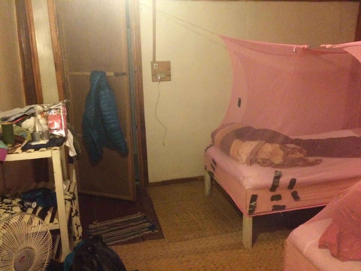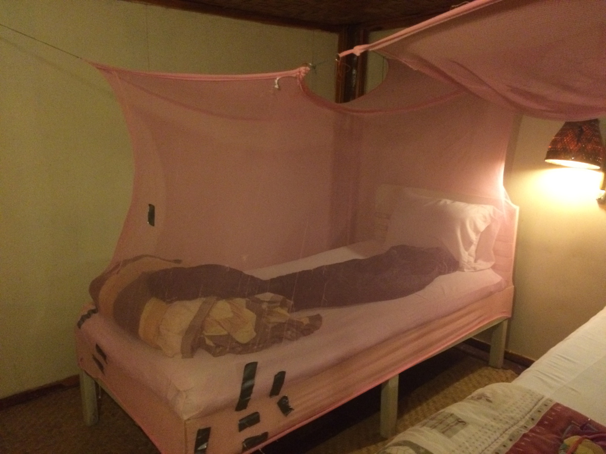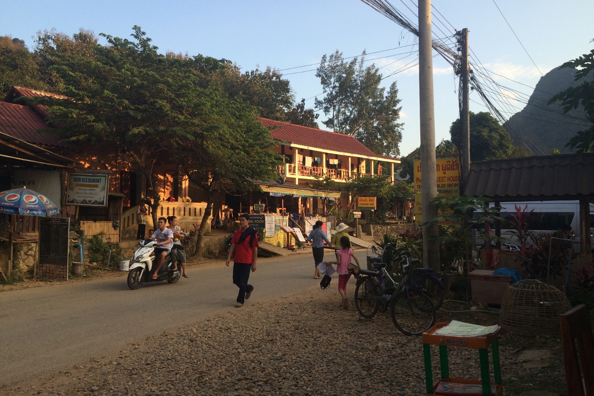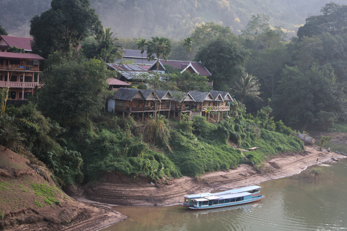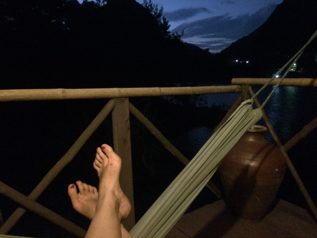 Cel jest jeden – z widokiem na rzekę no i tanio. Początkowo ceny pokoi są astronomiczne, wreszcie znajdujemy mały domek tuż przy rzece w Bamboo Paradise Guest House. Cena 100.000 kip (1$ = 8.000 kip). To jest to. Ciepła kąpiel stawia na nogi. Rozglądam się po pokoju. Bardzo, bardzo prosty. Oprócz nas zamieszkiwała go też jaszczurka, mrówki i ślimak, próbował zadomowić się też karaluch, ale przepłacił to życiem. Duct tape okazała się zdecydowanie przydatna. Po pierwsze można było do niej przykleić trupa karalucha, by go nie dotykać. Po drugie służyła do mocowania rozgałęziacza, trzeba było wyważyć odpowiedni kąt, aby z gniazdka płynął prąd i potem chodzić na placach, aby broń boże nie poruszyć konstrukcji. Po trzecie załatałam nią moskitierę, której oczka chronić mogły co najwyżej przed myszami. Zakleiłam też kilka dziur w podłodze i suficie, co by większe zwierzęta się do nas tak łatwo nie dostawały. Wtedy jeszcze nie zauważyłam, że w łazience jest ażurowa przestrzeń między dachem, a końcem ściany. Widok z tarasu rekompensował wszelkie niewygody. Choć podejrzewam, że w sumie czas spędzony na tarasie wyniósł może około godziny 😉