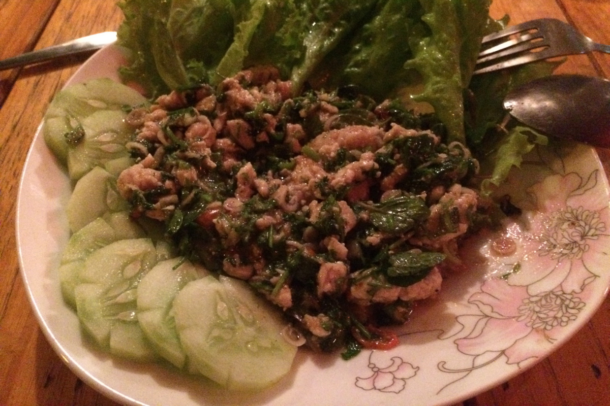 Resztę wieczoru spędziłyśmy w Qbar. Bardzo miła restauracyjka.O jej specialite de la maison – Lao barbecue następnym razem. Tym razem jak zwykle jadłam Larba. Galangal i czosnek obecne w tej potrawie idealnie wpisywały się w dzień spod znaku – leczymy się ekspresowo czym popadnie wliczając w to liczne prośby niesione do wszelkich istniejących bóstw. Dodatkowo grzecznie zamieniłam Lao Beer na Lao Tea. Przed snem zażyłam po raz kolejny ibuprom.