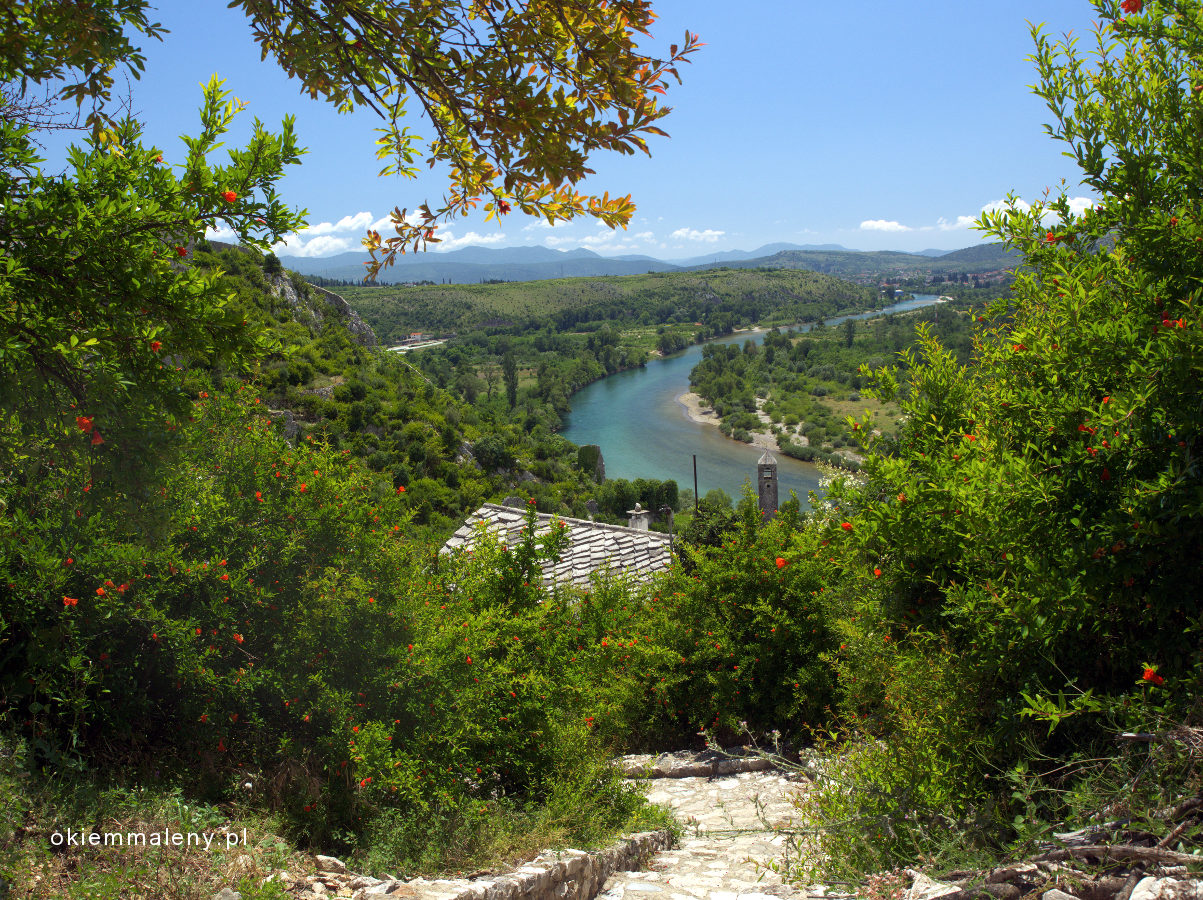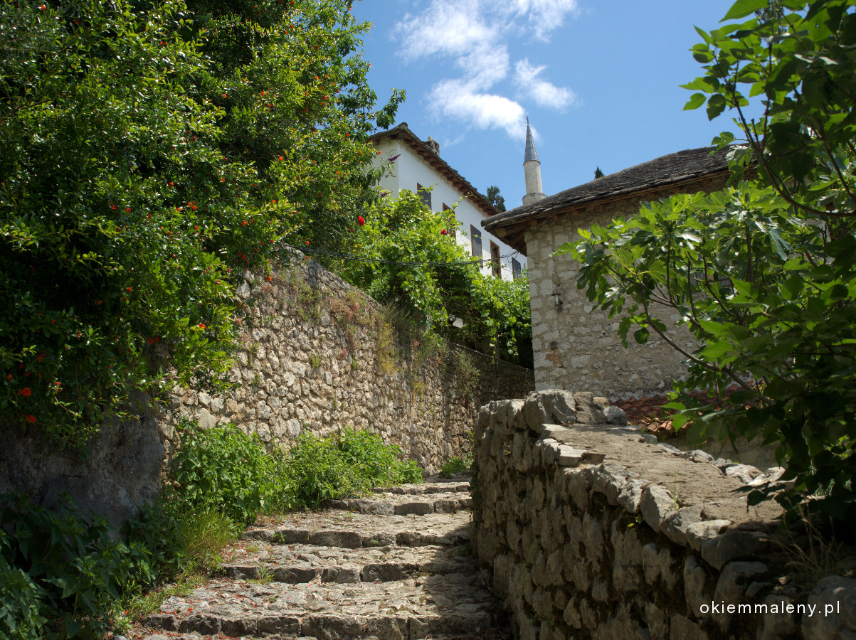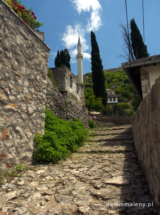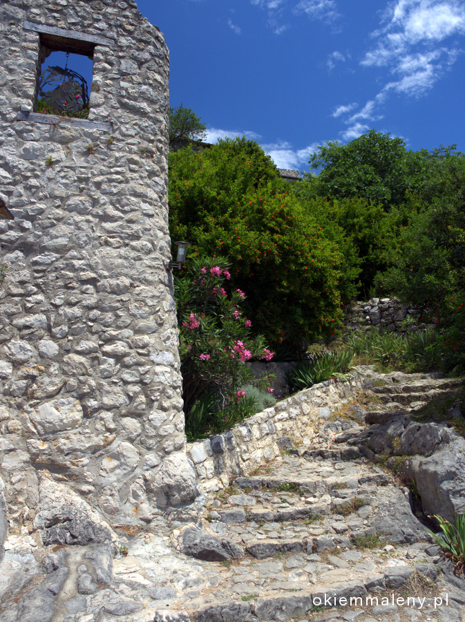 Dalsze zwiedzanie Pocitalja to spacero-wspinaczka sennymi, wąskimi, kamiennymi ulicami miasta. Kamienne schody otoczone są zielenią, wokół rosną agawy, figi, granaty. Szelest w suchej trawie przypomniał mi stary nawyk z Czarnogóry – pazi gdje gaziš – uważaj gdzie stąpasz. W tym regionie lepiej patrzeć pod nogi, aby niechcący nie nadepnąć na wygrzewającą się w Słońcu jaszczurkę lub co gorsza na żmiję. Obchód miasta zajmuje około godzinę. Przez wiekszą część czasu nie spotkałam żywego ducha. W samym starym mieście żyje podobno około 40 osób, w większości emeryci. Na niżej położonych ulicach jest kilka straganów z pamiątkami. Jeśli kolekcjonujecie magnesy w Pocitelju znajdziecie oryginalne, ręcznie malowane, kamienne magnesy.