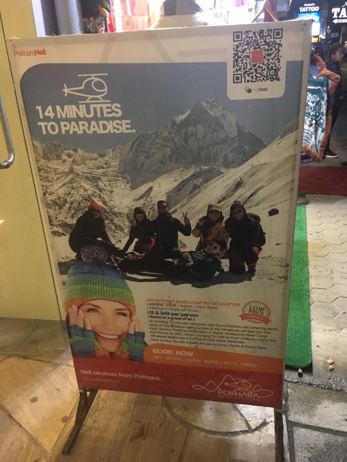 Jeśli panoramę Himalajów przysłoniły chmury, a macie akurat wolną godzinkę i kilkaset dolarów na zbyciu, to mam dobrą wiadomość – nic straconego za chwil parę zobaczycie piękne góry. A tak całkiem na poważnie to w Pokharze można wykupić wycieczkę helikopterem do Annapurna Base Camp.