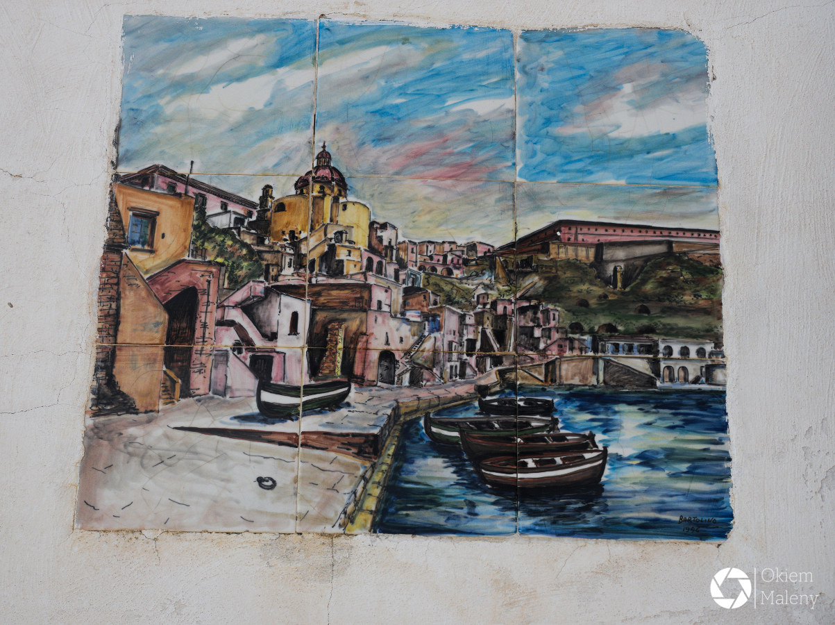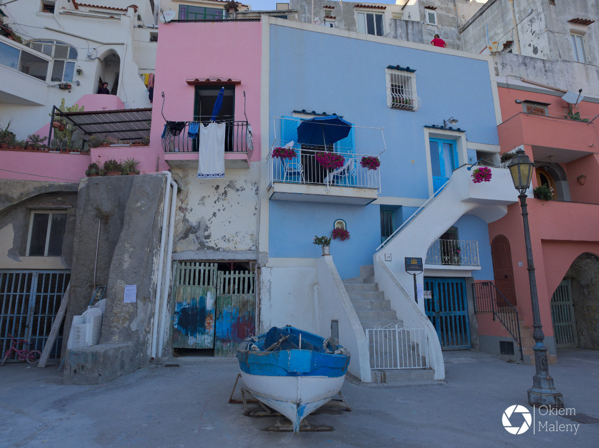Via Liberta pnie się w górę. Po drodze mijamy śliczne willowe budynki, z coraz ciekawszej perspektywy widać morze. W ogrodach można podziwiać agawy, pomarańcze, cytryny oraz liczne kaktusy, których nazw nawet nie znam. Tabliczki adresowe przeważnie są ceramiczne, czasem ozdabia je jakaś mozaika. Droga jest malownicza. Cała wyspa mieni się kolorami znanymi z jej najsłynniejszego miejsca: Marina di Corricella. Po chwili docieramy do niewielkiego placyku (tam się łapie bajkowe autobusy w drogę powrotną) jeszcze tylko kilkaset metrów wąską ulicą i będziemy u celu. Między budynkami schnie pranie, mija nas skuter, ktoś nawołuje w oddali, w oddali stragan pełen winogron, cytryn, fig, kwiatów cukinii. Od pierwszej chwili można wtopić się w upalny, lekko senny, a jednak bardzo energetyczny klimat południa.